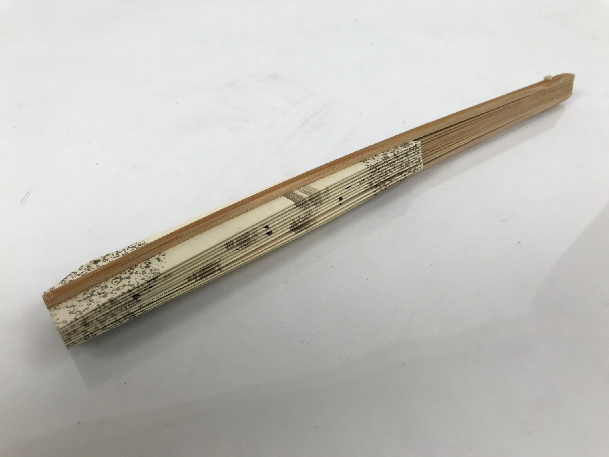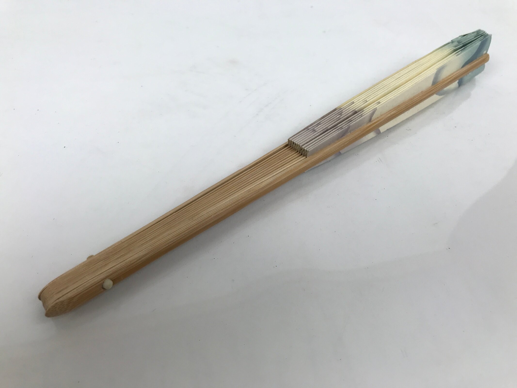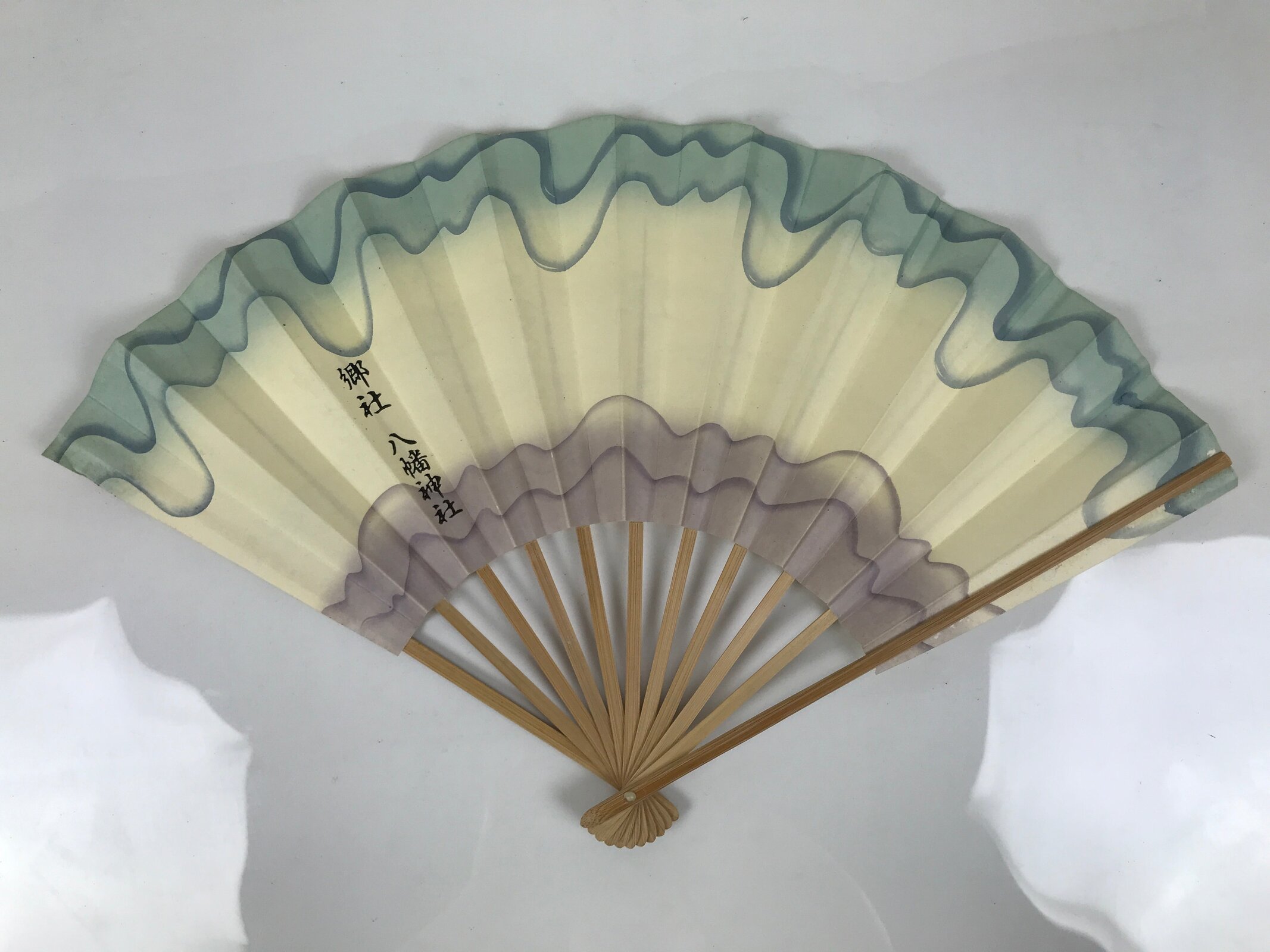 This is a traditional Japanese folding fan called sensu. You can use this when it’s hot or as decoration. This fan is made with a natural bamboo frame and a thick, durable paper. It features calligraphy on the front, and blue and purple waves on the back. It comes from a shrine named Hachiman, the precise location is unknown.