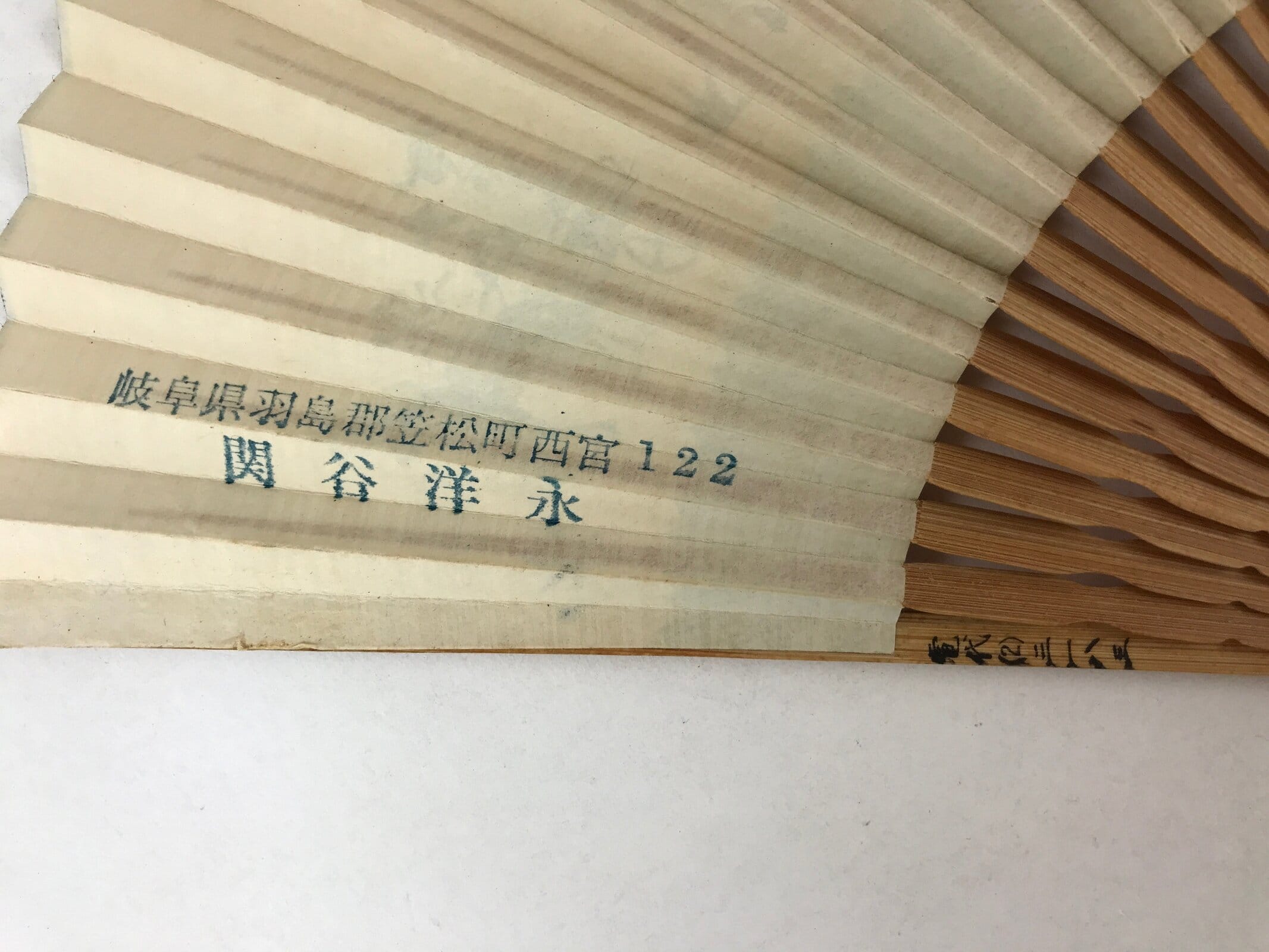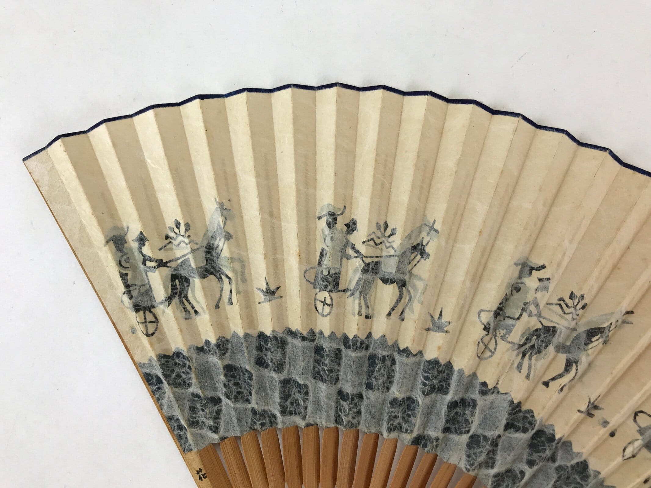 This is a traditional Japanese folding fan called sensu. You can use this when it’s hot or as decoration. This decorative fan is made of paper. It has a design with blue horses and people on the front. The back is blank but was stamped with an address and a name. The frame is made of natural bamboo. There is a name handwritten on the front of the bamboo frame and an address on the back.