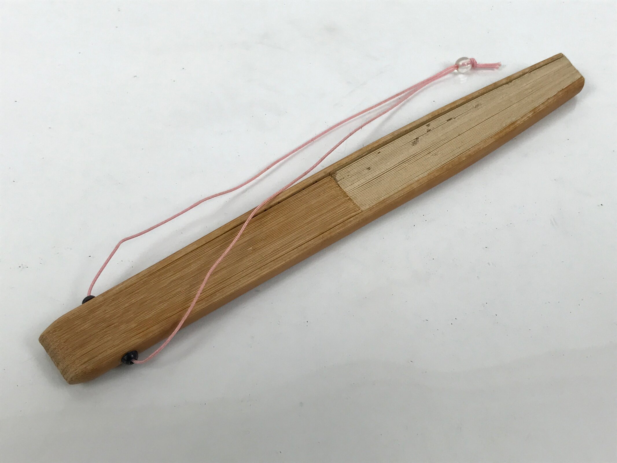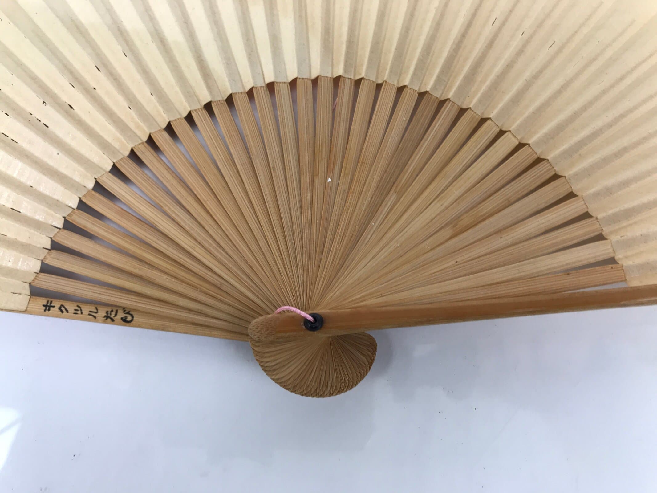 This is a traditional Japanese folding fan called sensu. You can use this when it’s hot or as decoration. This fan is made with a natural bamboo frame. The front side is mostly a shimmering beige color with a light pink and gold accent design. The back side is plain beige. There is a pink string attached to the bottom with a clear glass bead.