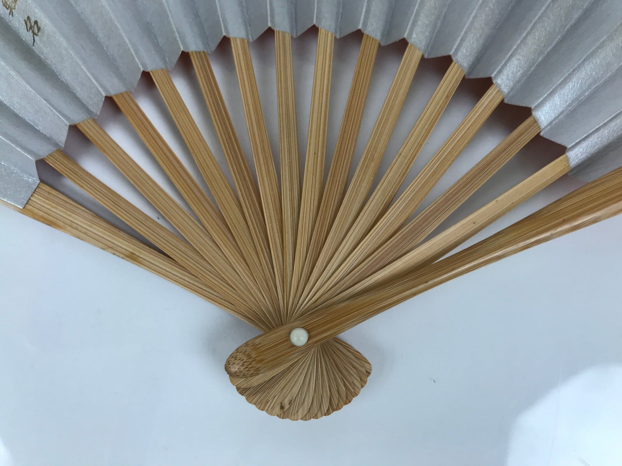 This is a traditional Japanese folding fan called sensu. You can use this when it’s hot or as decoration. This fan is made with a natural bamboo frame and washi paper. The front side is a muted red color with no added designs, while the back side is silver with some kanji characters. The bamboo end pieces on the frame have a gold diamond-shaped design.