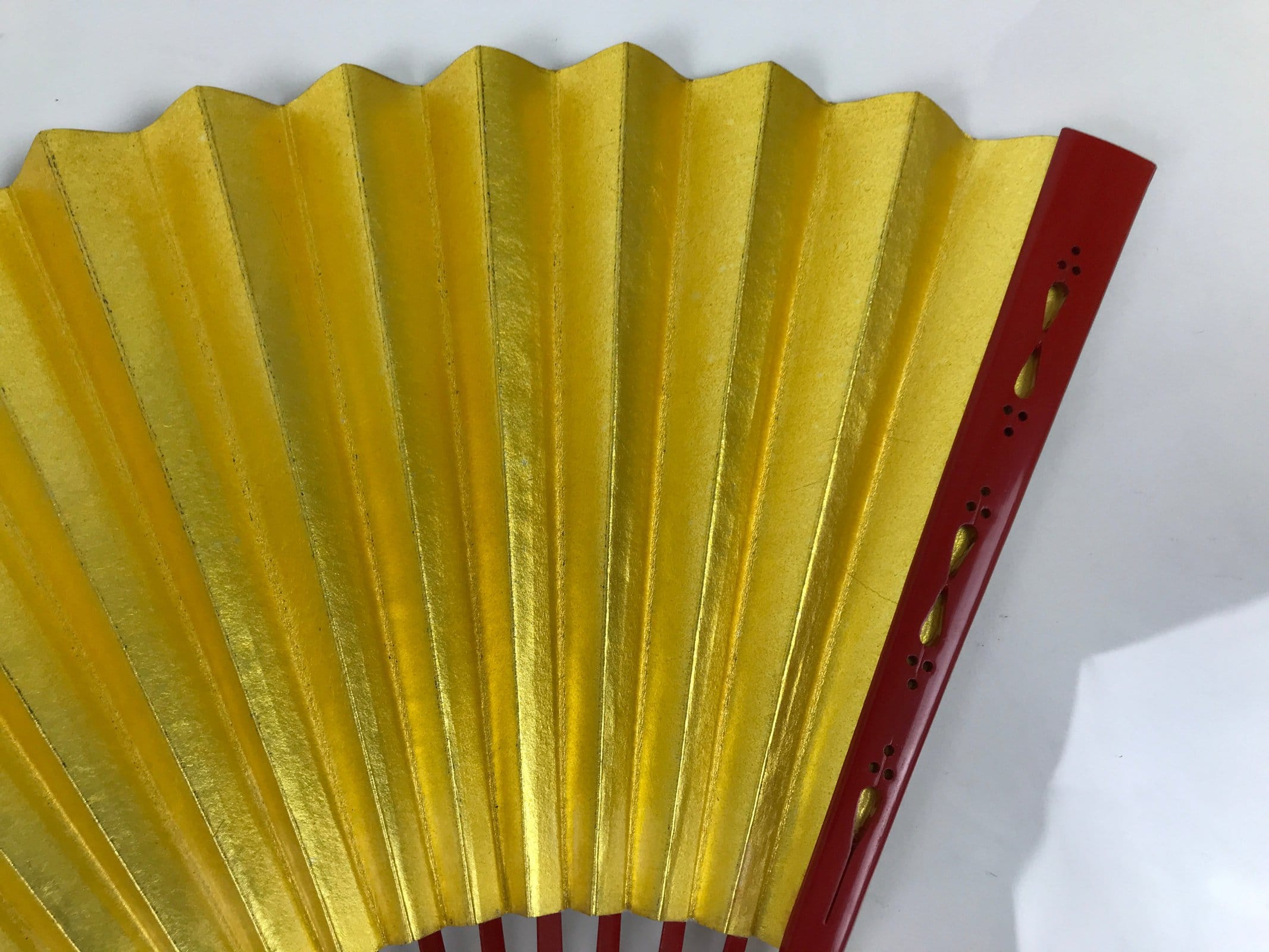 This is a traditional Japanese folding fan called sensu. You can use this when it’s hot or as decoration. The frame is made of bamboo and coated with a striking red lacquer. While both sides are blank, one is gold with the other silver. This fan is perfect for DIY, painting, and drawing.