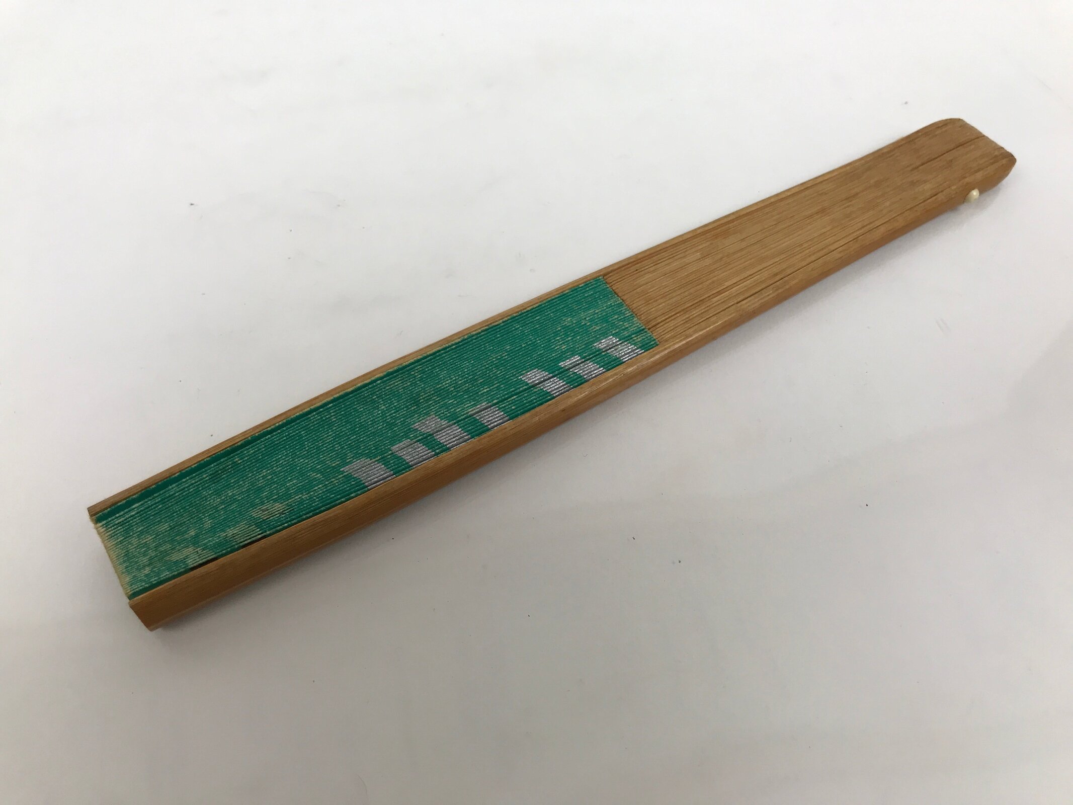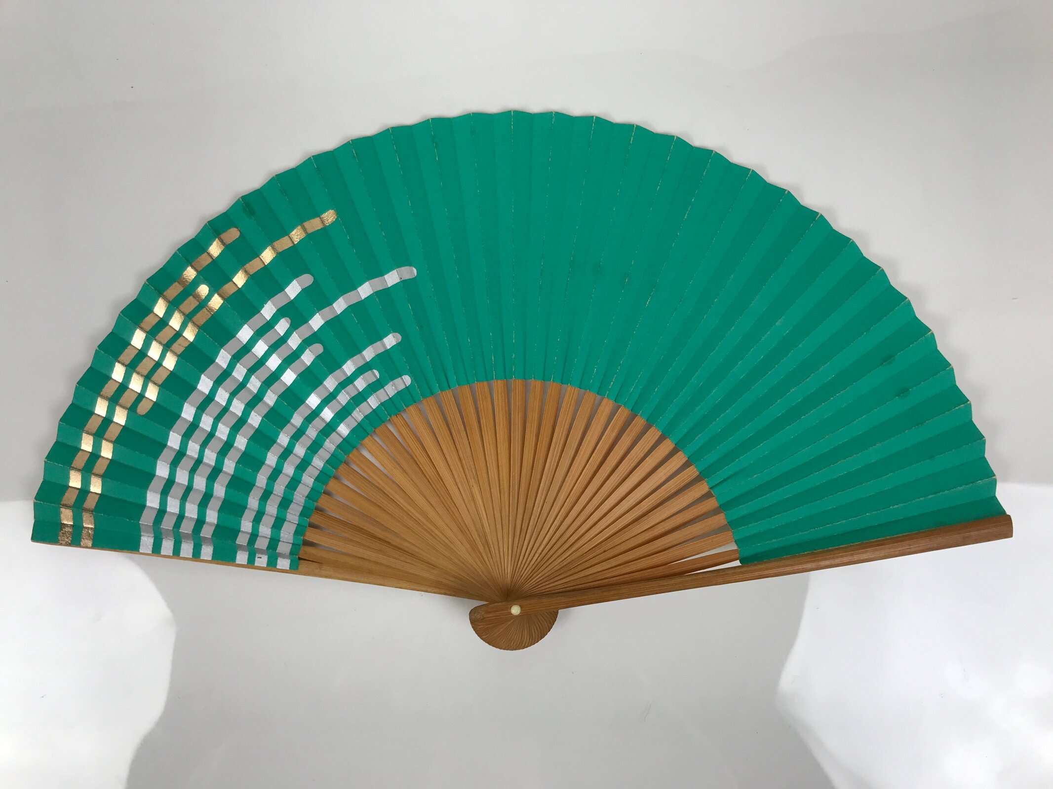 January 25, 2026Japanese Paper Folding Fan Sensu Vtg Bamboo Frame Teal Silver Gold Lines 4D977