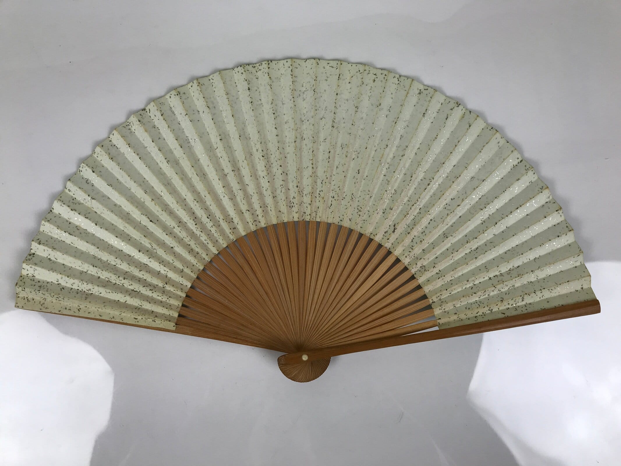 This is a traditional Japanese folding fan called sensu. You can use this when it’s hot or as decoration. This fan is made with a bold teal washi paper on the front side with gold and silver lines stretching across from the left. The back side is beige with silver specks. It is made with a natural bamboo frame.
