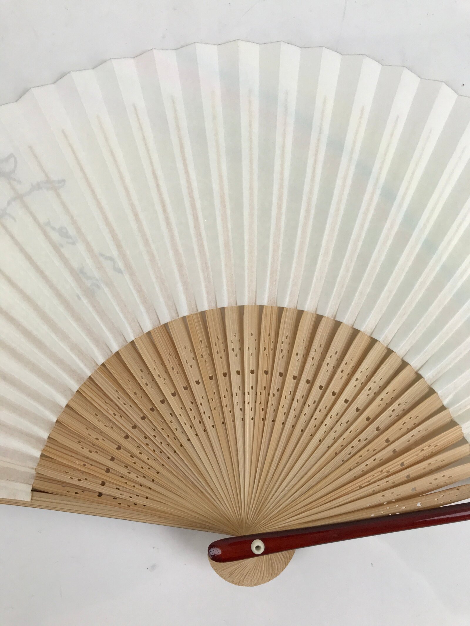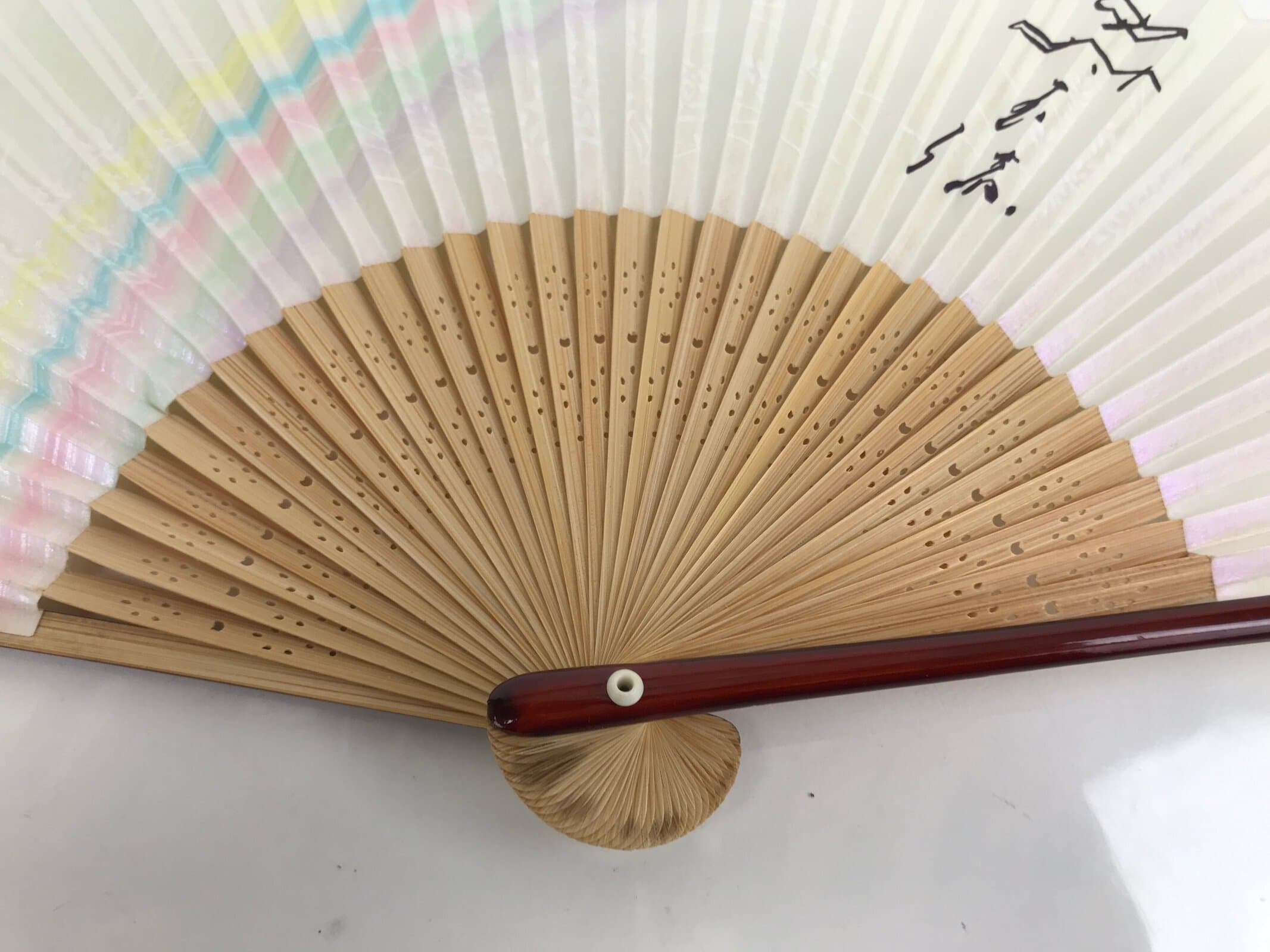 This is a traditional Japanese folding fan called sensu. You can use this when it’s hot or as decoration. This decorative fan features a subtle pastel rainbow with white foliage on the foreground and some calligraphy on the right. The paper has a pearlescent finish. The inner frame is natural bamboo.