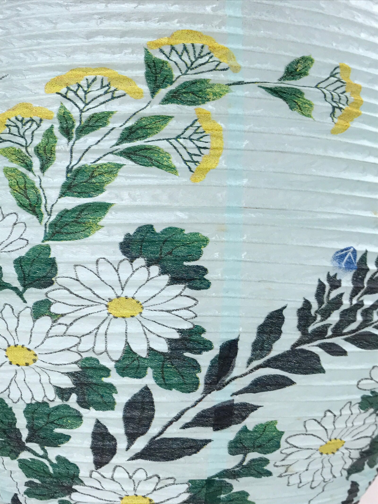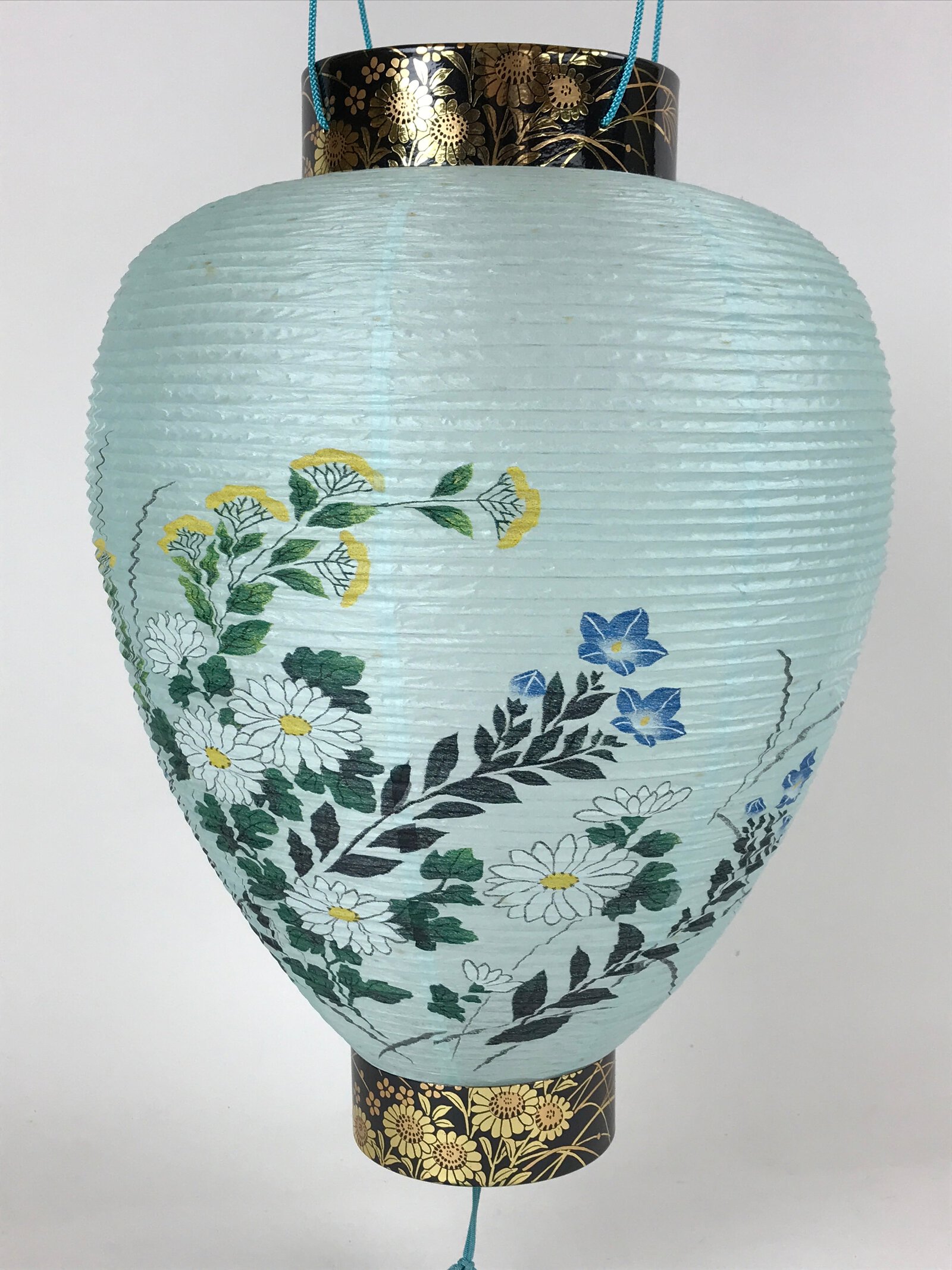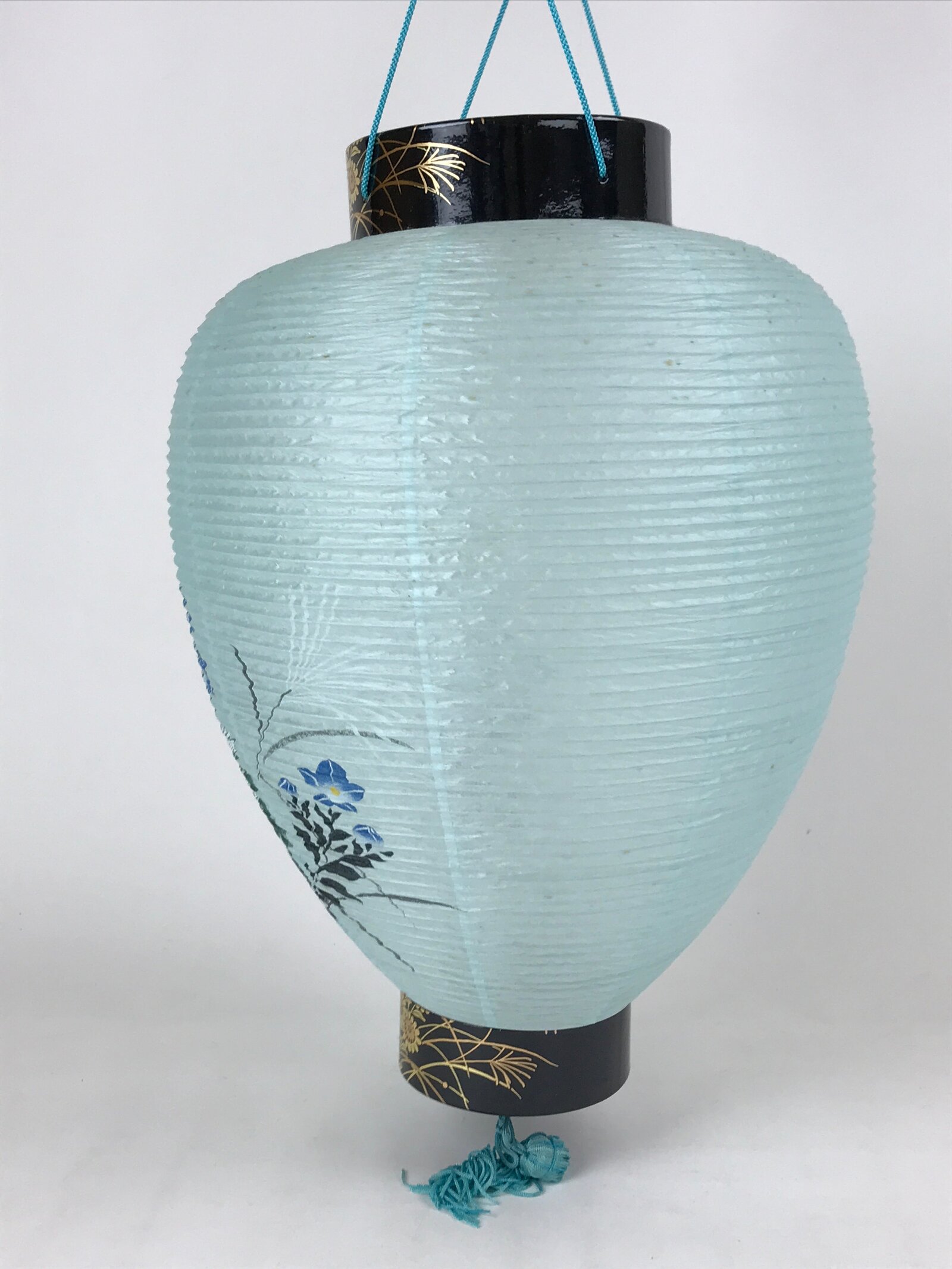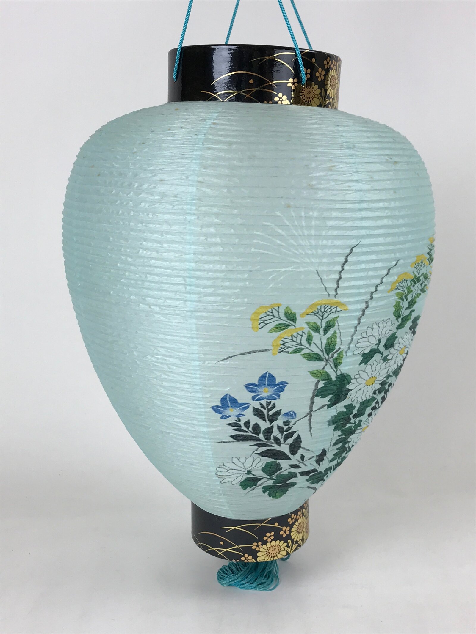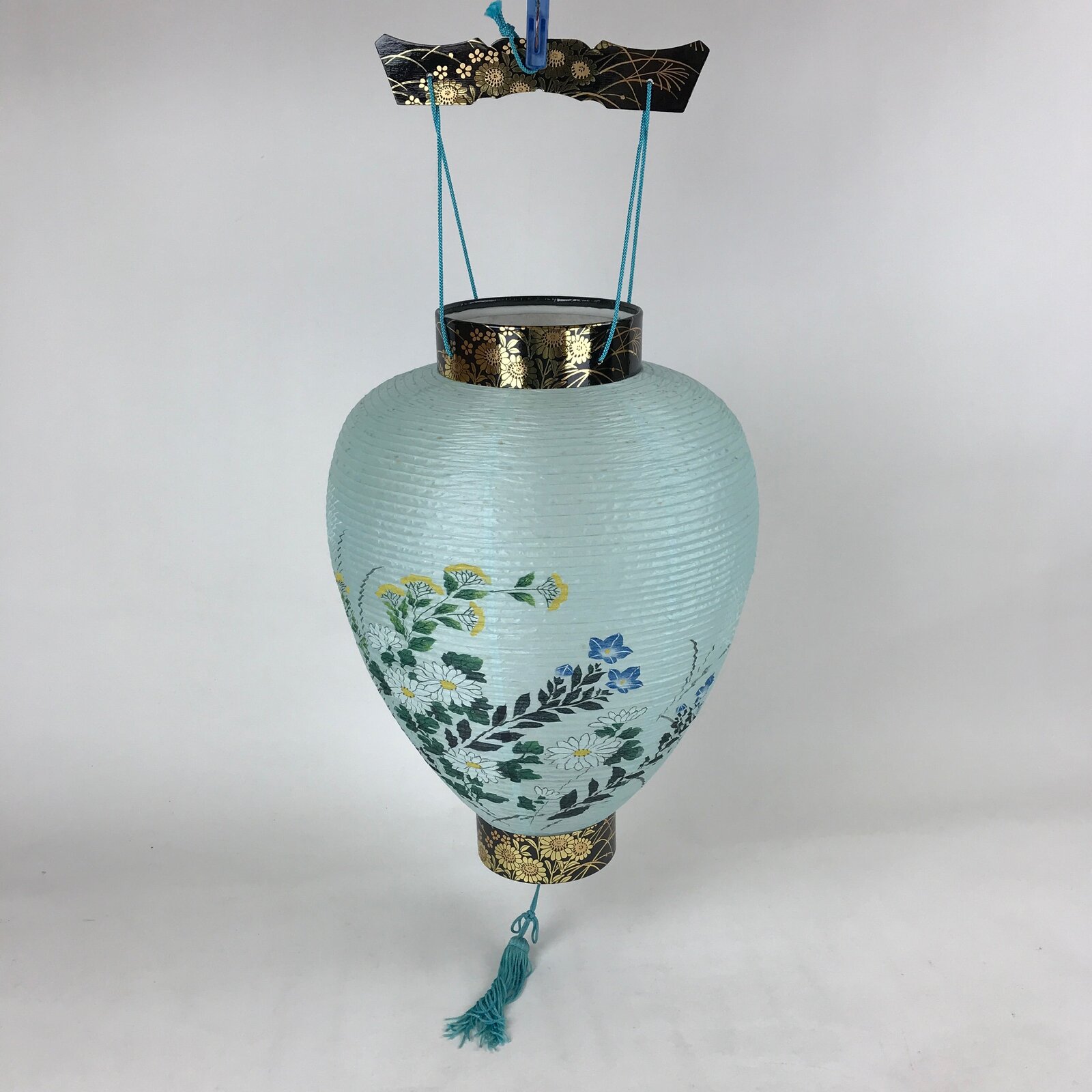 This is a vintage Japanese paper lantern called chochin. It is made with thin washi paper with a thin bamboo frame. It compresses flat for storage. It is an upside down teardrop shape and is decorated with various flowers such as chrysanthemums and morning glories in white, blue, and yellow. It has one blue tassel on the bottom and inside, a metal spike to place a candle. The decorative hanging piece as well as the trim on the top and bottom are black with gold makie flowers. Original box is included.