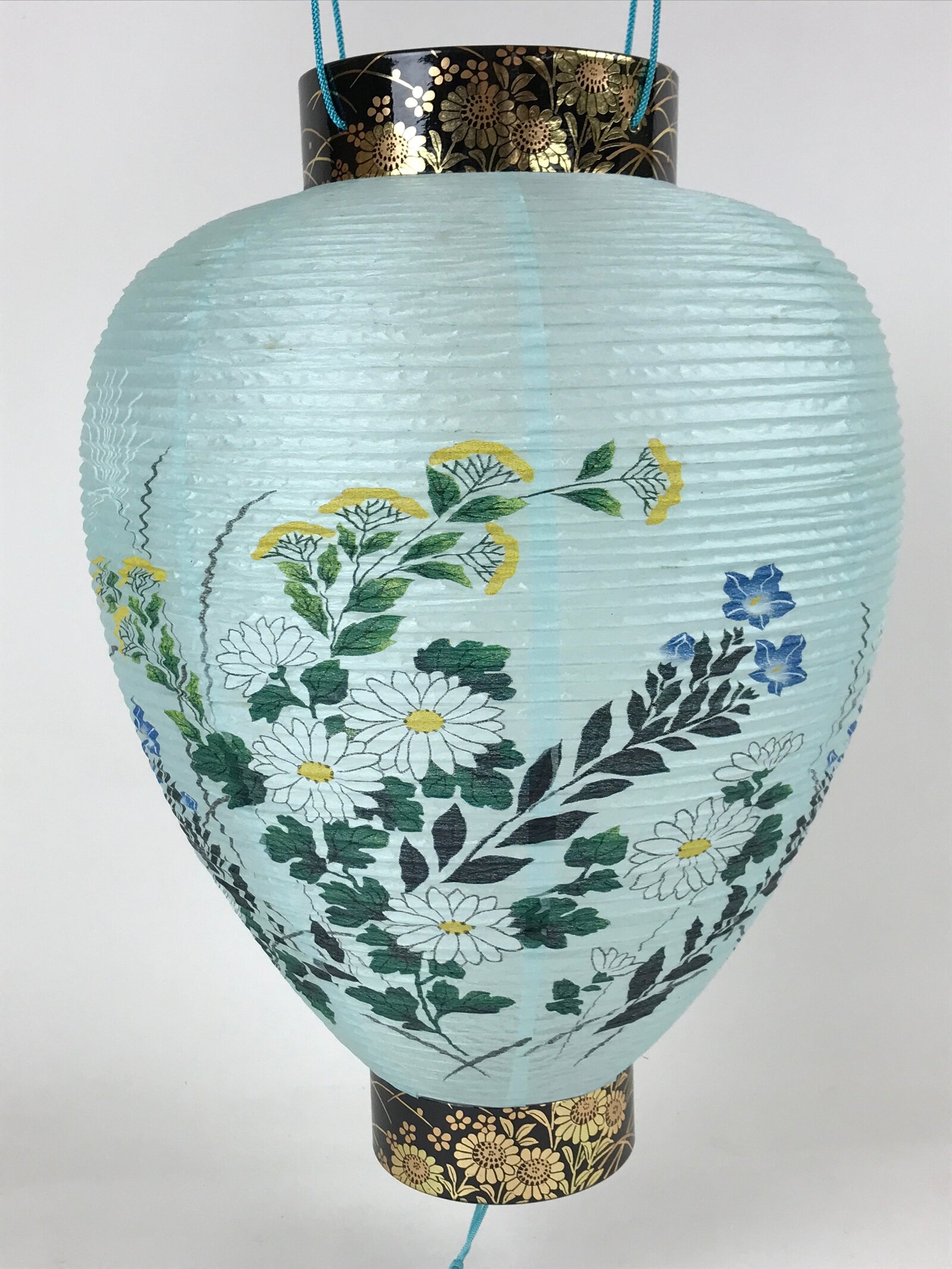 Japanese Paper Hanging Chochin Lantern Vtg Flowers Blue Tassel Black Gold LT72