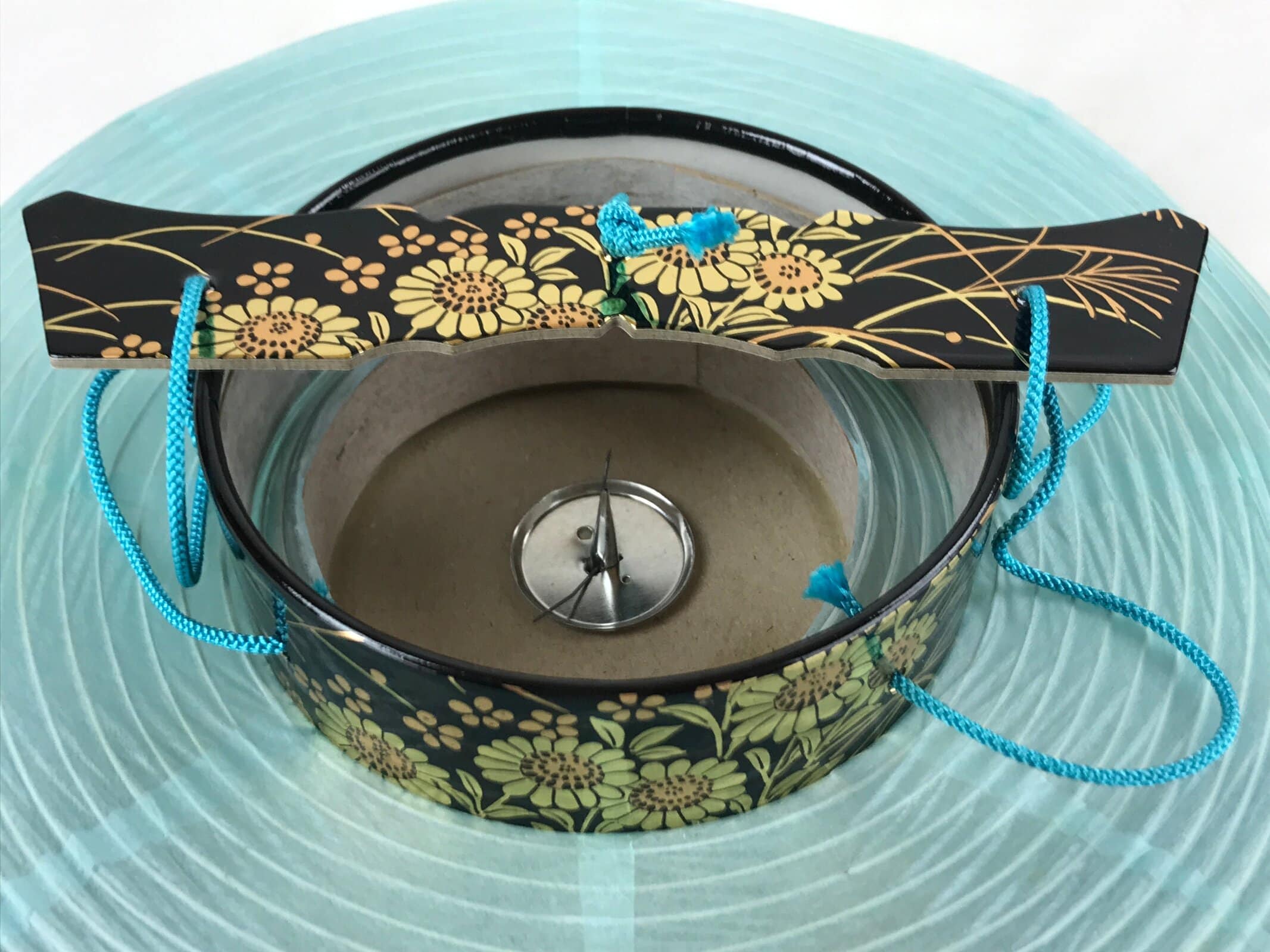 This is a vintage Japanese paper lantern called chochin. It is made with thin washi paper with a thin bamboo frame. It compresses flat for storage. It is an upside down teardrop shape and is decorated with various flowers such as chrysanthemums and morning glories in white, blue, and yellow. It has one blue tassel on the bottom and inside, a metal spike to place a candle. The decorative hanging piece as well as the trim on the top and bottom are black with gold makie flowers. Original box is included.