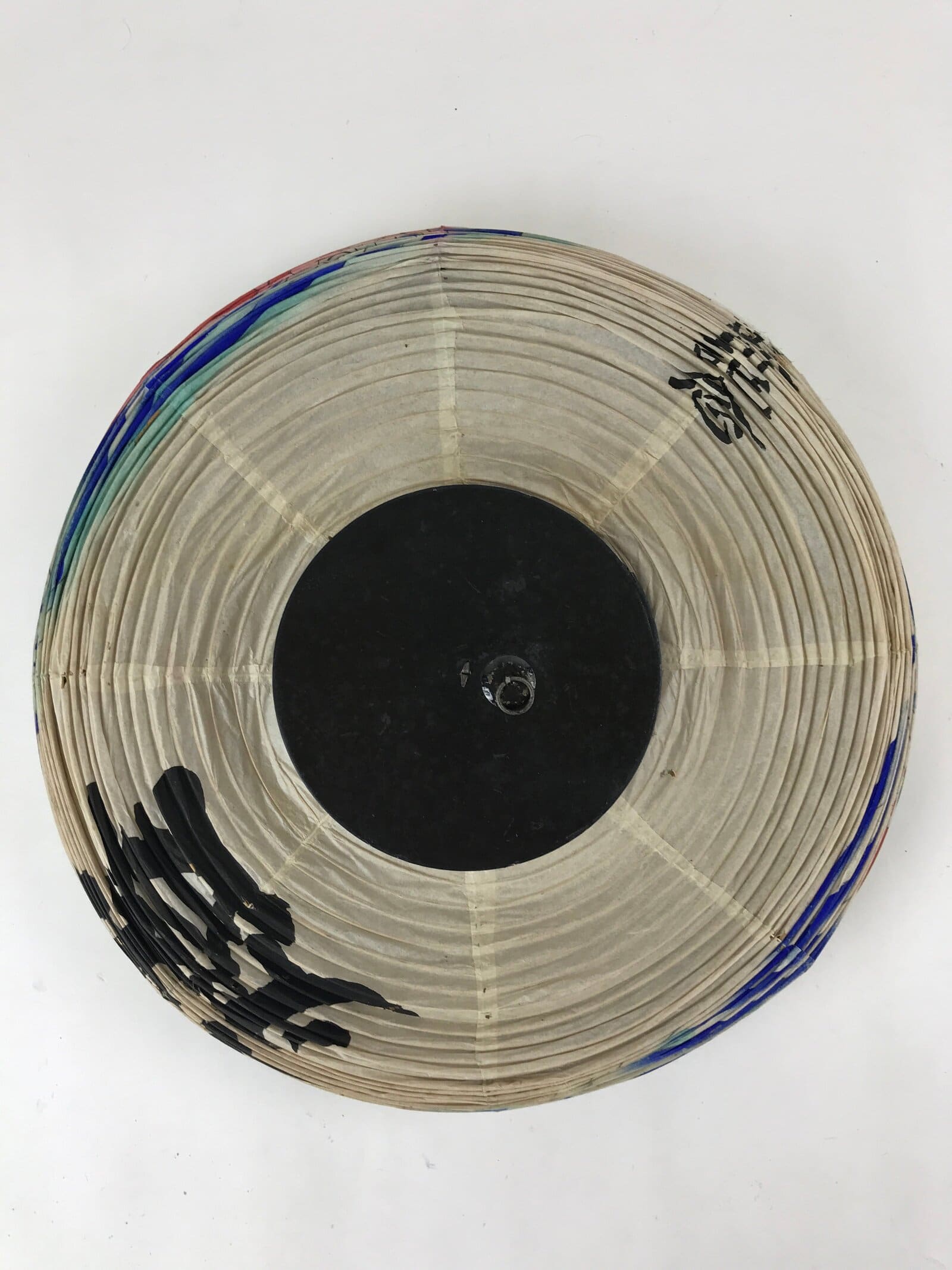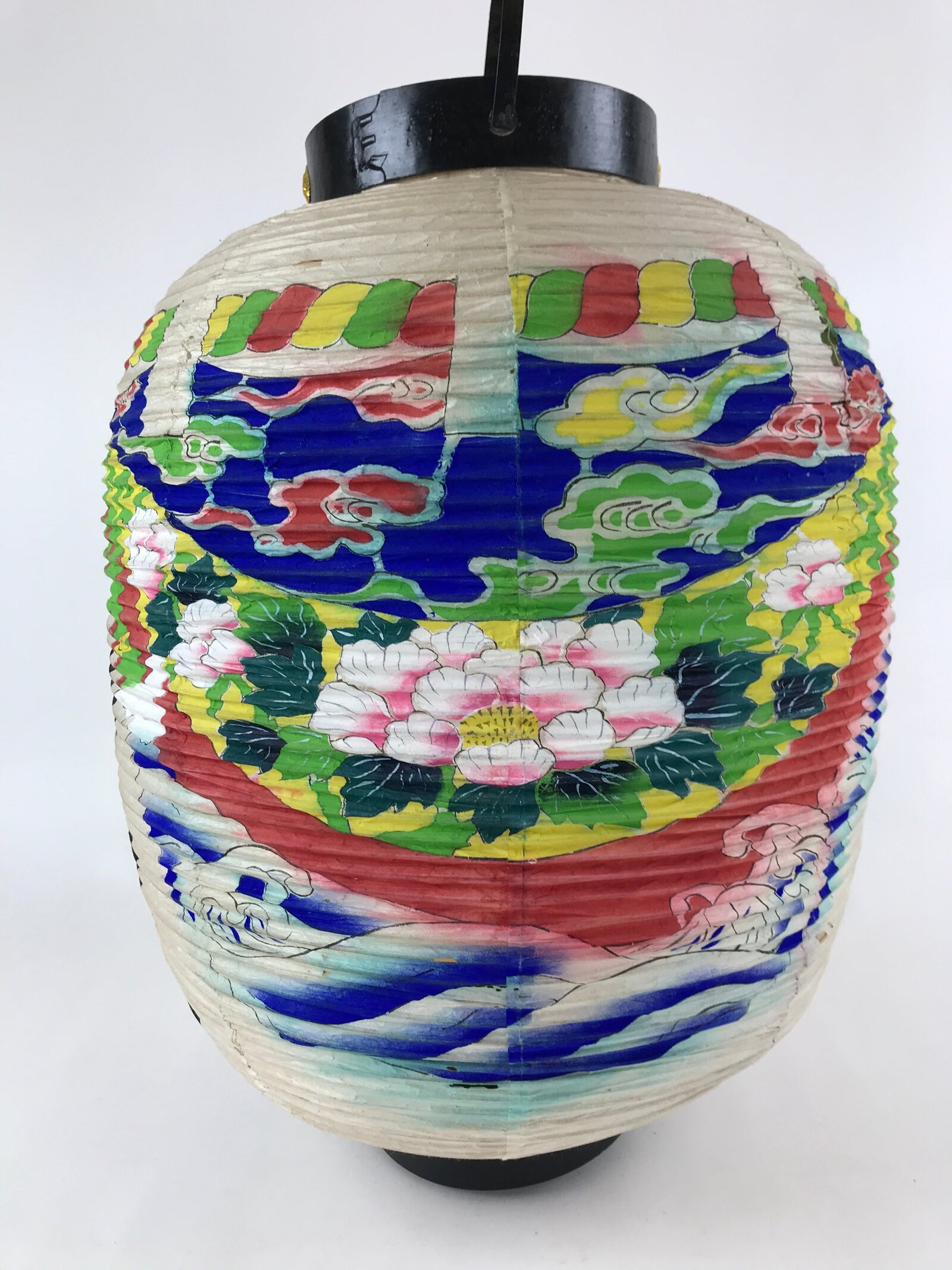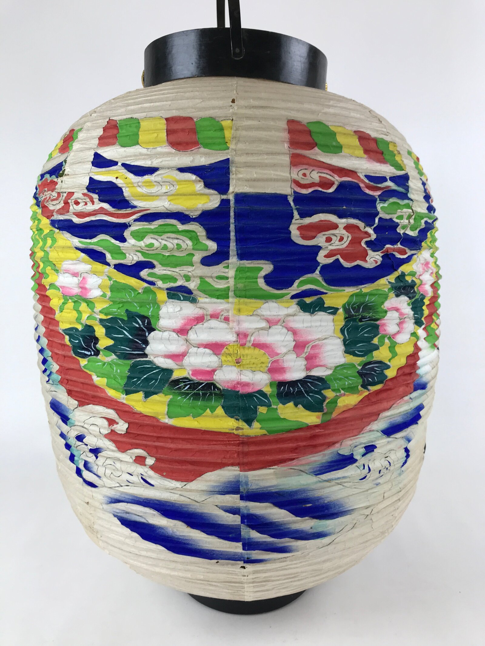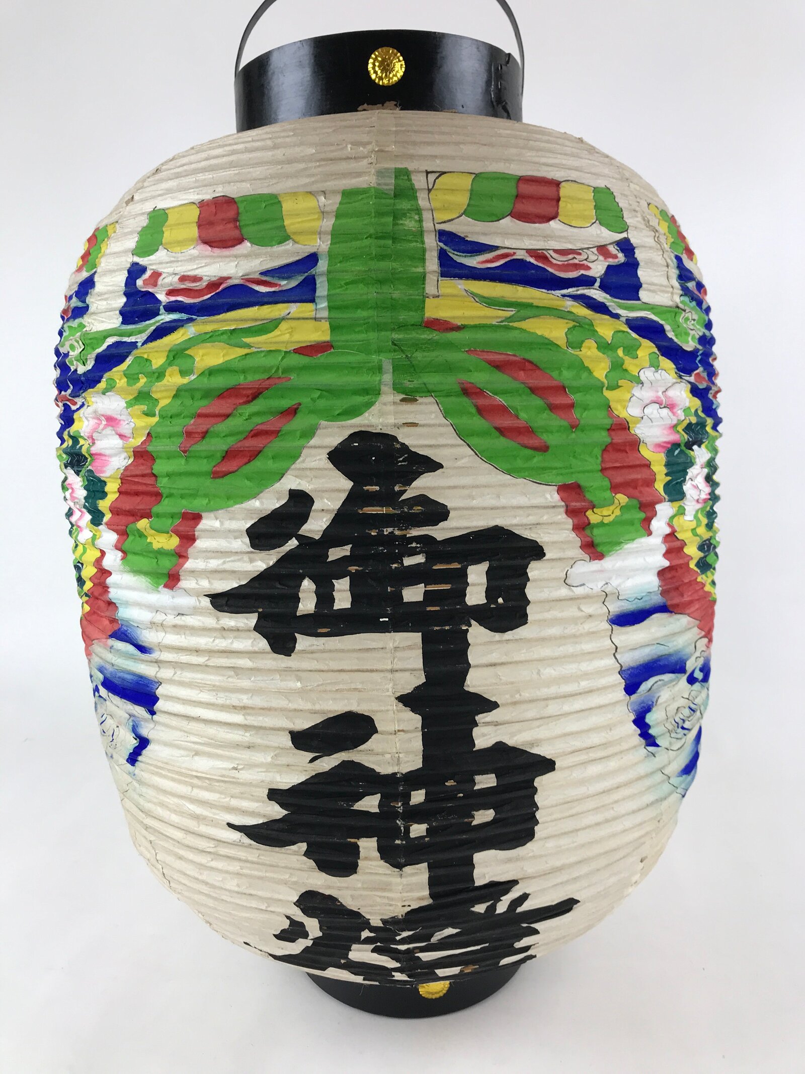 This is a Japanese vintage hanging paper lantern, or Chochin. This large foldable paper lantern has an oblong shape and is adorned with a colorful floral pattern. It has Japanese characters painted on the front and on the back. This lantern was probably used as an offering to the Japanese gods. It has a built-in metal candle holder on the center of the base, which enables you to light up a real candle if you’d like.