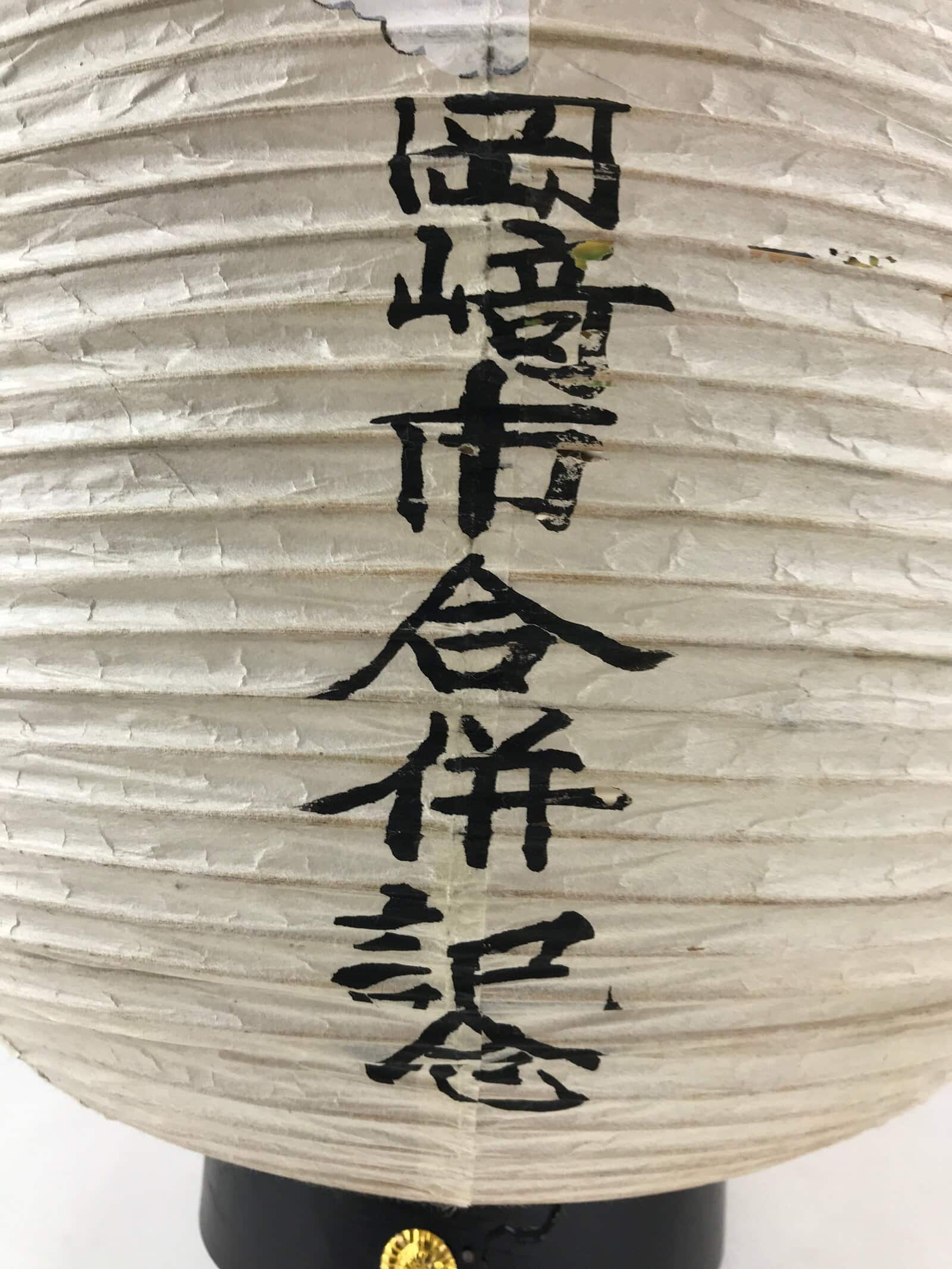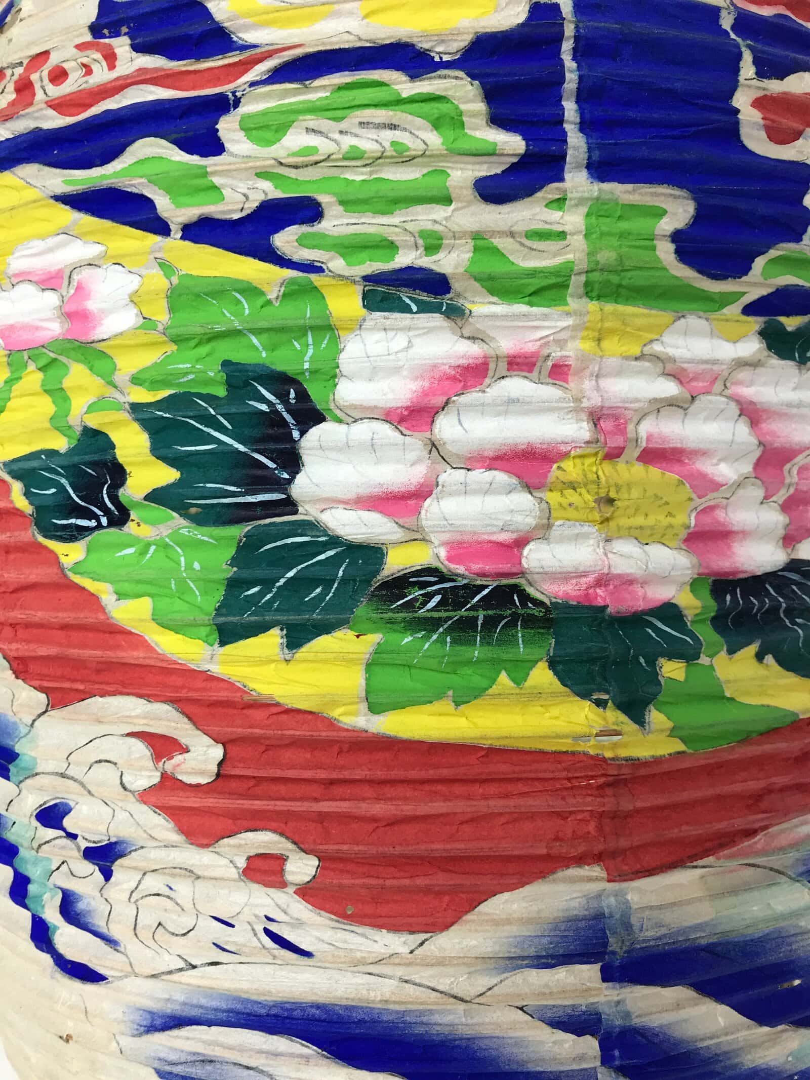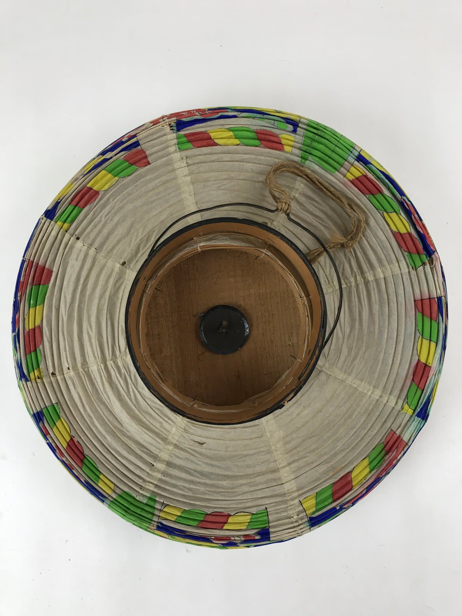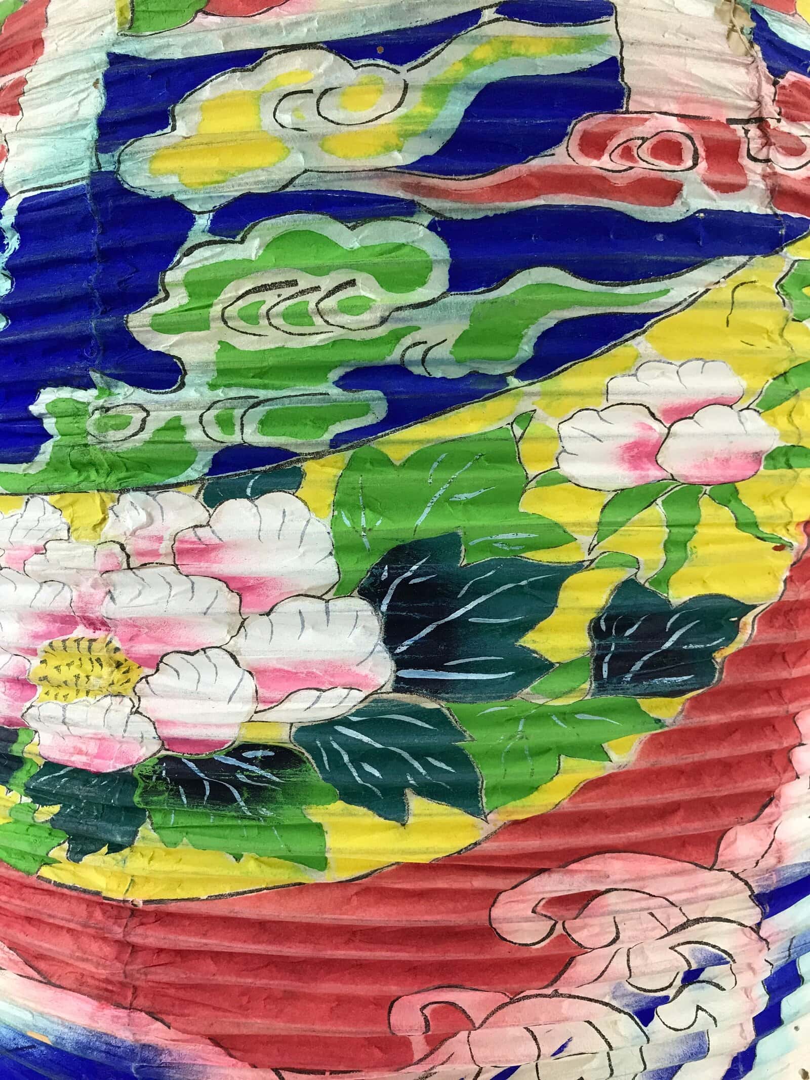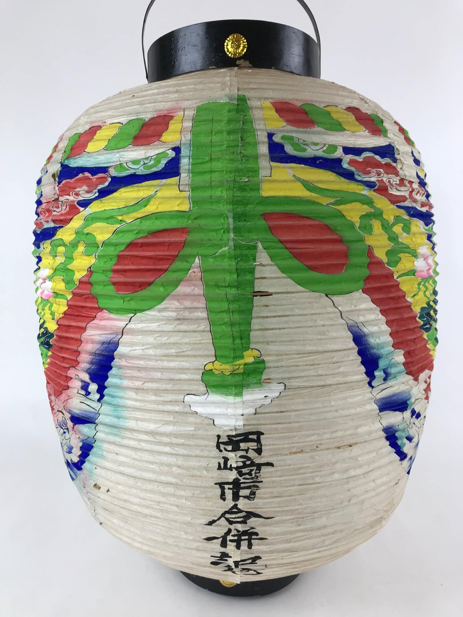 This is a Japanese vintage hanging paper lantern, or Chochin. This large foldable paper lantern has an oblong shape and is adorned with a colorful floral pattern. It has Japanese characters painted on the front and on the back. This lantern was probably used as an offering to the Japanese gods. It has a built-in metal candle holder on the center of the base, which enables you to light up a real candle if you’d like.