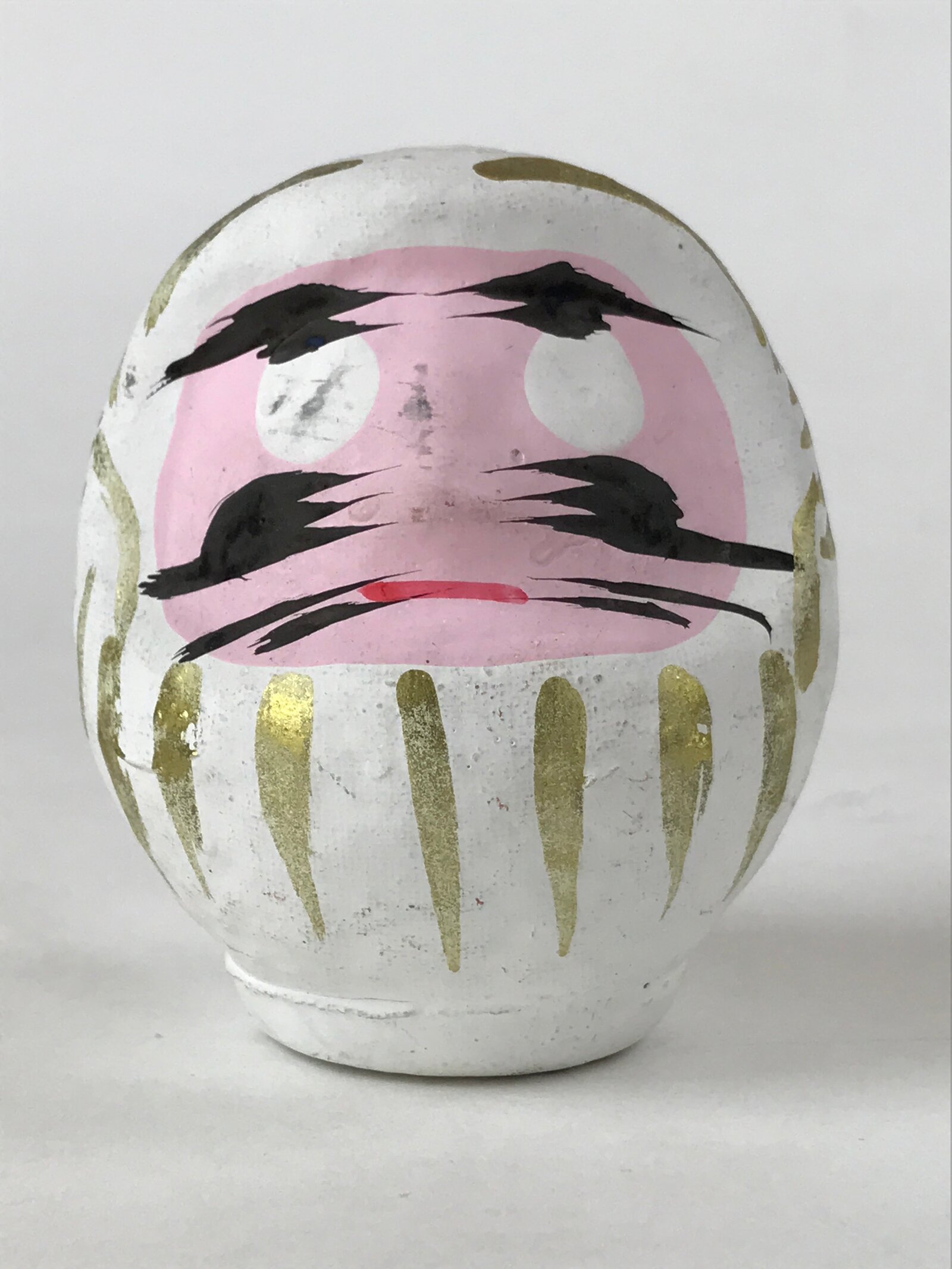 This daruma has not been used. It is white which is used for luck in love and harmony. It also has a slot on the top to insert coins like a piggy bank, however there is no means of opening this figure without damaging it.
