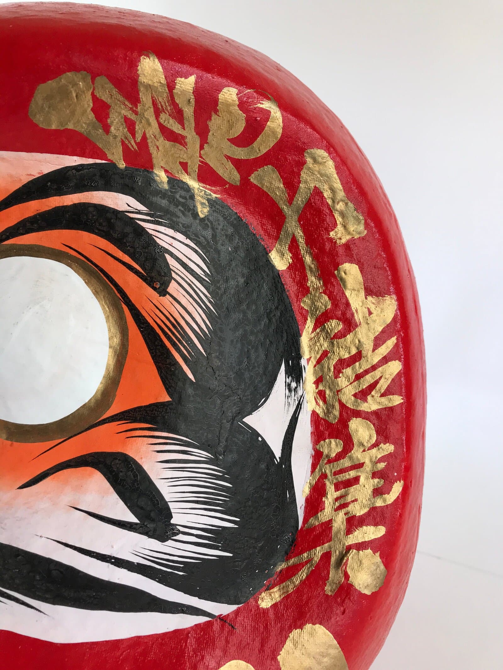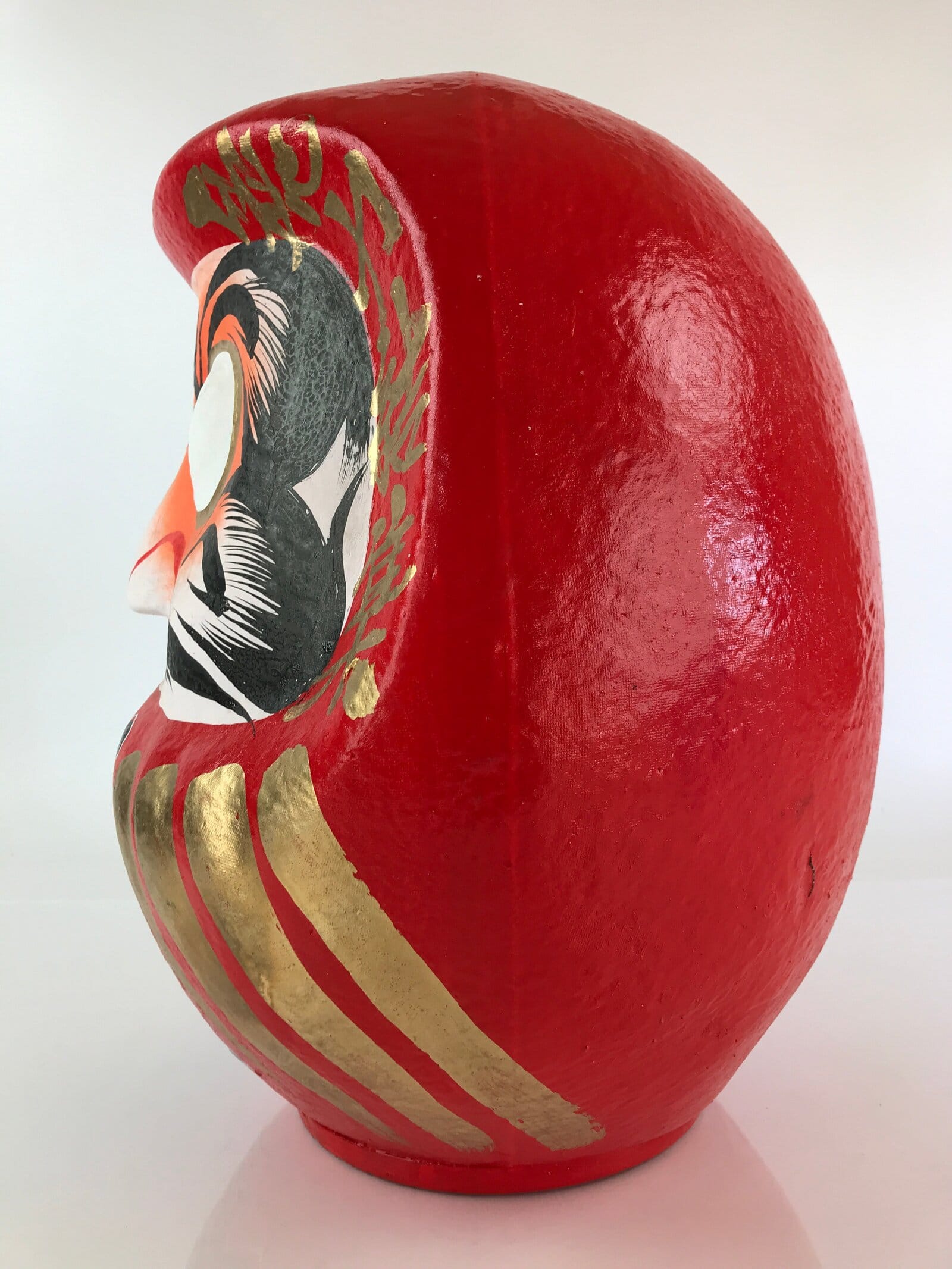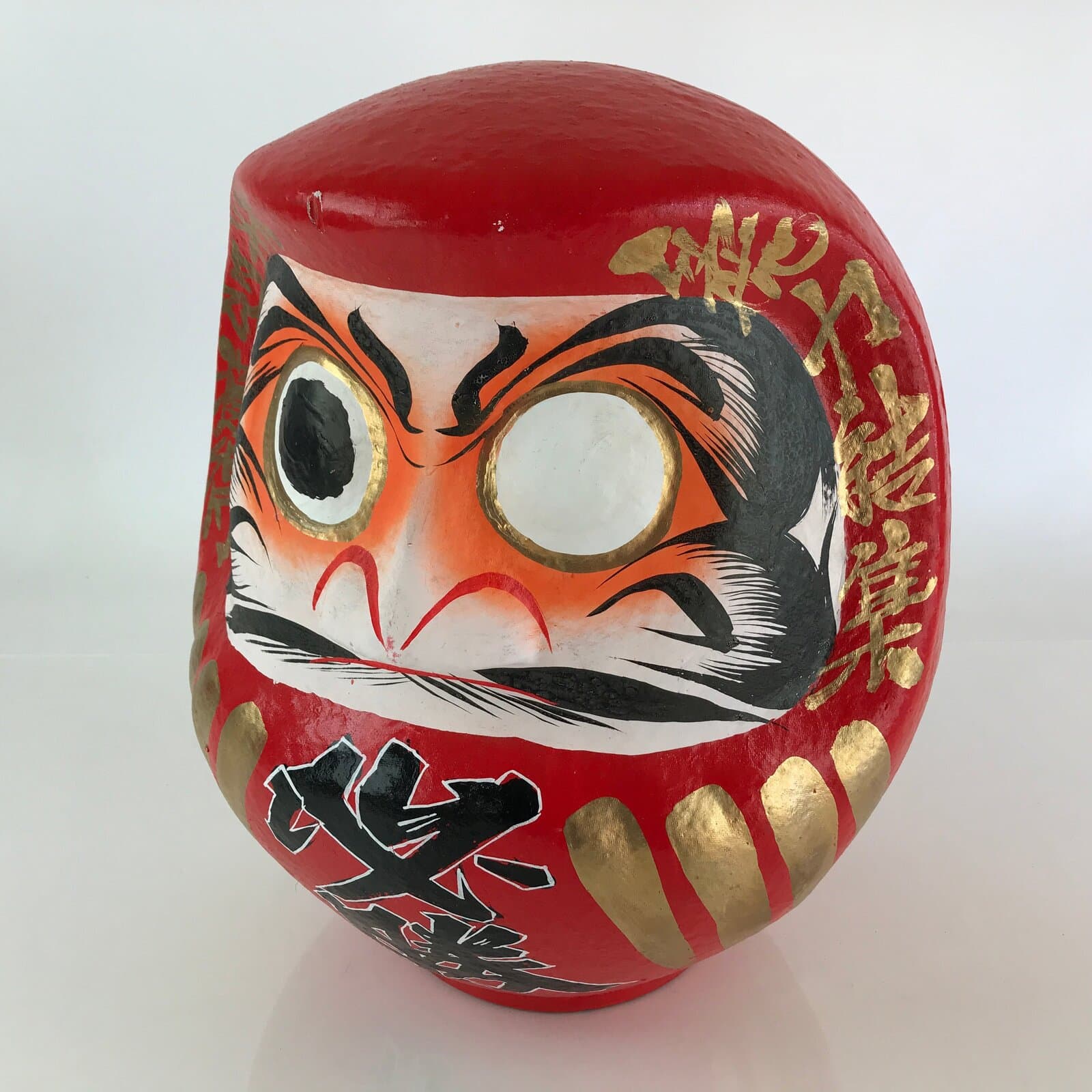 This is a Japanese Daruma figurine made of papier-mâché. It is a traditional Japanese lucky charm and toy that imitates the figure of Daruma Daishi sitting in meditation. Daruma doll is sold without eyes, and it is common for buyers to put their eyes on themselves. Fill in one eye with a wish, then fill in the other eye when your wish comes true.