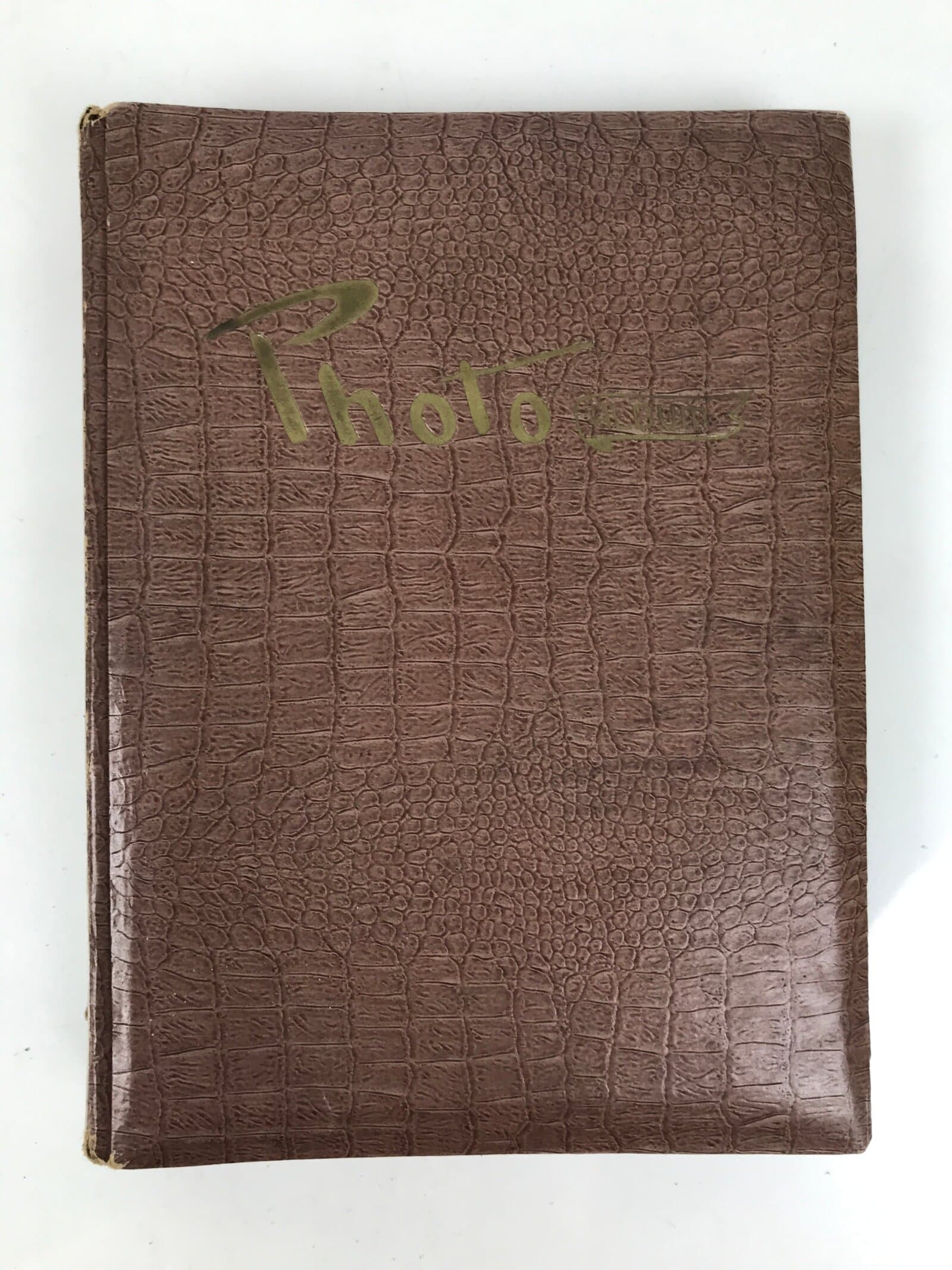 This vintage photo album from the 1950s features a mix of group photos and individual portraits of adults, young adults, and children. The sepia-toned photos are attached to black pages. One-third of the album is empty. The cover is thick, brown, and has gold letters.