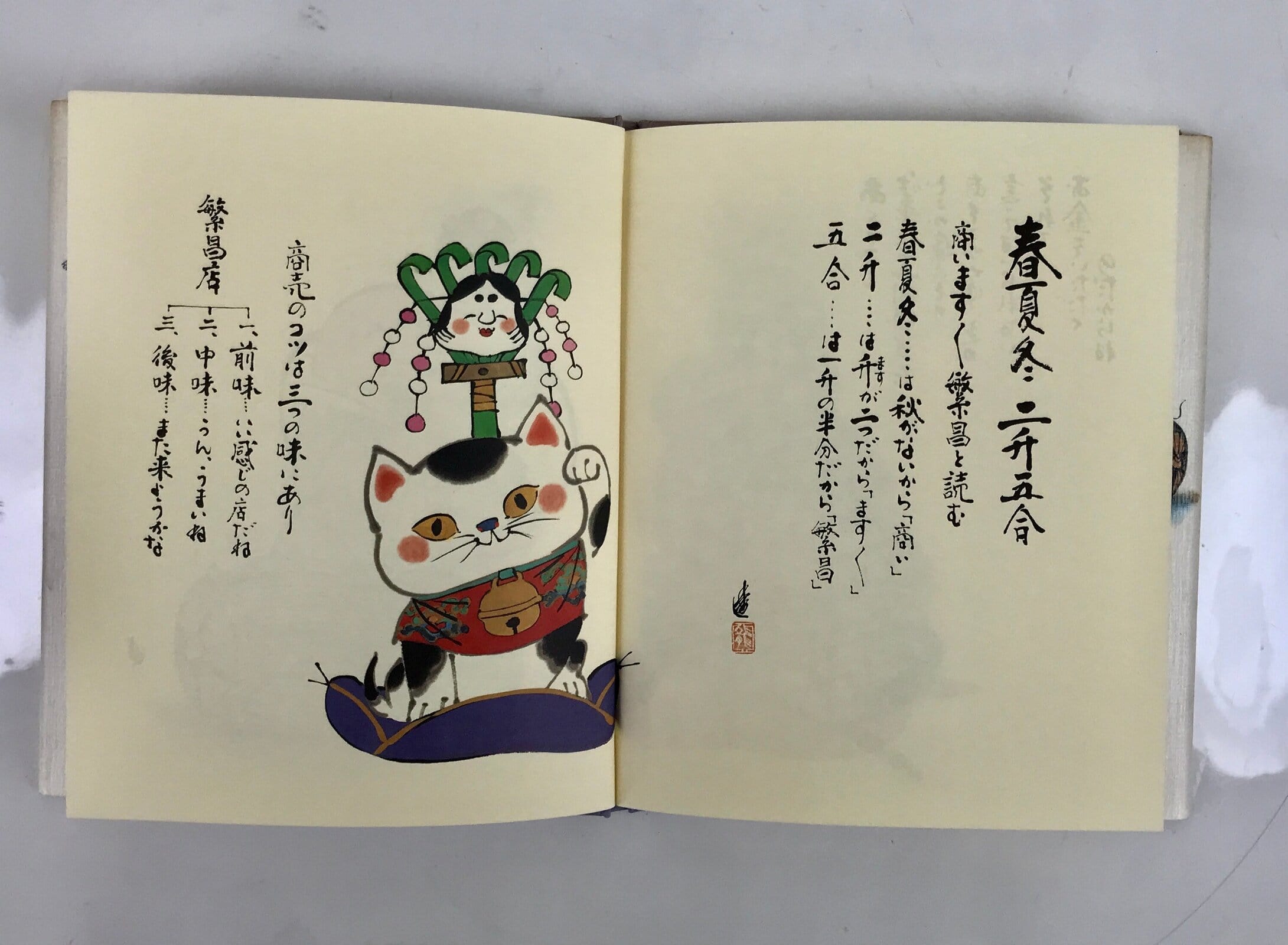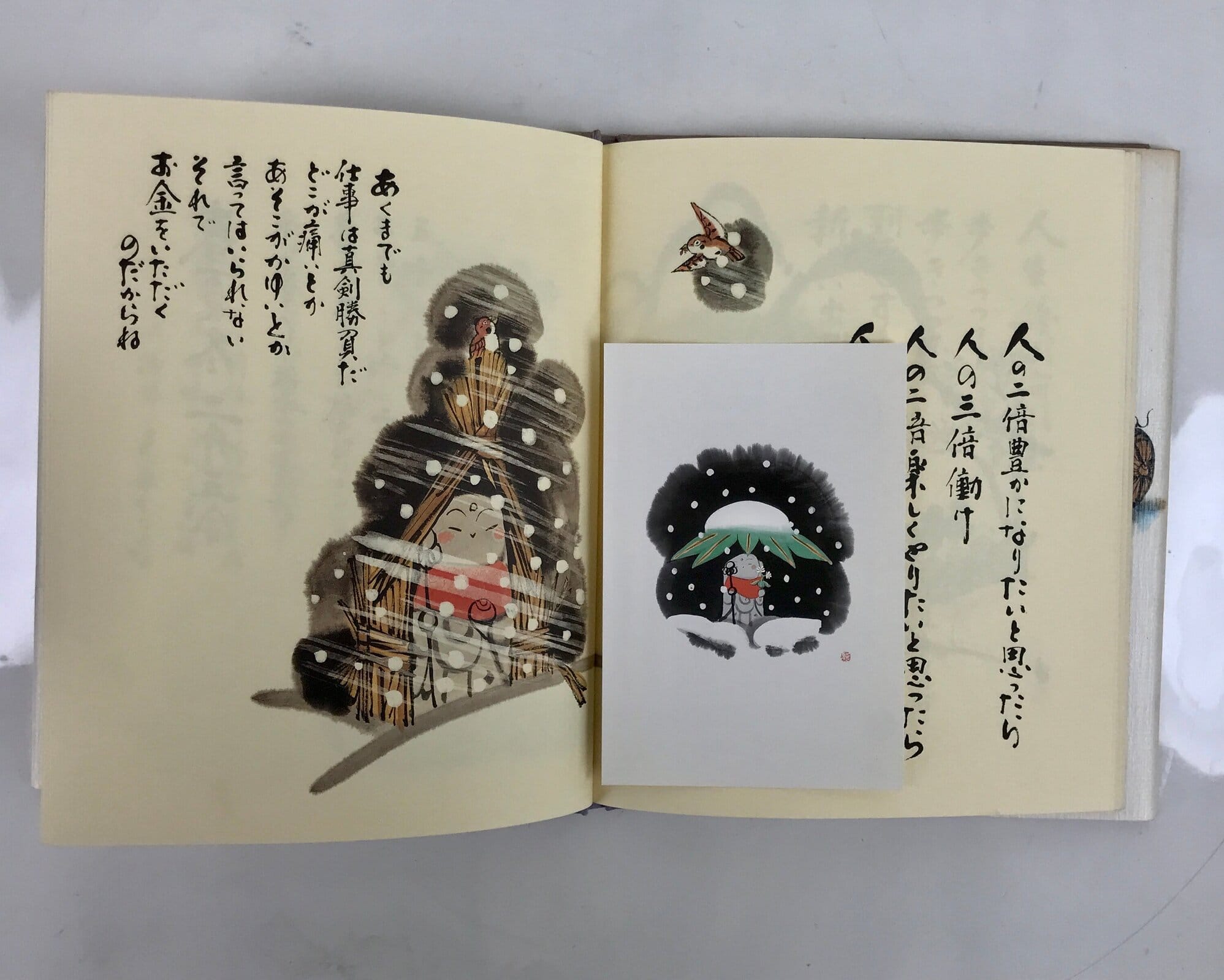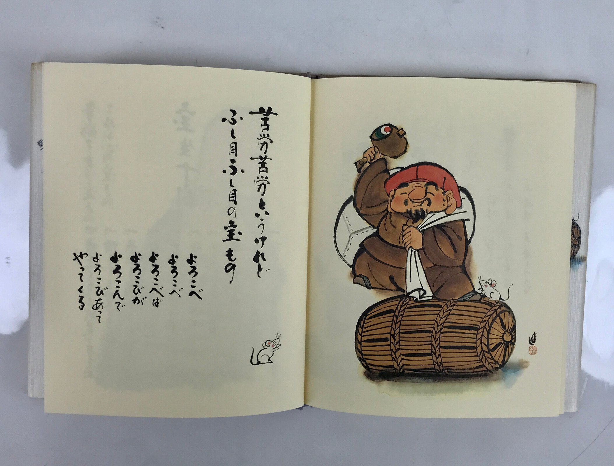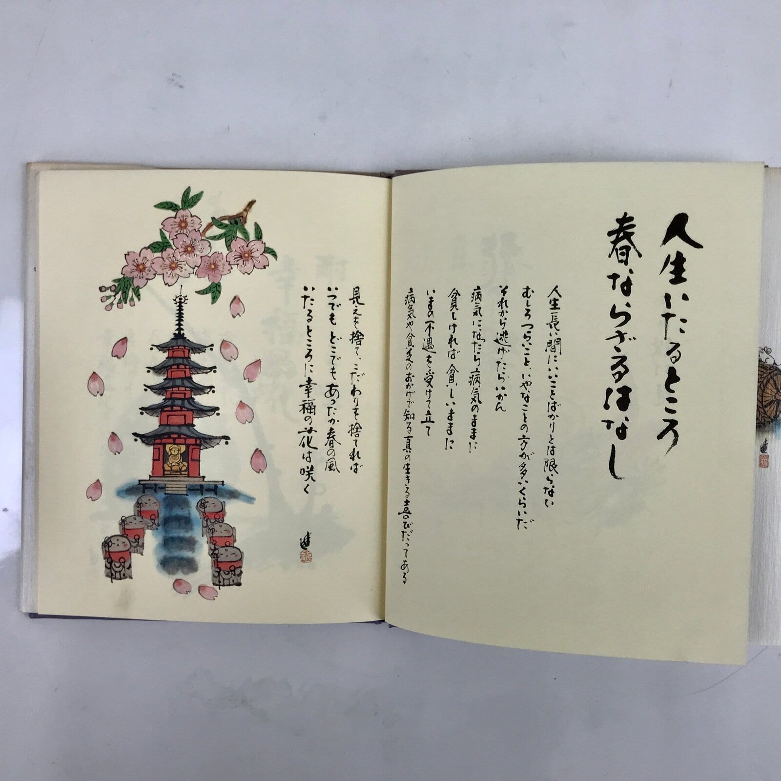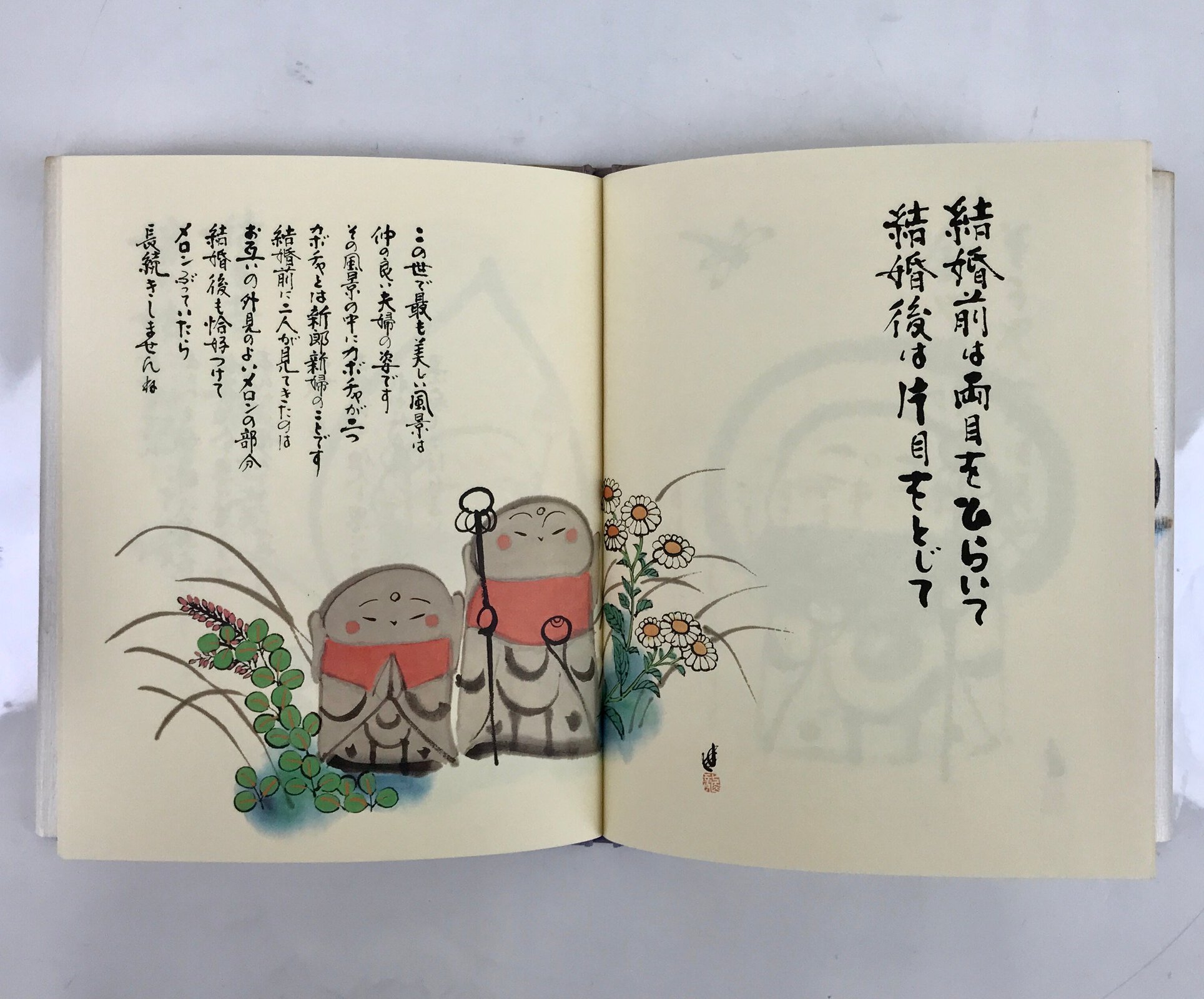 This vintage Japanese picture book features illustrations and calligraphy by ema (Japanese good fortune amulets) artist Susumu Tonomura. This book is a collection of positive sayings about life and one’s mindset. The illustrations often feature a jizo statue, which is a Buddhist figure.