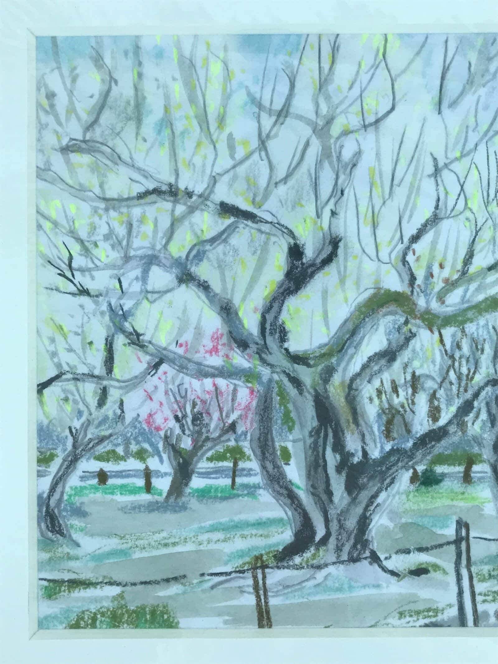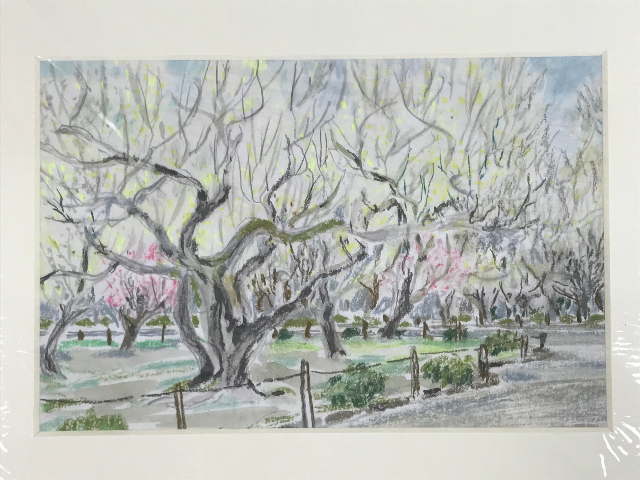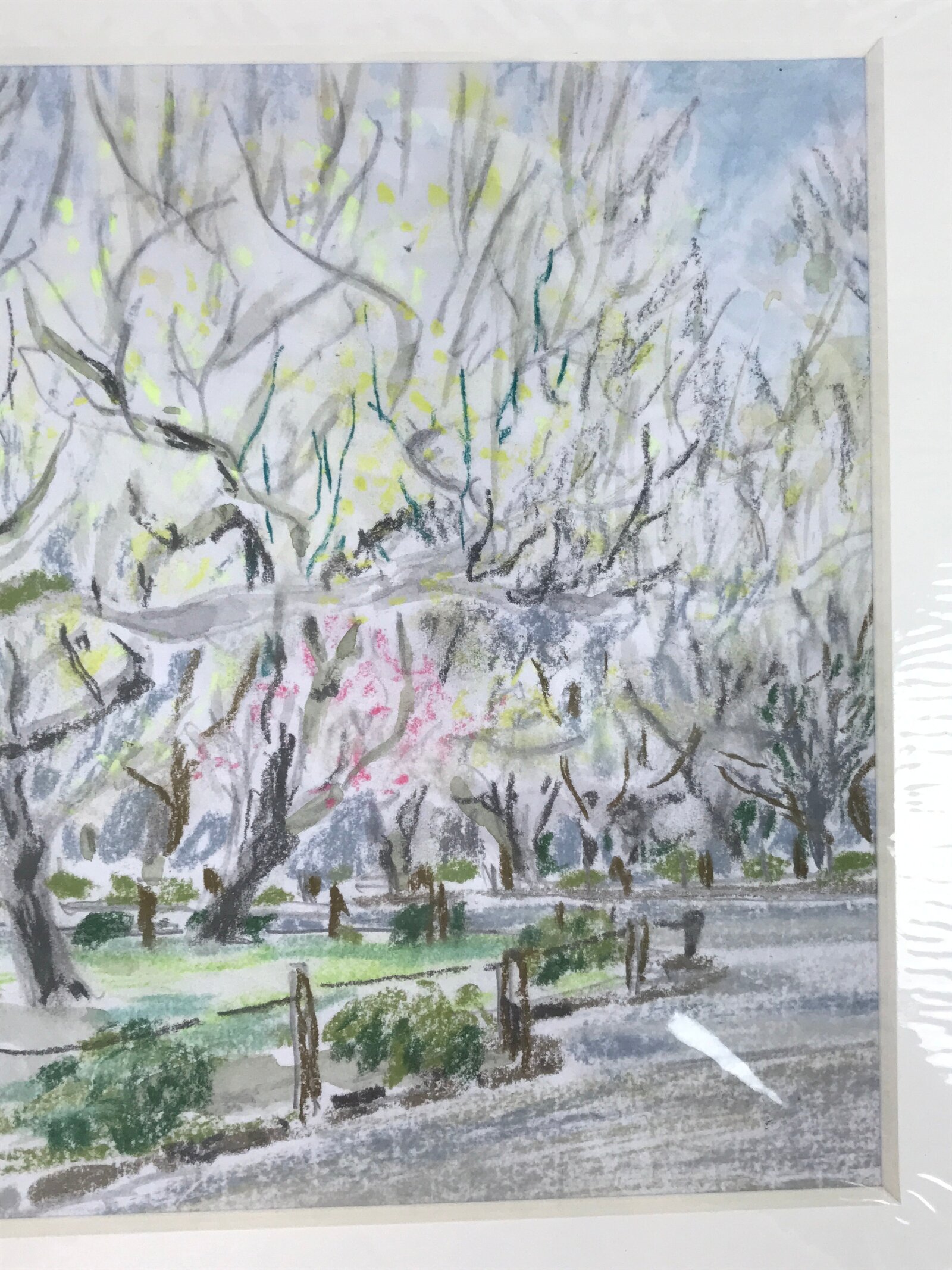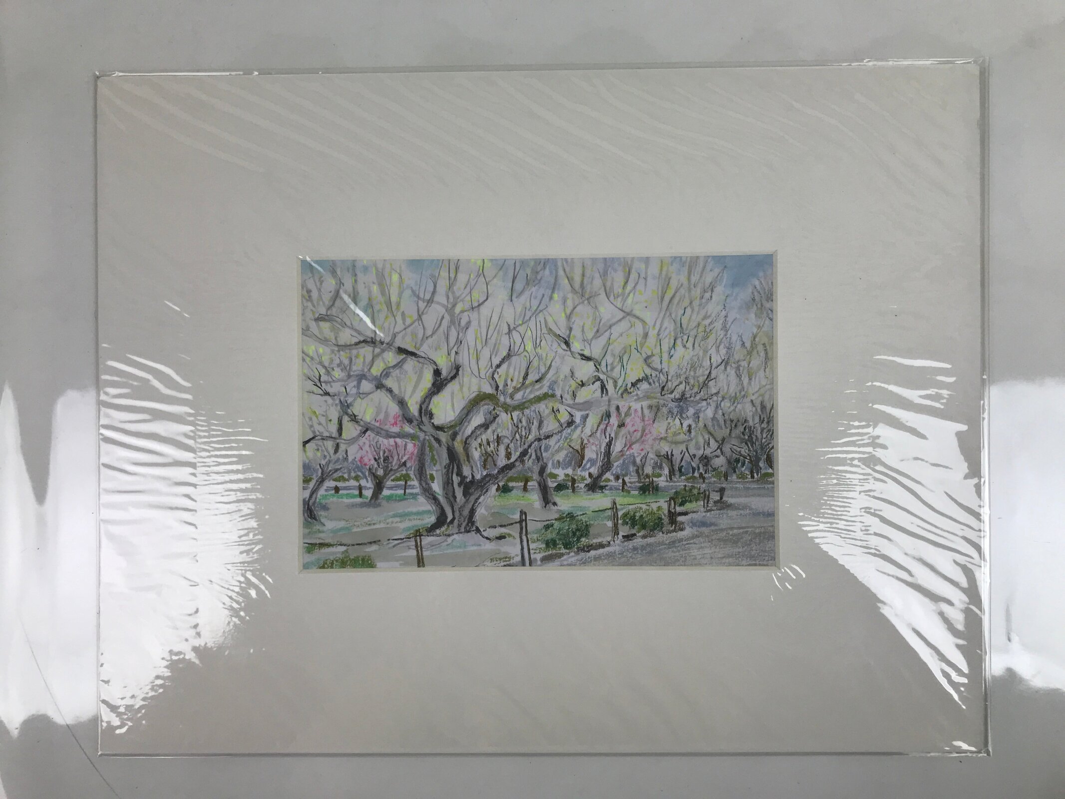 This original pastel drawing on cardstock paper features a scene captured from a park in late winter. Large trees in the foreground are gaining fresh spring leaves with full-bloom plum blossom trees in the background. Pastel is a gorgeous, often overlooked, art medium that blends colors together beautifully and this piece is no exception. It is adhered to a plain white matboard, ready for easy framing and is stored in a plastic sleeve. This work is unsigned, but was among a collection of similar drawings by the Japanese artist Yoshihiro Hagino.
