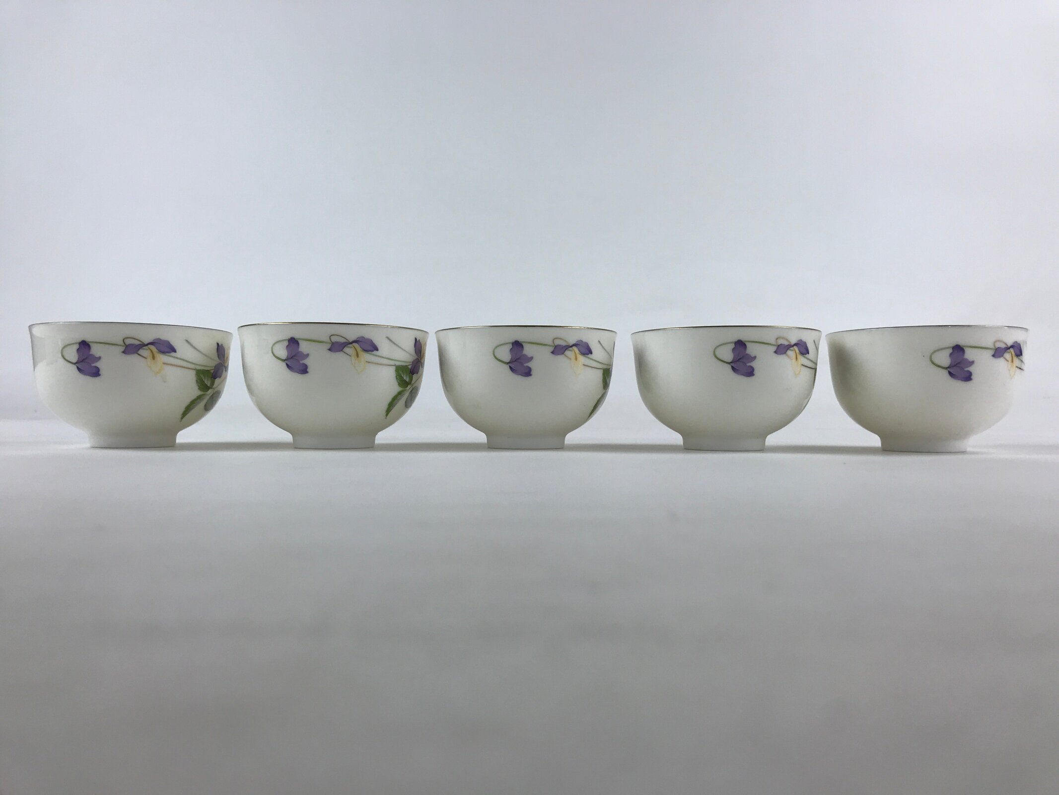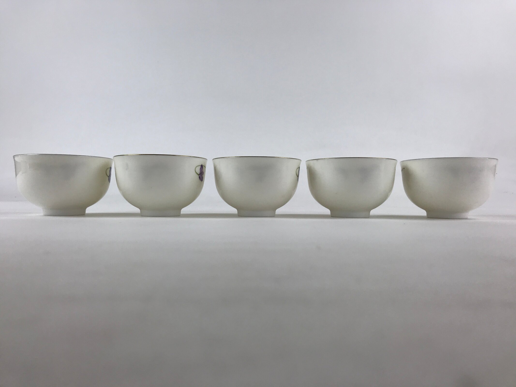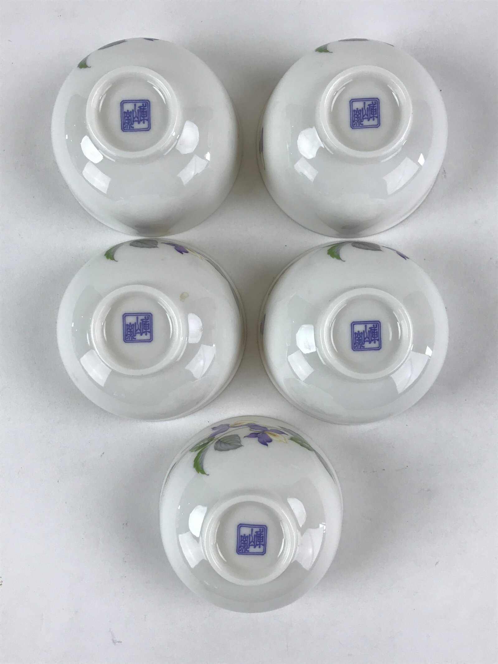 This set of five vintage Japanese white porcelain teacups features a purple flower decoration, plus a signature on the bottom. Perfect for enjoying a refreshing cold tea in hot summer weather.