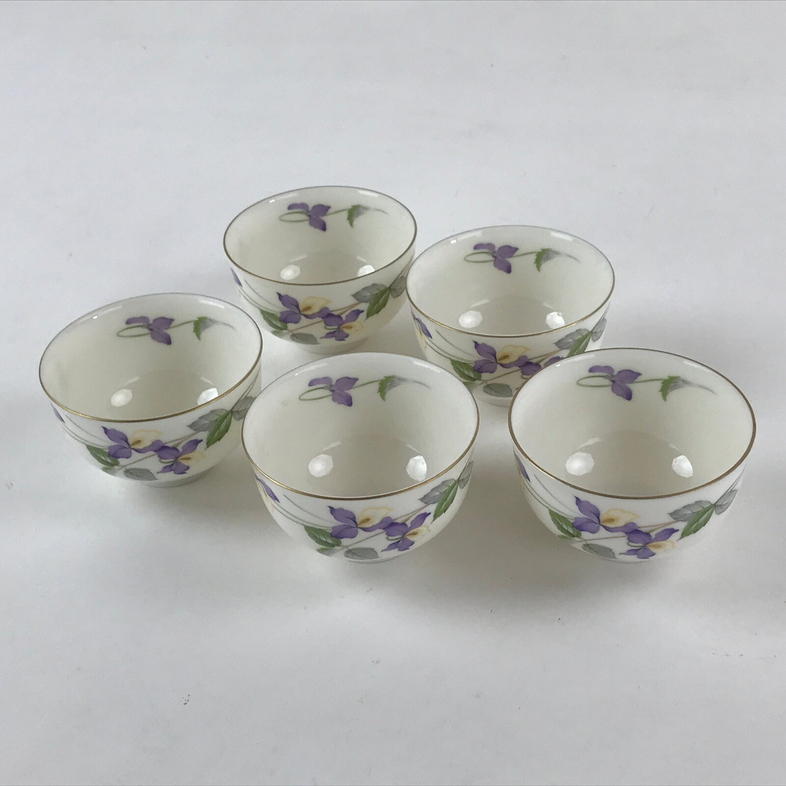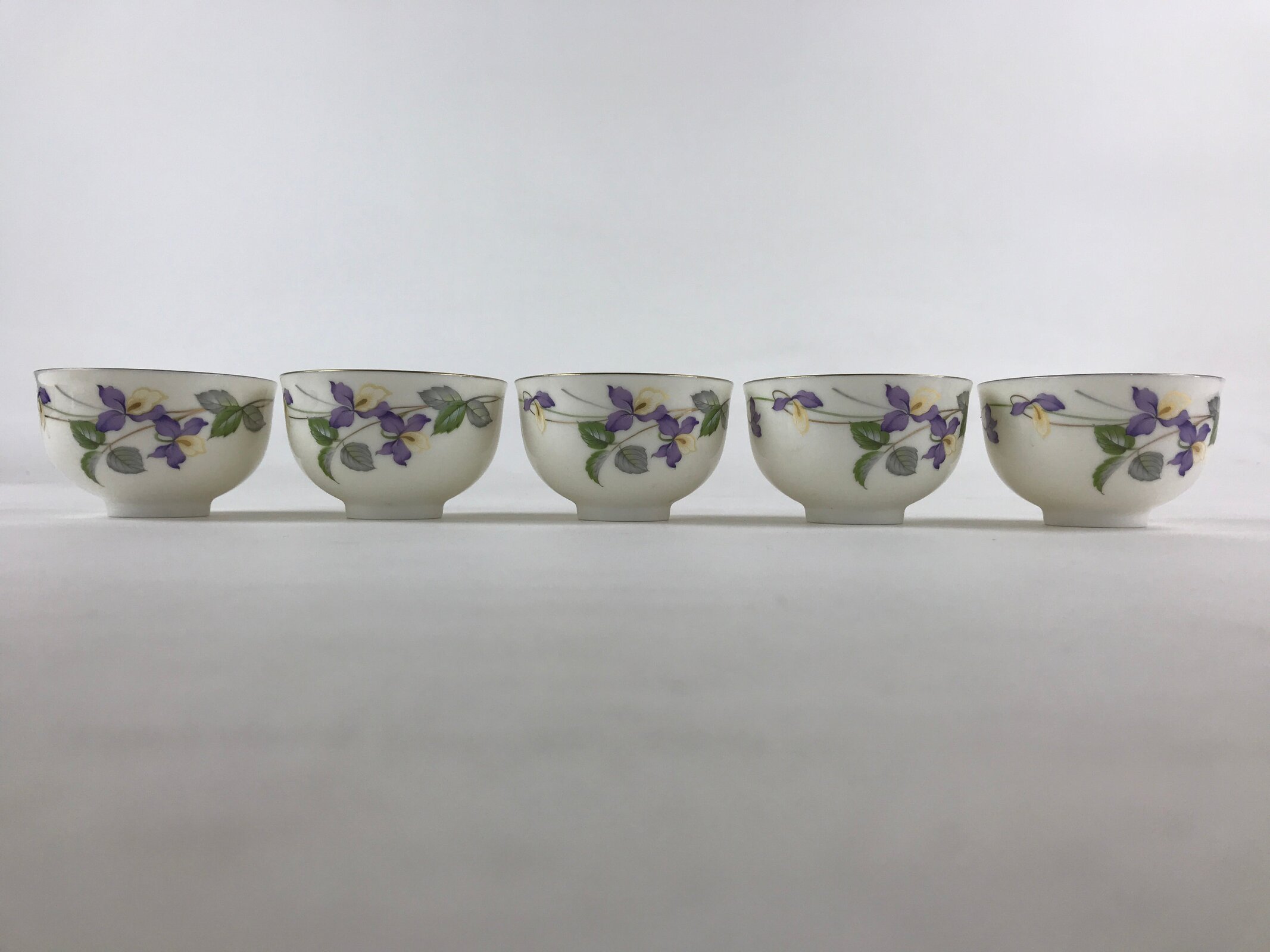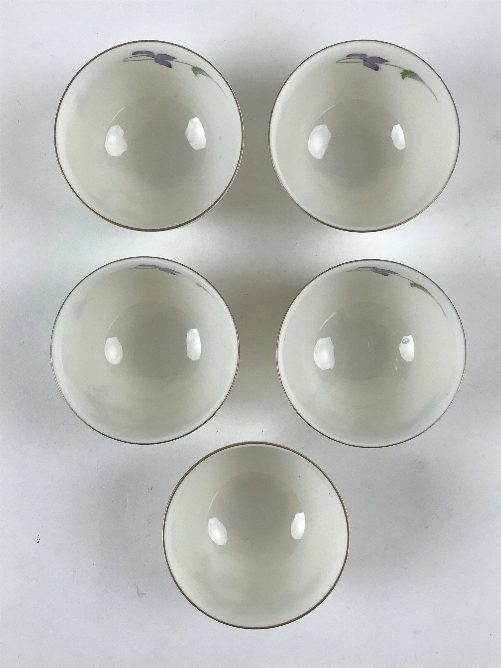 This set of five vintage Japanese white porcelain teacups features a purple flower decoration, plus a signature on the bottom. Perfect for enjoying a refreshing cold tea in hot summer weather.