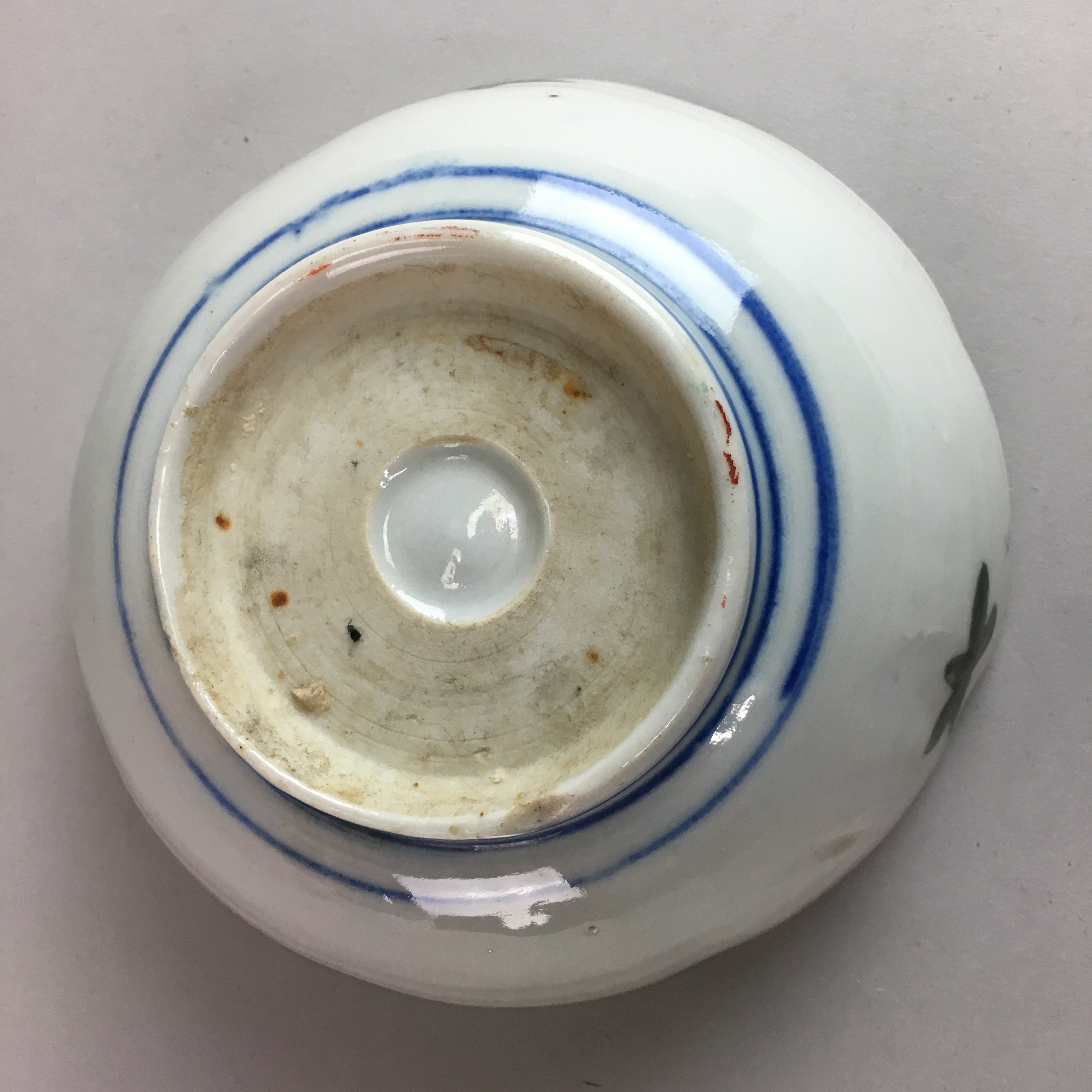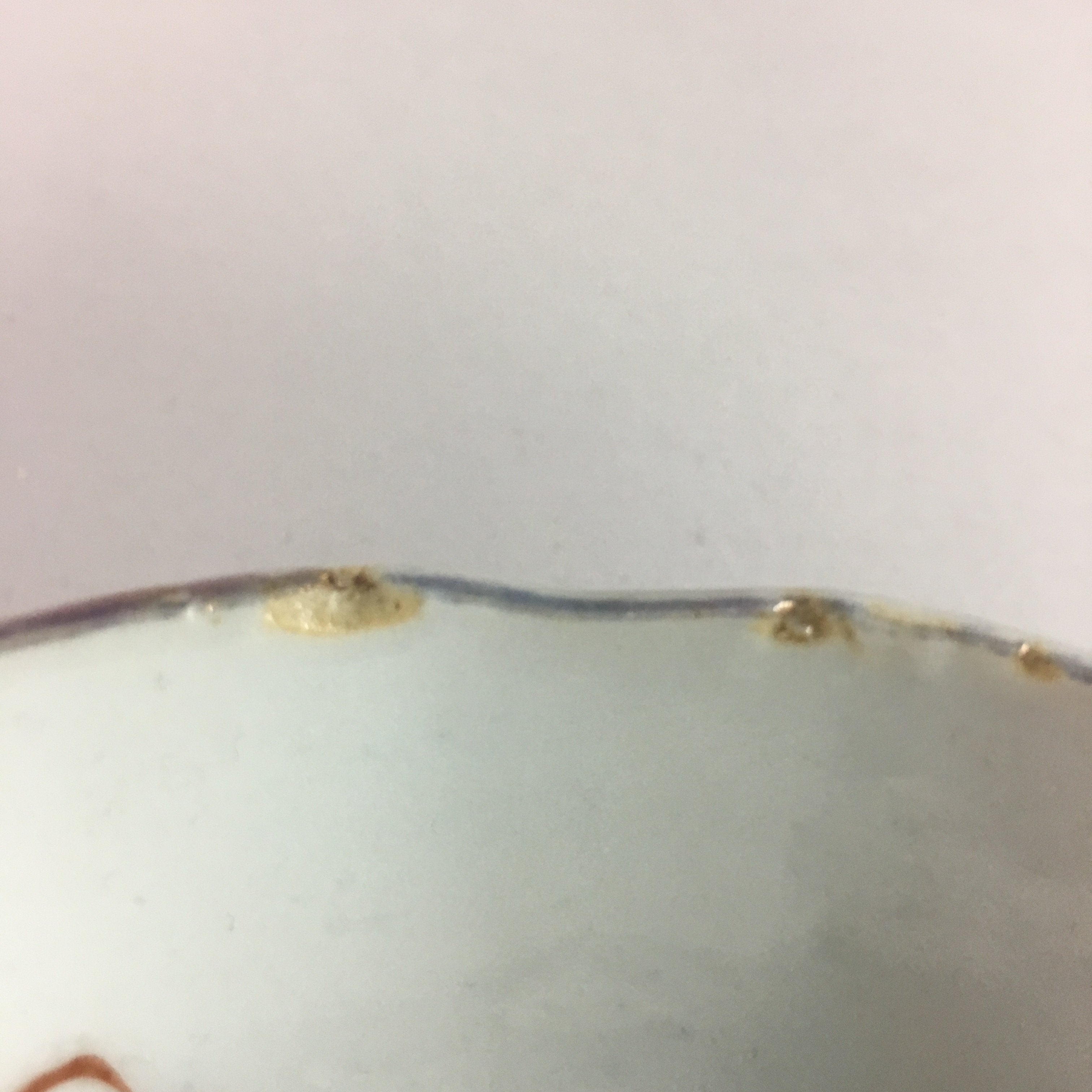- Good condition considering its age. The imperfection of painting. Small porcelain piece attached inside. Chip on the bottom. Wear and tear due to the age. Please see the photos carefully.