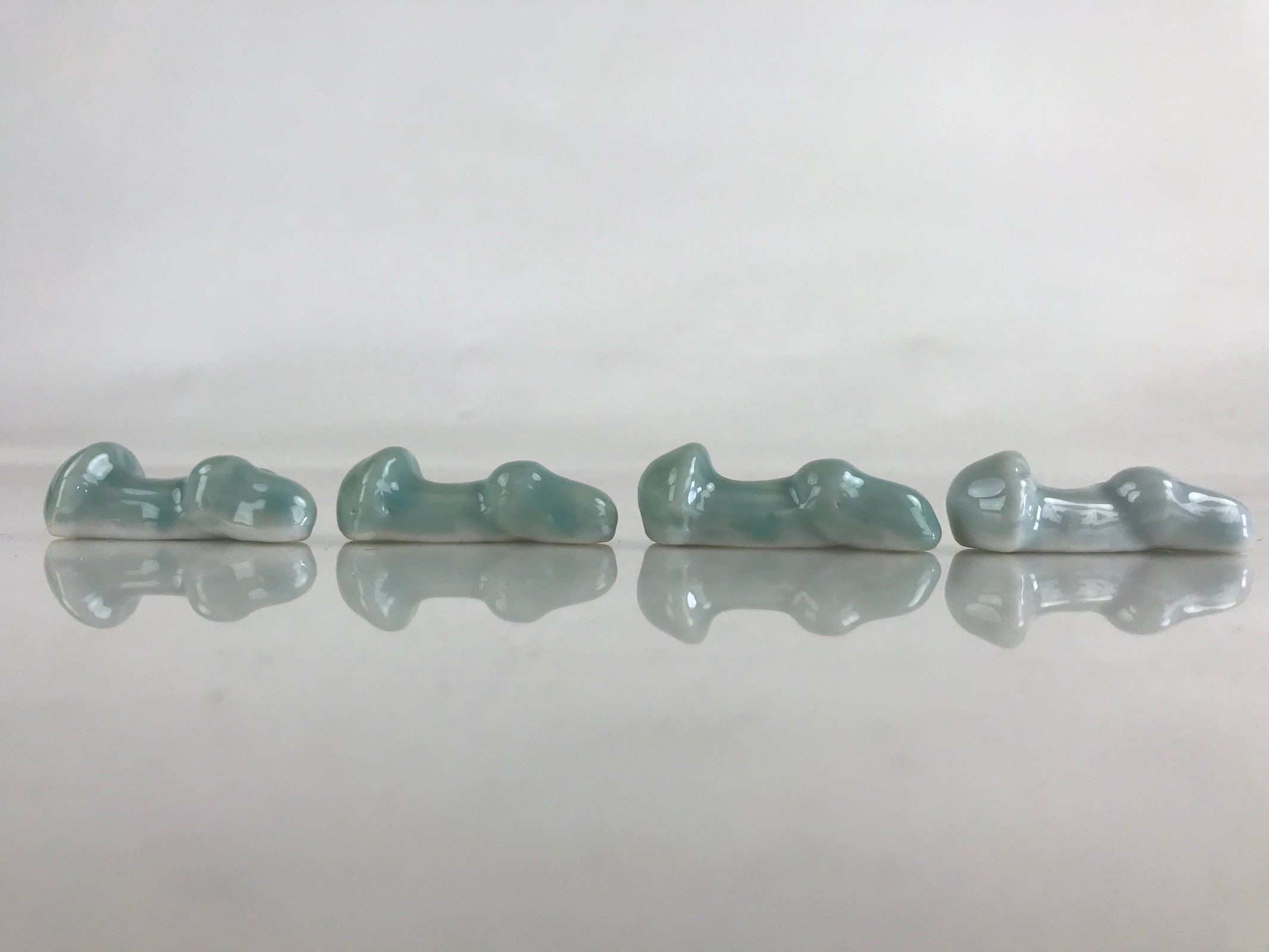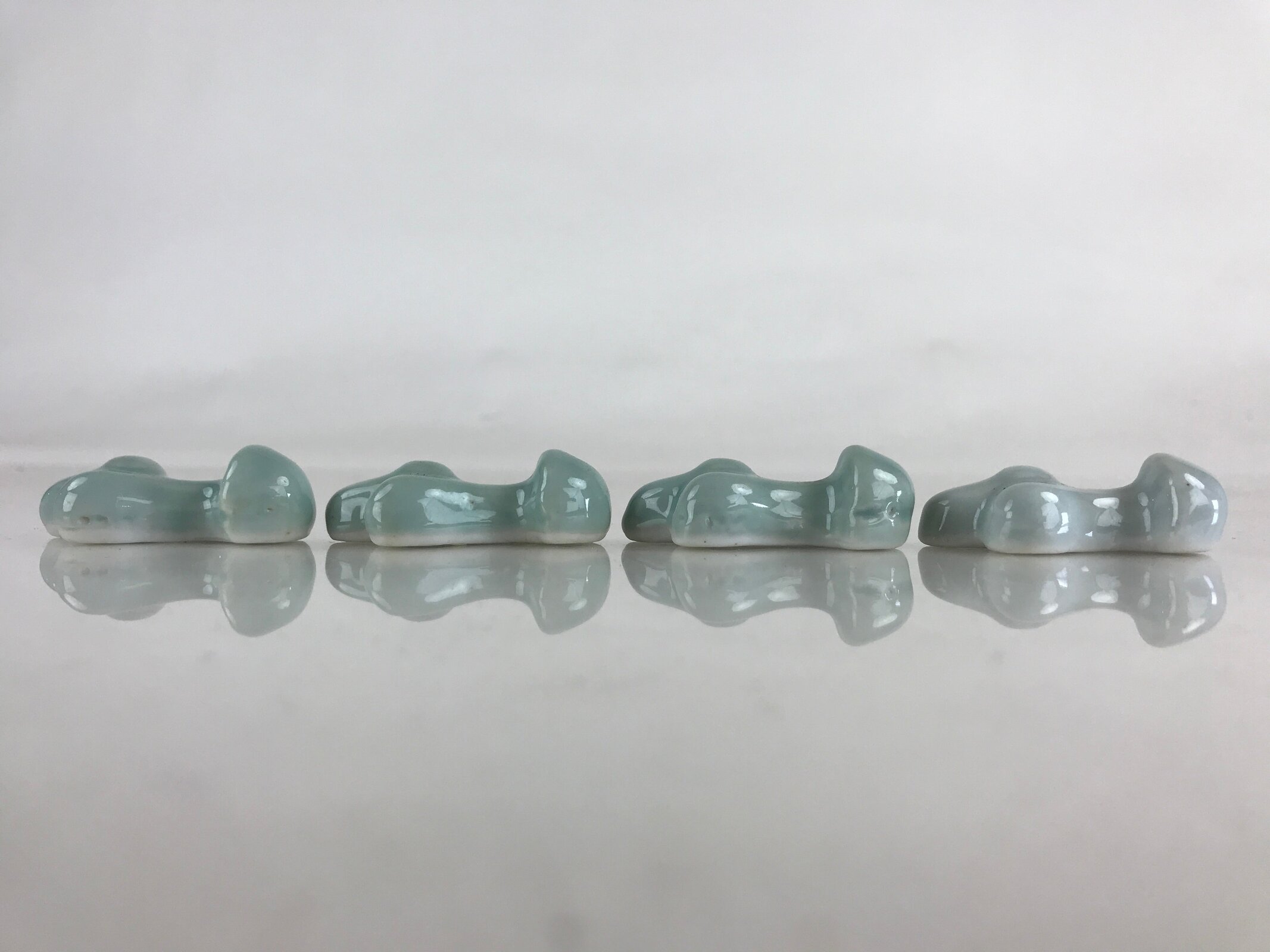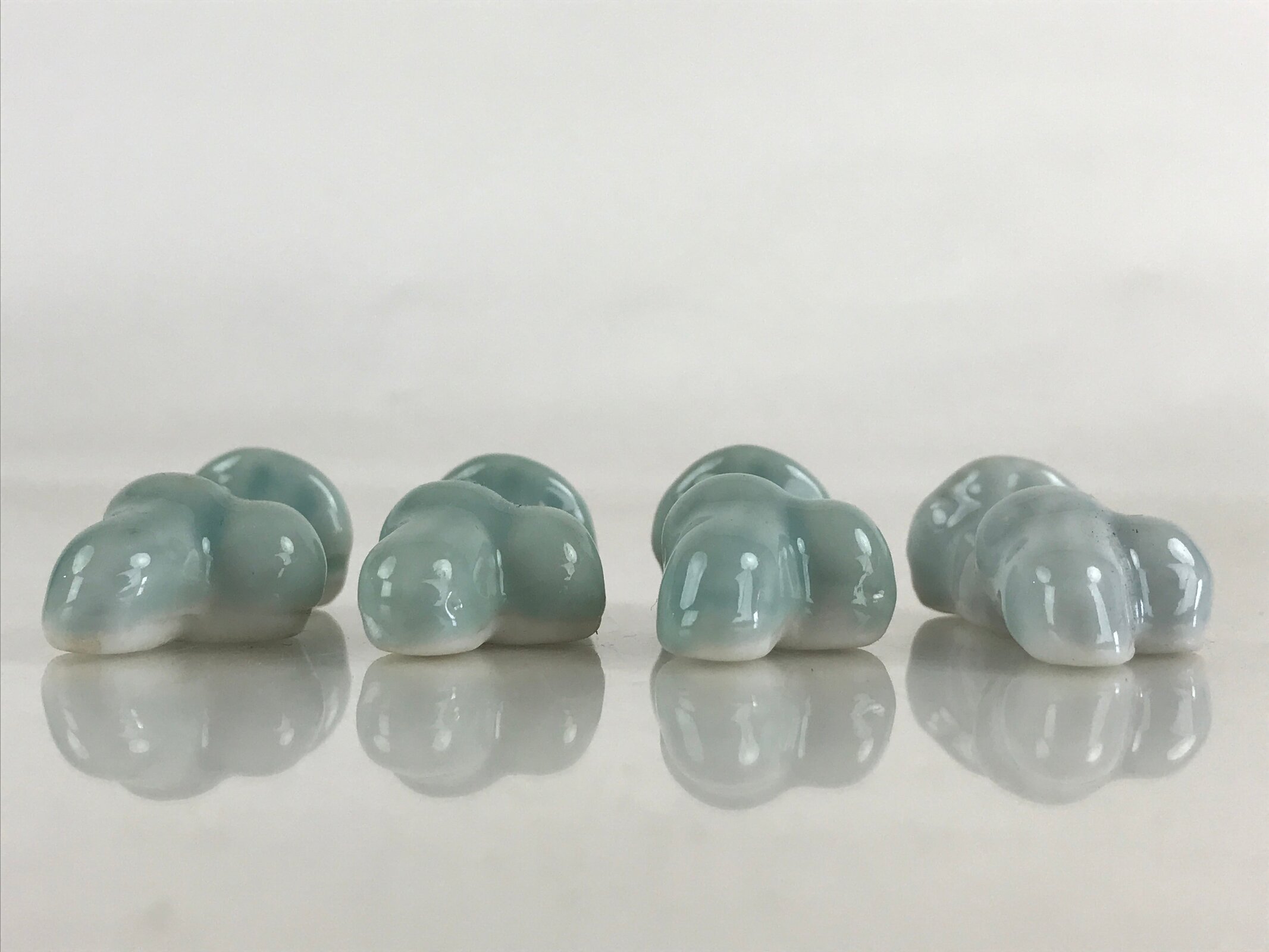 This is a Japanese set of four chopstick rests made of white porcelain. It is light blue and has the shape of a mushroom. In Japanese, it is called a Hashioki (chopstick rest). It means Hashi is chopsticks, and Oki is to place or put.