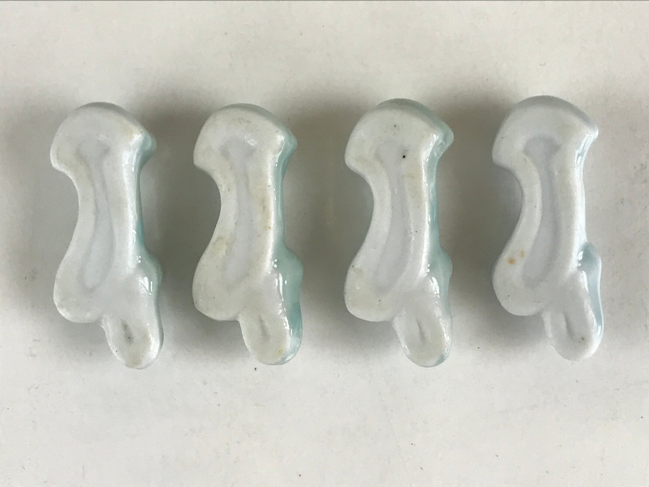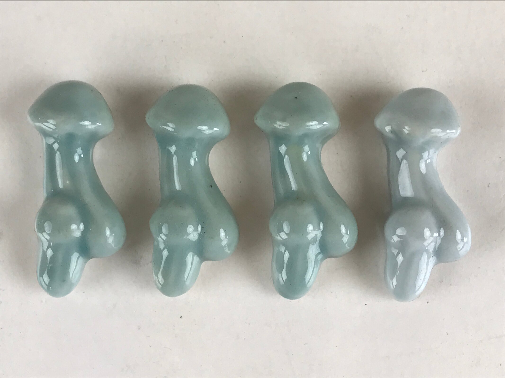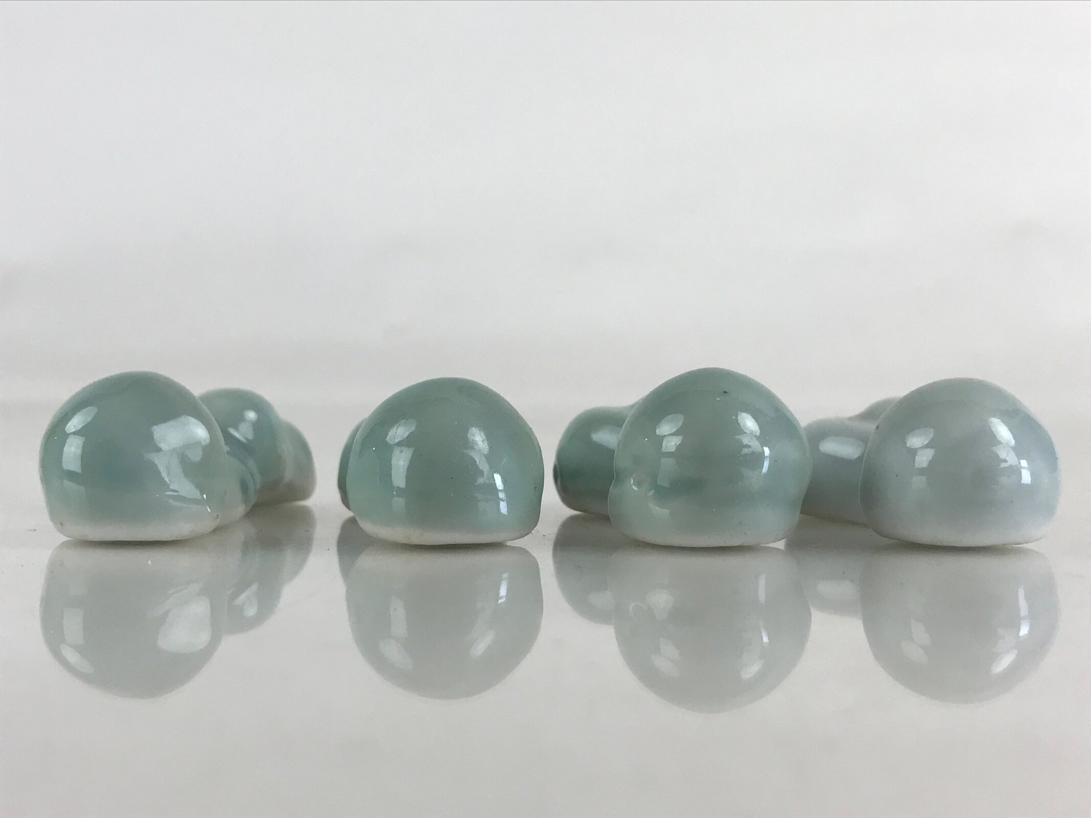 This is a Japanese set of four chopstick rests made of white porcelain. It is light blue and has the shape of a mushroom. In Japanese, it is called a Hashioki (chopstick rest). It means Hashi is chopsticks, and Oki is to place or put.