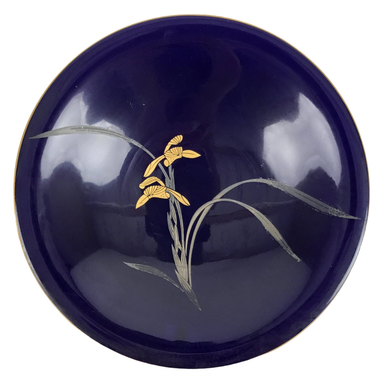 This is a vintage Japanese porcelain decorative serving plate (sara). It is a gorgeous cobalt blue with a gold painted rim. At the center are two iris blooms with silvery leaves. This medium-sized plate has slightly raised sides and is an excellent choice for serving stylized dishes, salads, or sashimi. It can also be used as a display piece.