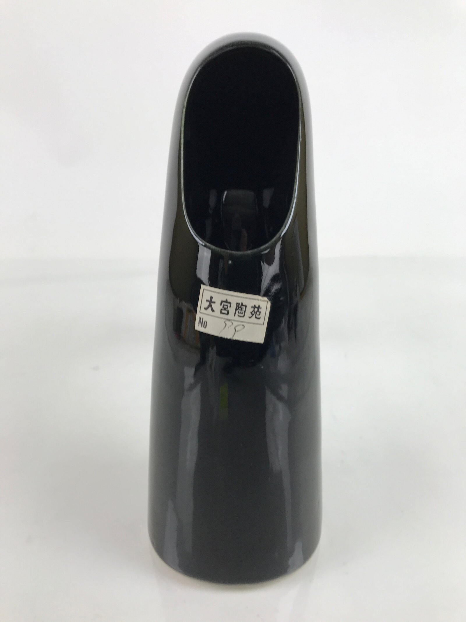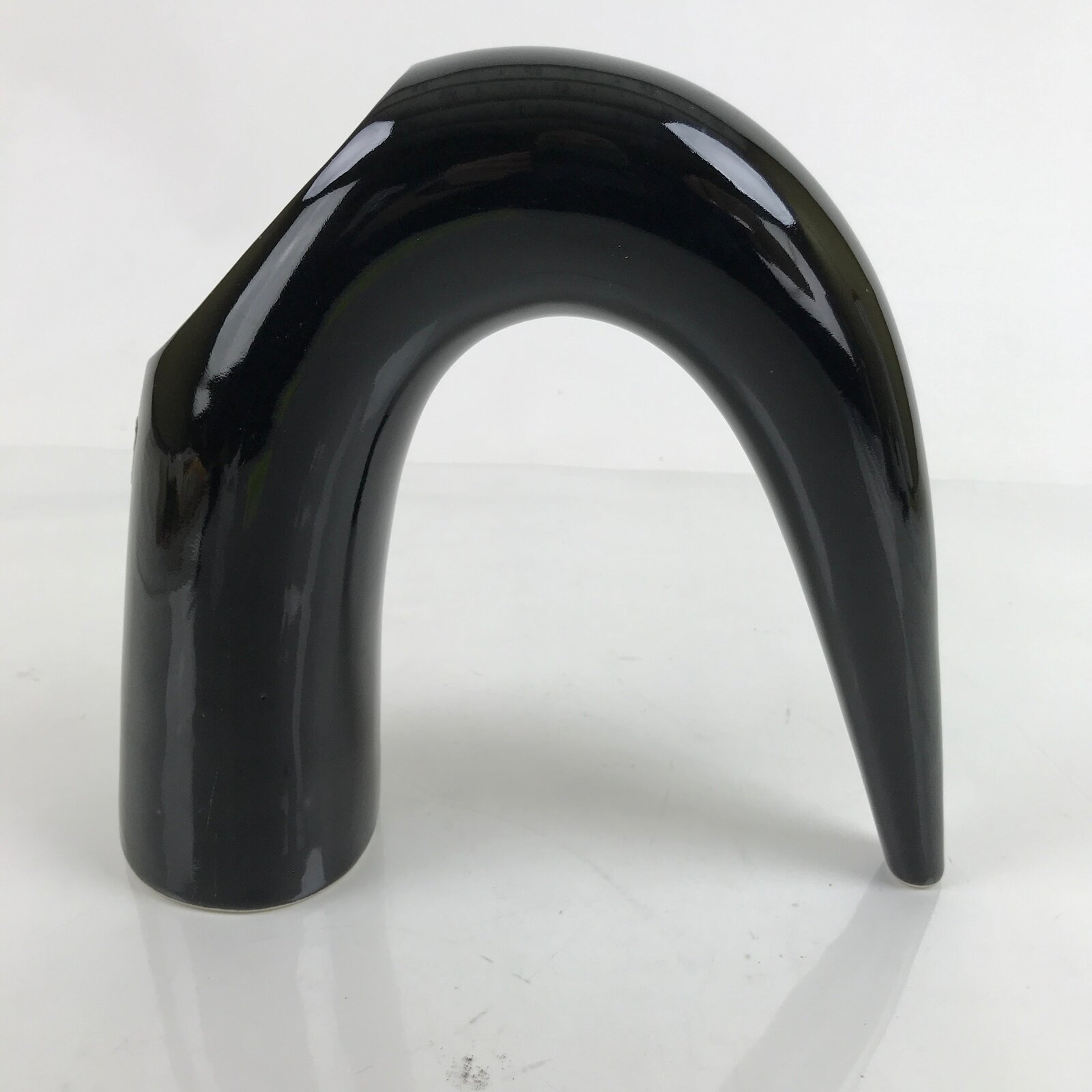 This is a vintage Japanese porcelain flower vase, or kabin. This vase is black and has a very unique upside down horn arch shape. The opening is an oval shape that is cut from the side. It can be used for all types of flower arrangements both ikebana and casual.