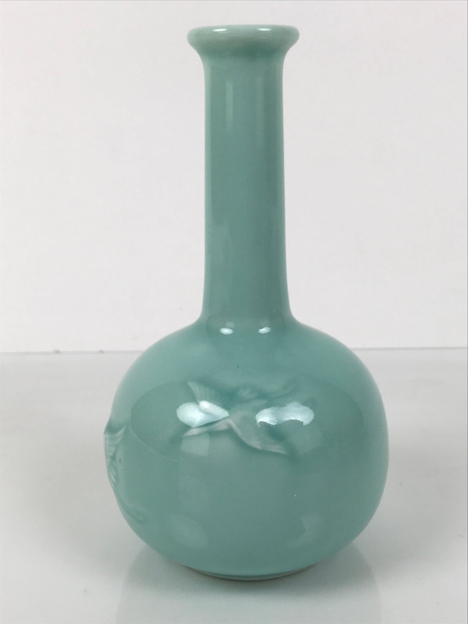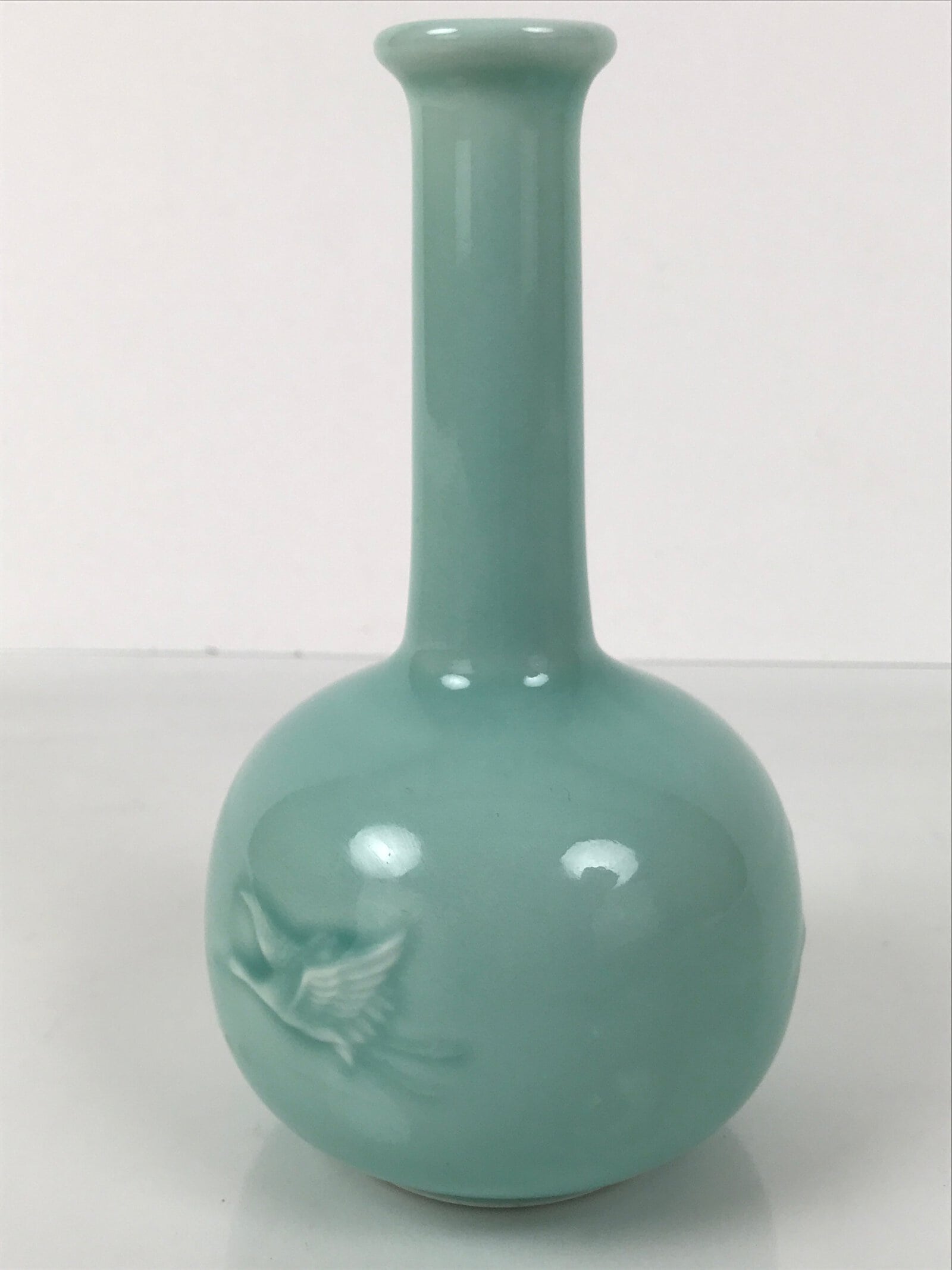 This is a vintage Japanese porcelain pottery flower vase, or kabin. This lightweight, classic-shaped vase has a milky light blue celadon glaze with three embossed flying cranes. It can be used for all types of flower arrangements, both ikebana and casual, and also as a statement piece.