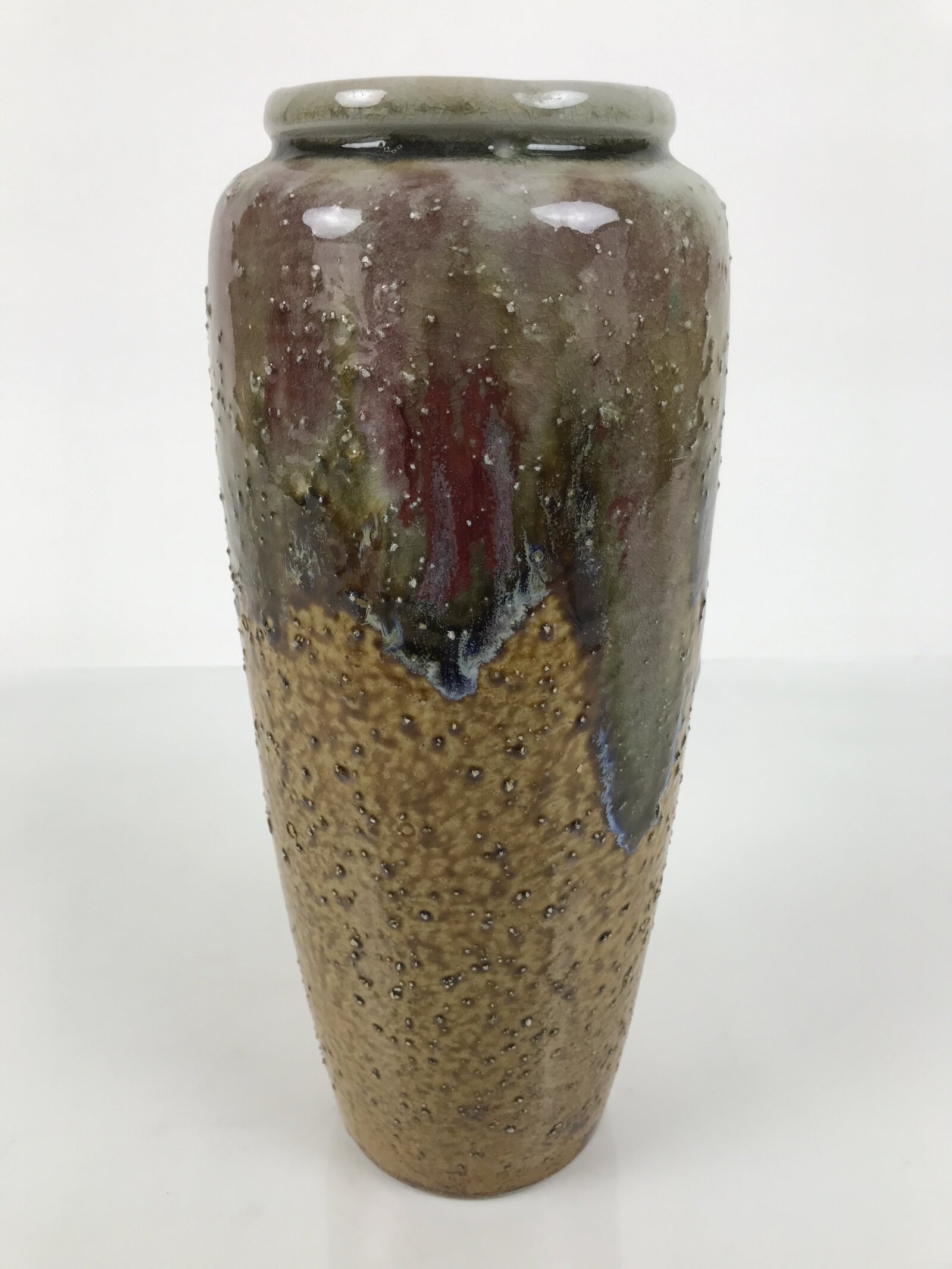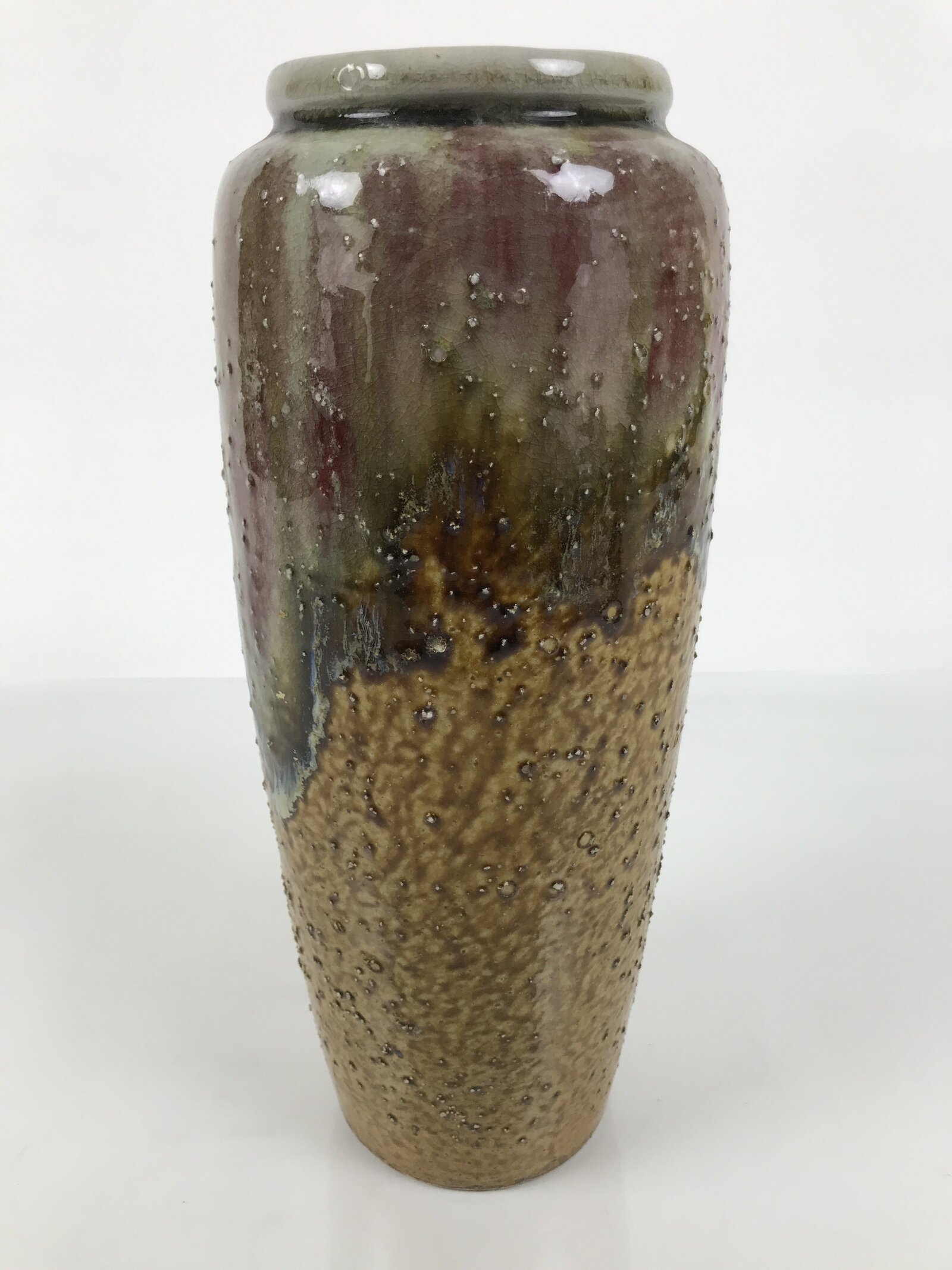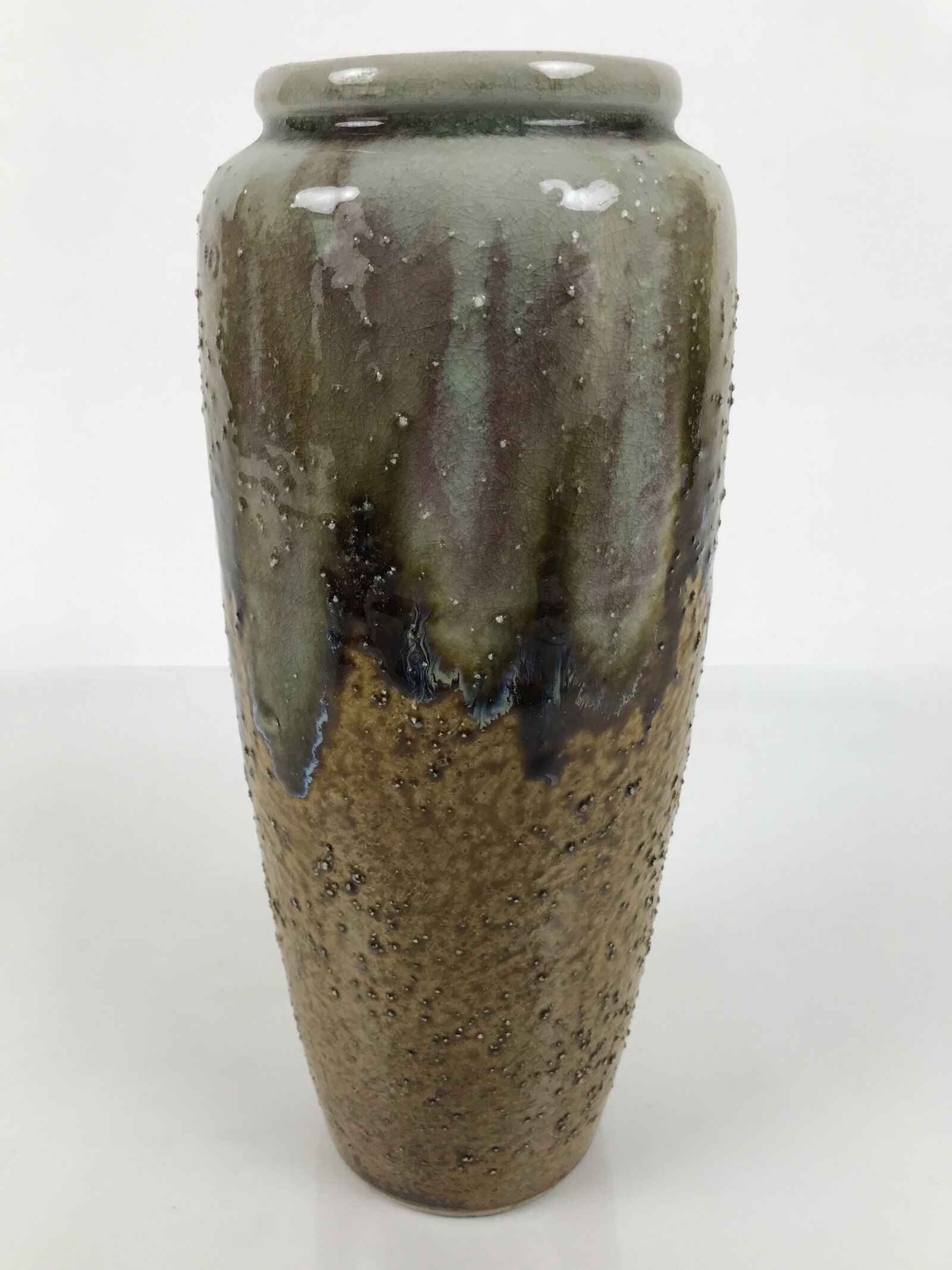 This is a vintage Japanese porcelain flower vase, or kabin. This vase is brown and greenish-gray, with a tapered cylindrical shape. It features a speckled texture and a natural glaze from the firing process. It can be used for all types of flower arrangements, both ikebana and casual, and also as a statement piece.