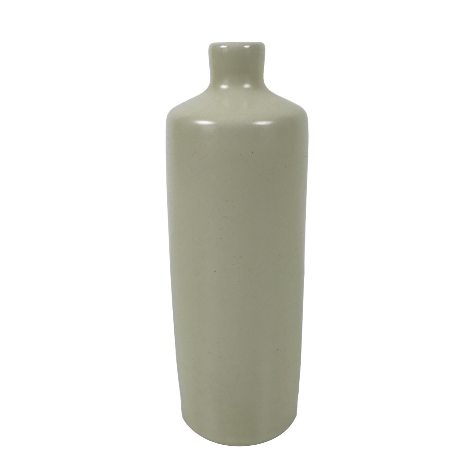 This is a vintage Japanese porcelain flower vase, or kabin. This vase, shaped like a cylindrical bottle, has a milky pale yellow glaze. It is tall and has a short and narrow neck. It can be used for all types of flower arrangements, both ikebana and casual, and also as a statement piece.