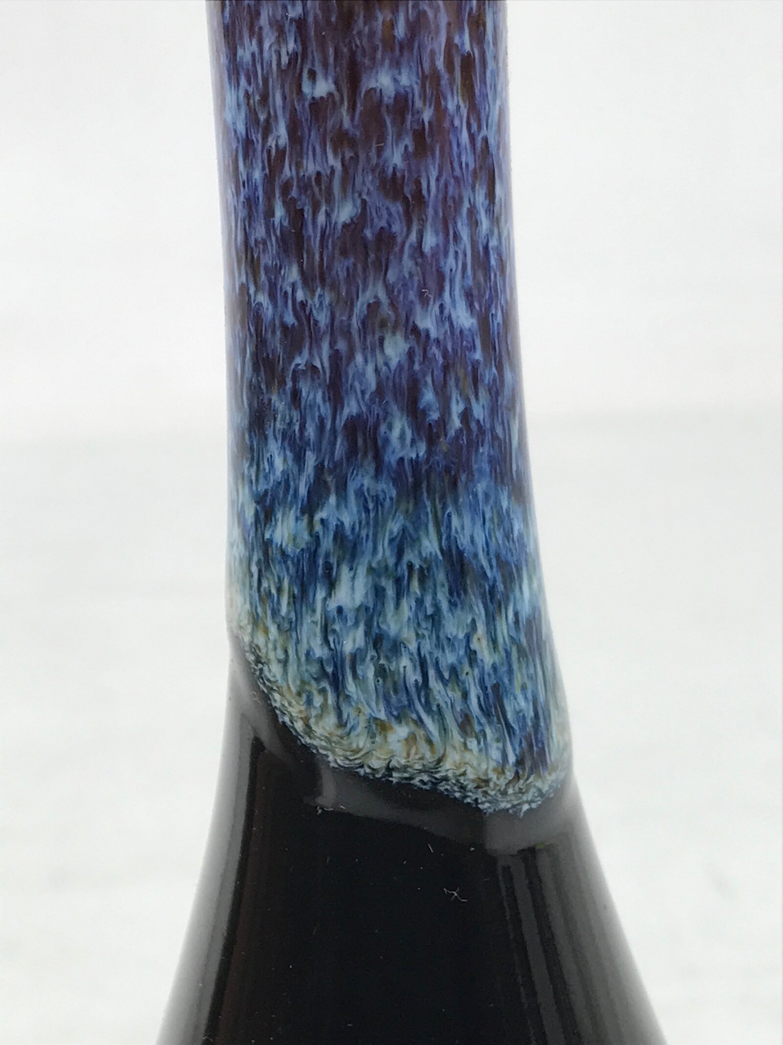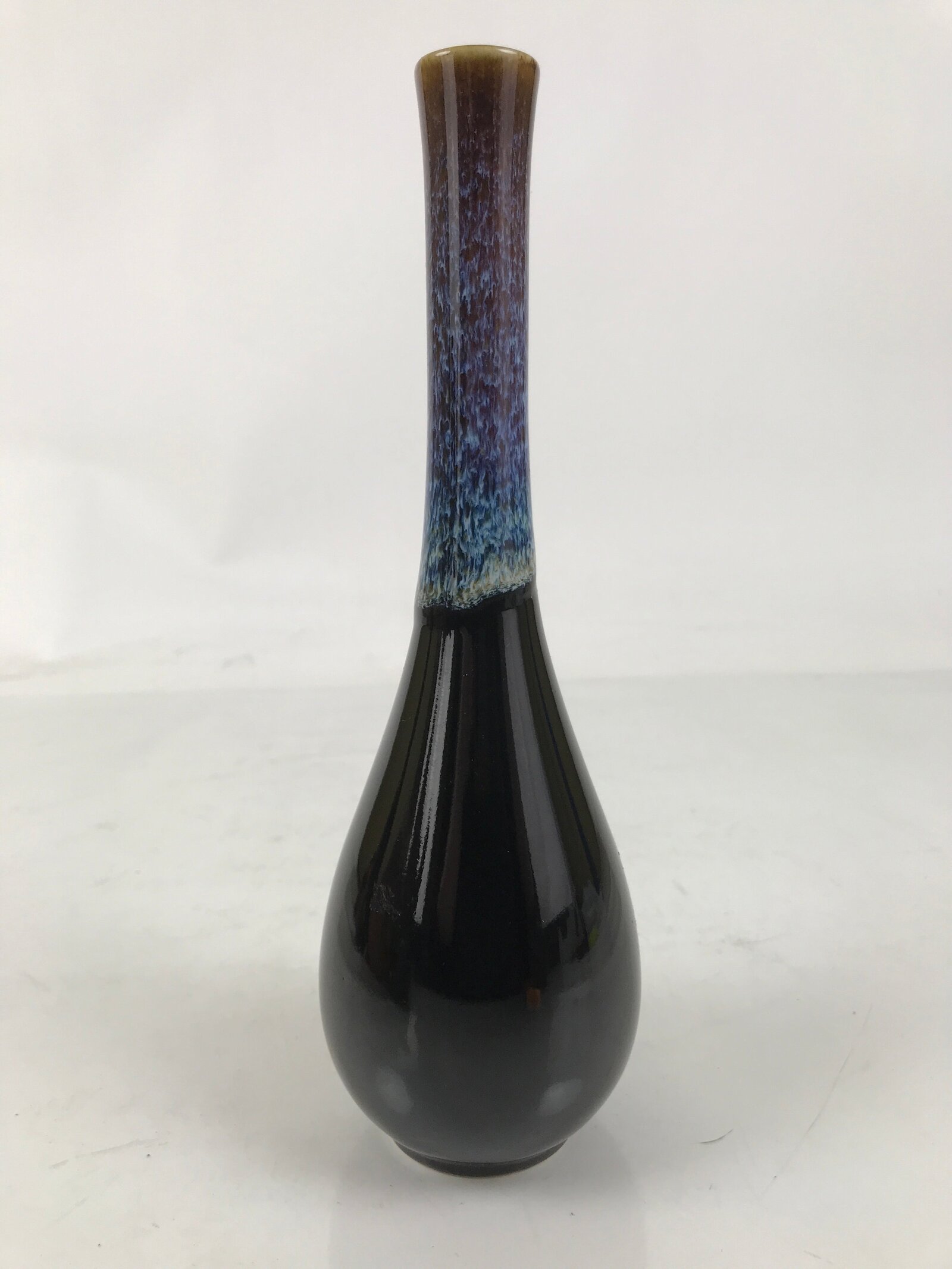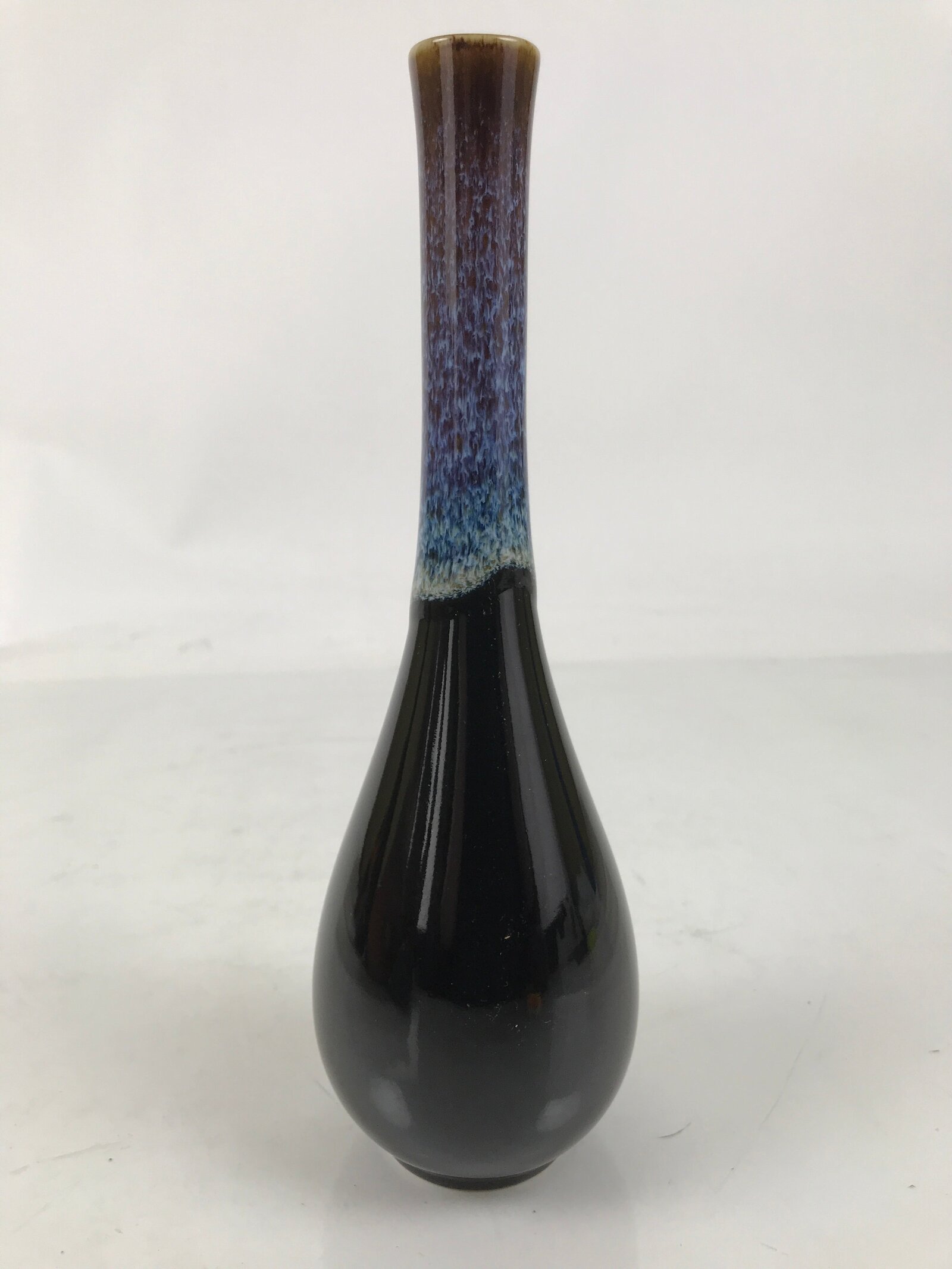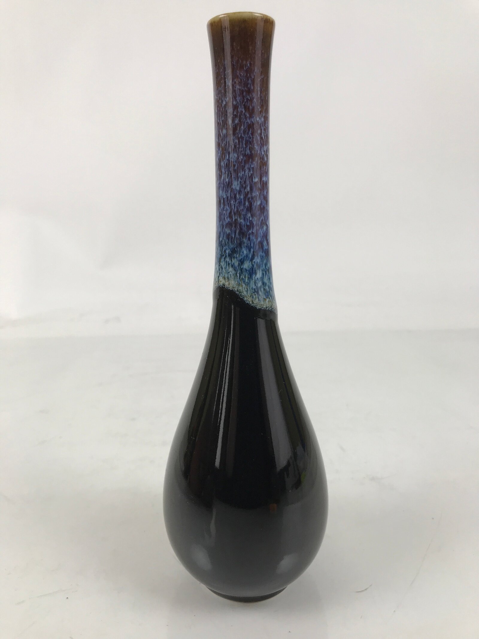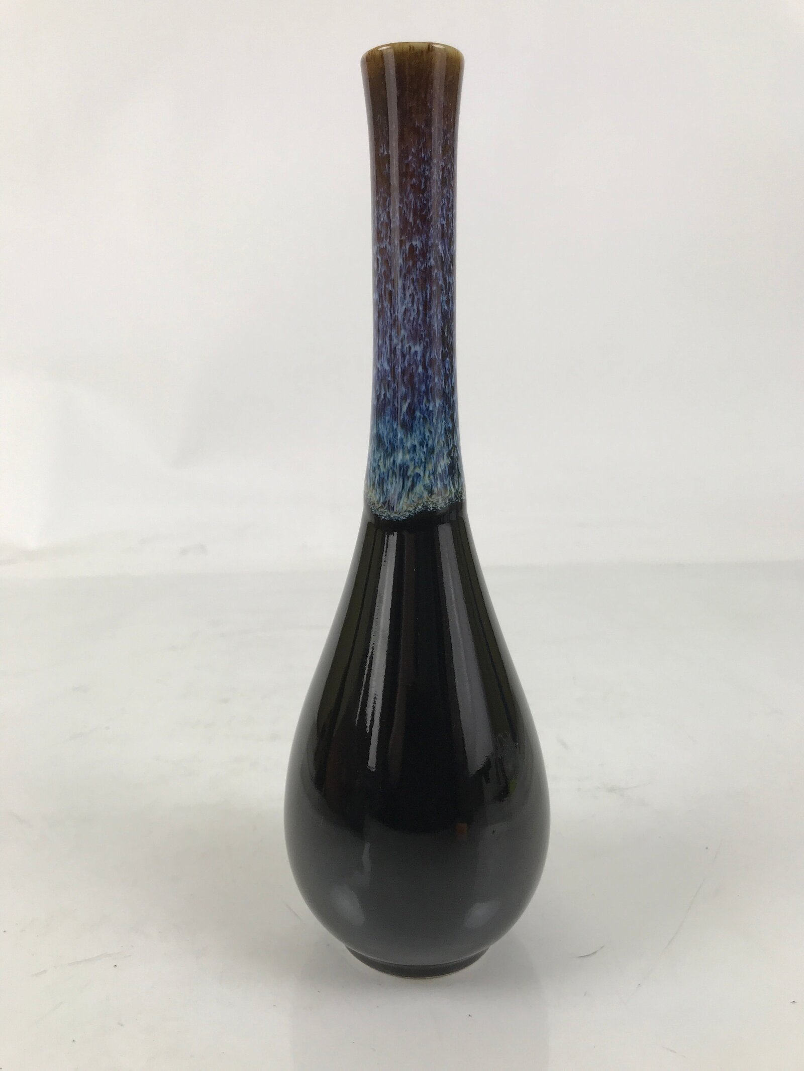 This is a vintage Japanese porcelain flower vase, or kabin. This crane-neck vase has a black base with a blue, white, and brown karatsu glaze on the neck. It is tall and skinny, an excellent choice for a simple single flower or floral branch. It can be used for all types of flower arrangements both ikebana and casual.