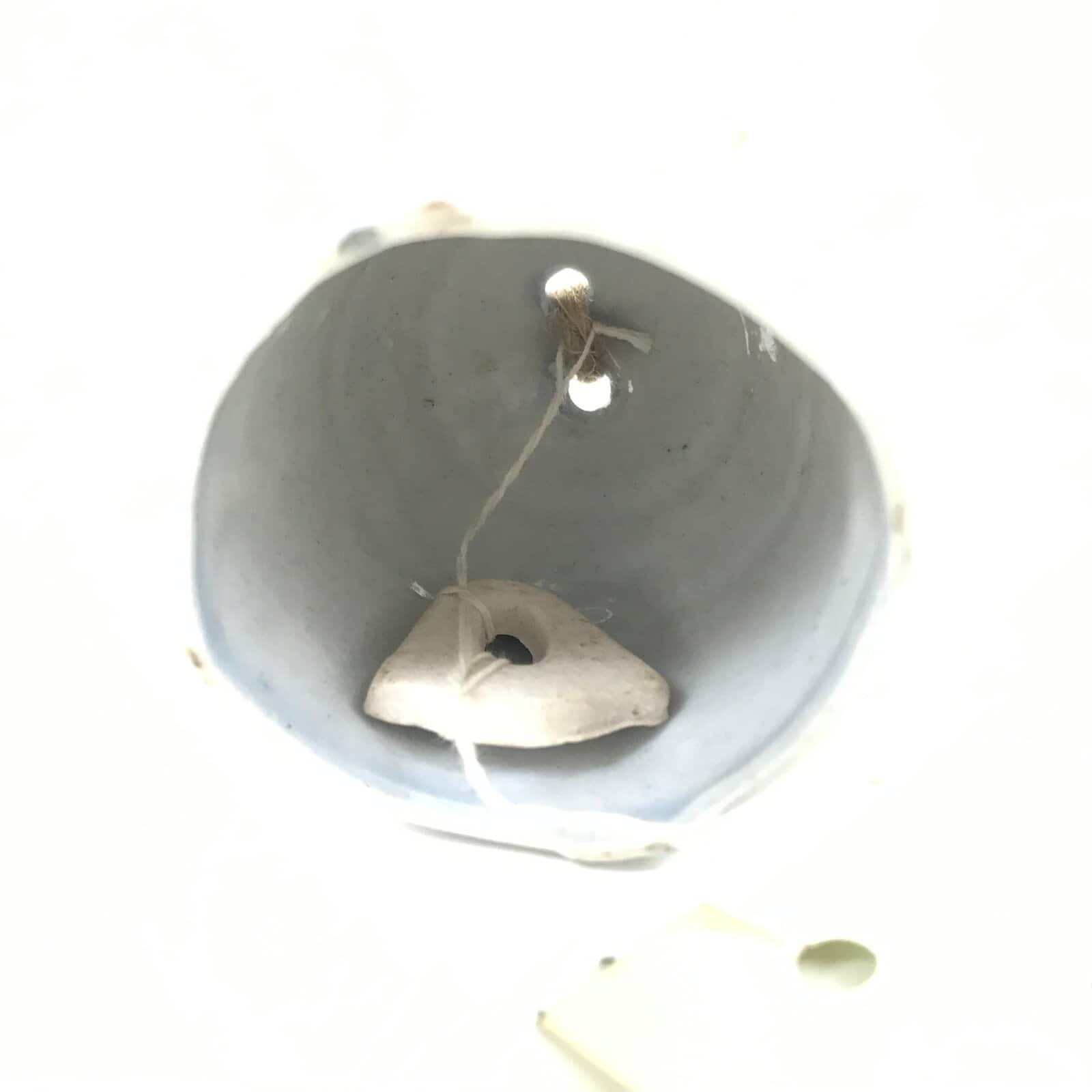 This is a vintage Japanese porcelain wind chime, Furin. This blue porcelain bell is shaped like a bell. The pale green paper has Kanji characters. It can be used as a room decoration or an ornament.