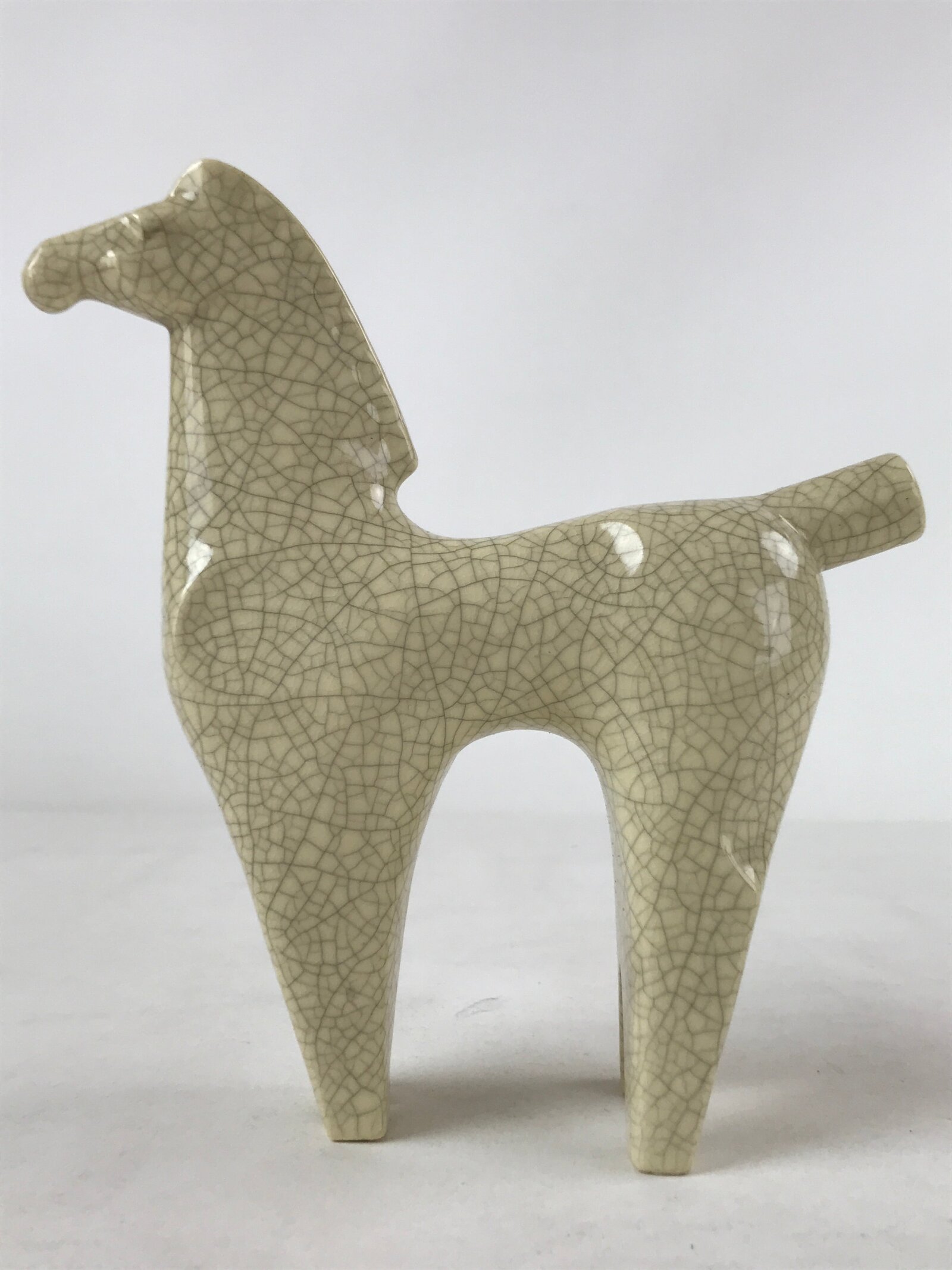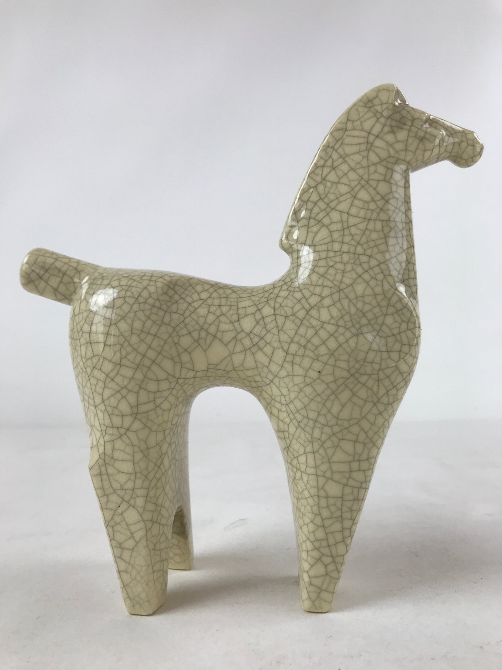 This is a vintage porcelain horse figurine. It represents the zodiac. The design is very angular with a beige glaze with gray crackles for accent. It stands very sturdy on a flat surface despite its narrow base. This is an excellent subtle decor item.