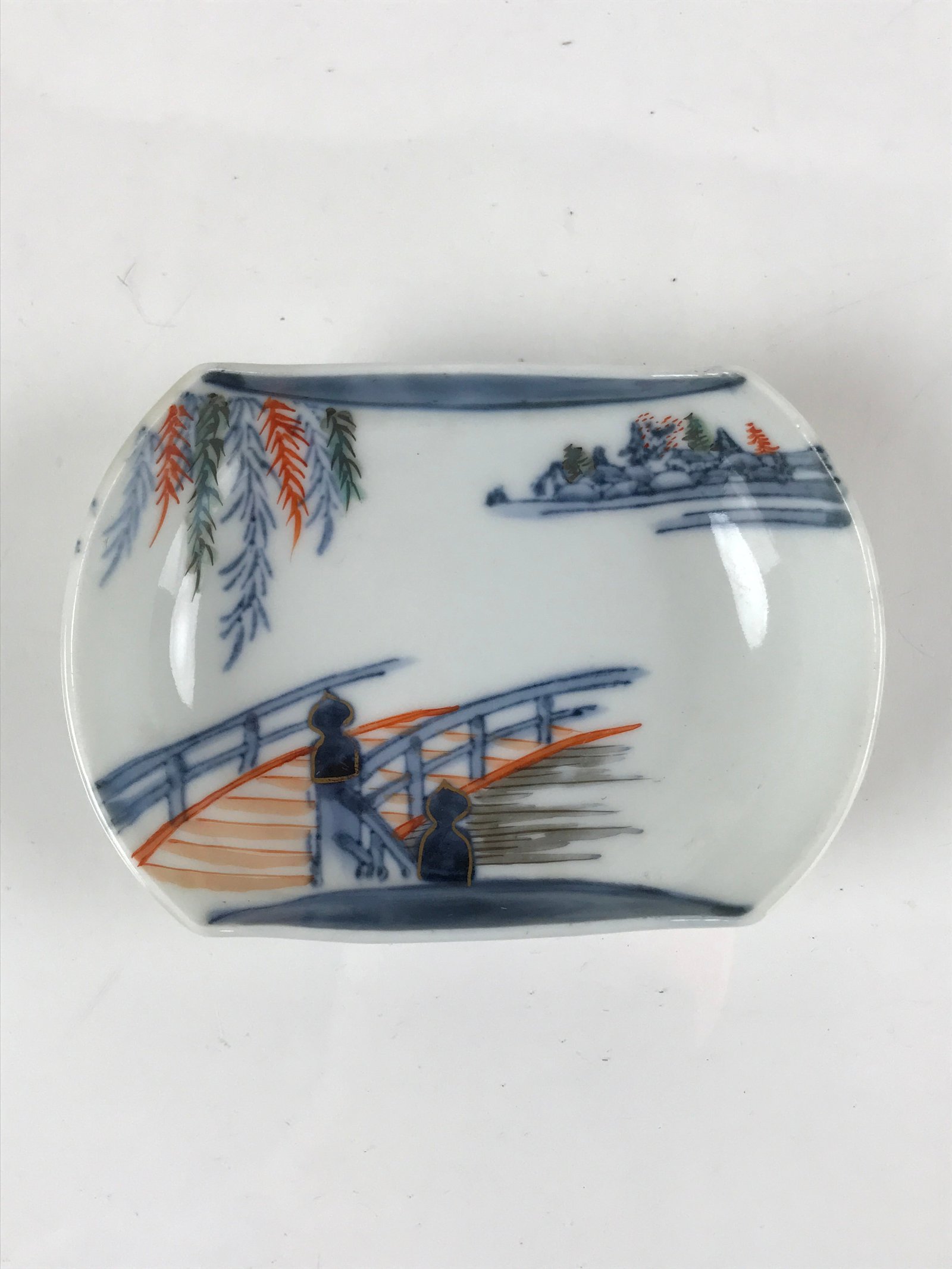 This is a vintage Japanese porcelain plate. This uniquely-shaped, small plate with lifted sides, also called mamezara, is white, blue, red, and gold with a beautifully hand-painted scene of a garden or temple bridge with some hanging leaves and trees in the background. Mamezara are tiny plates in a Japanese tableware set that typically hold dipping sauces such as soy sauce, garnishes, and other condiments. It is also the perfect size for holding small jewelry.