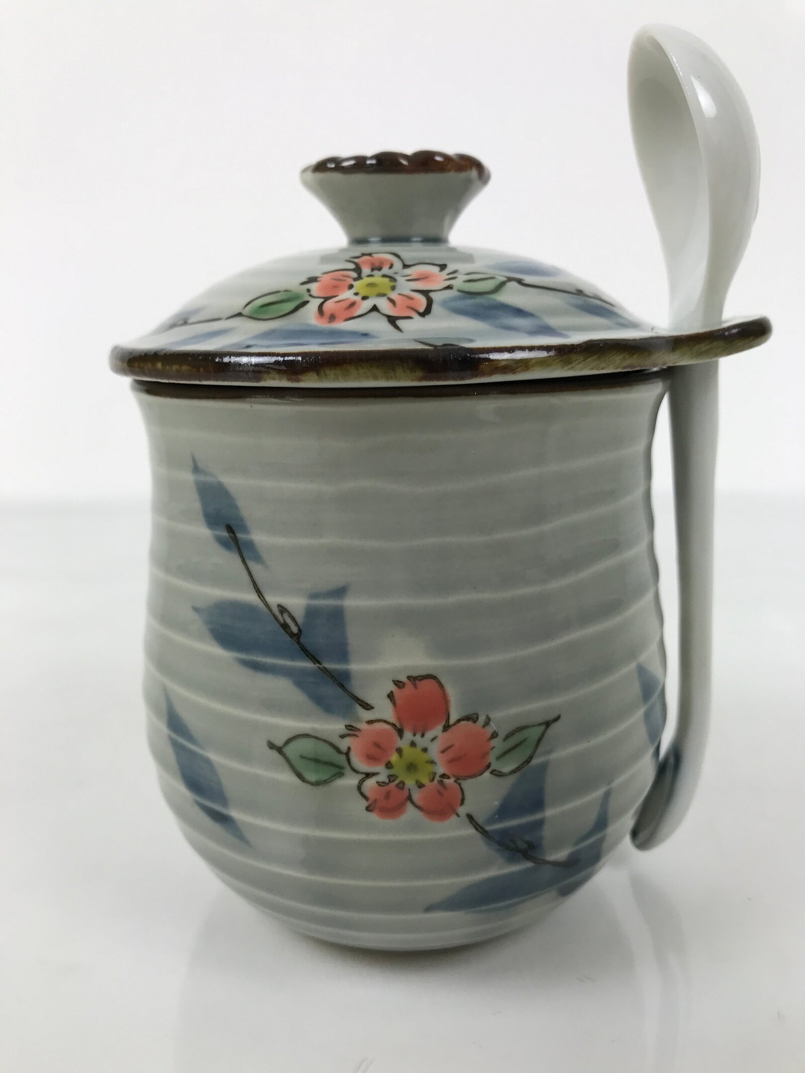 Japanese Porcelain Lidded Cup w/Spoon Pink Cherry Blossom Blue Container Y491