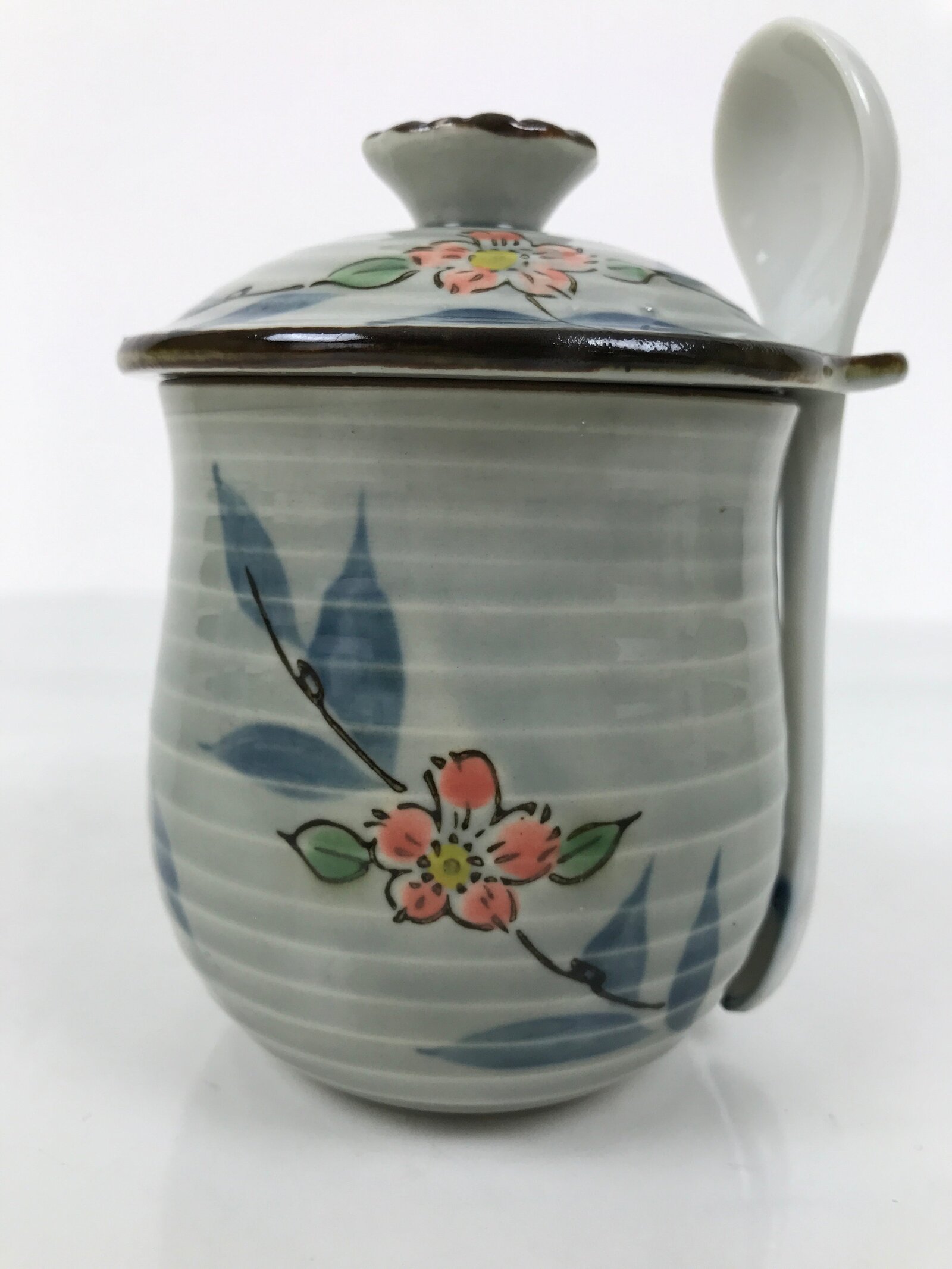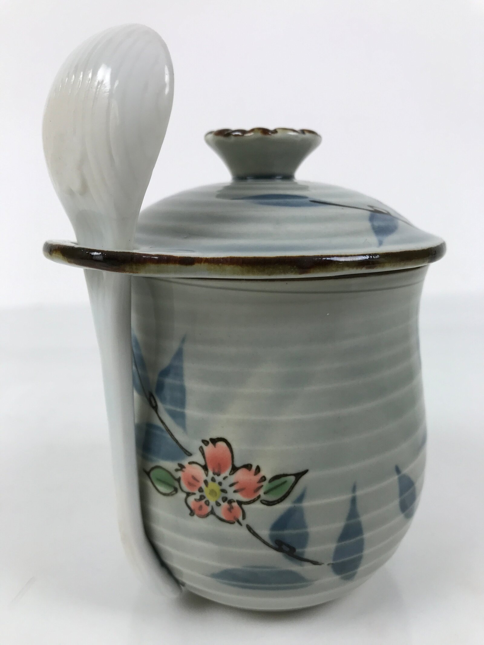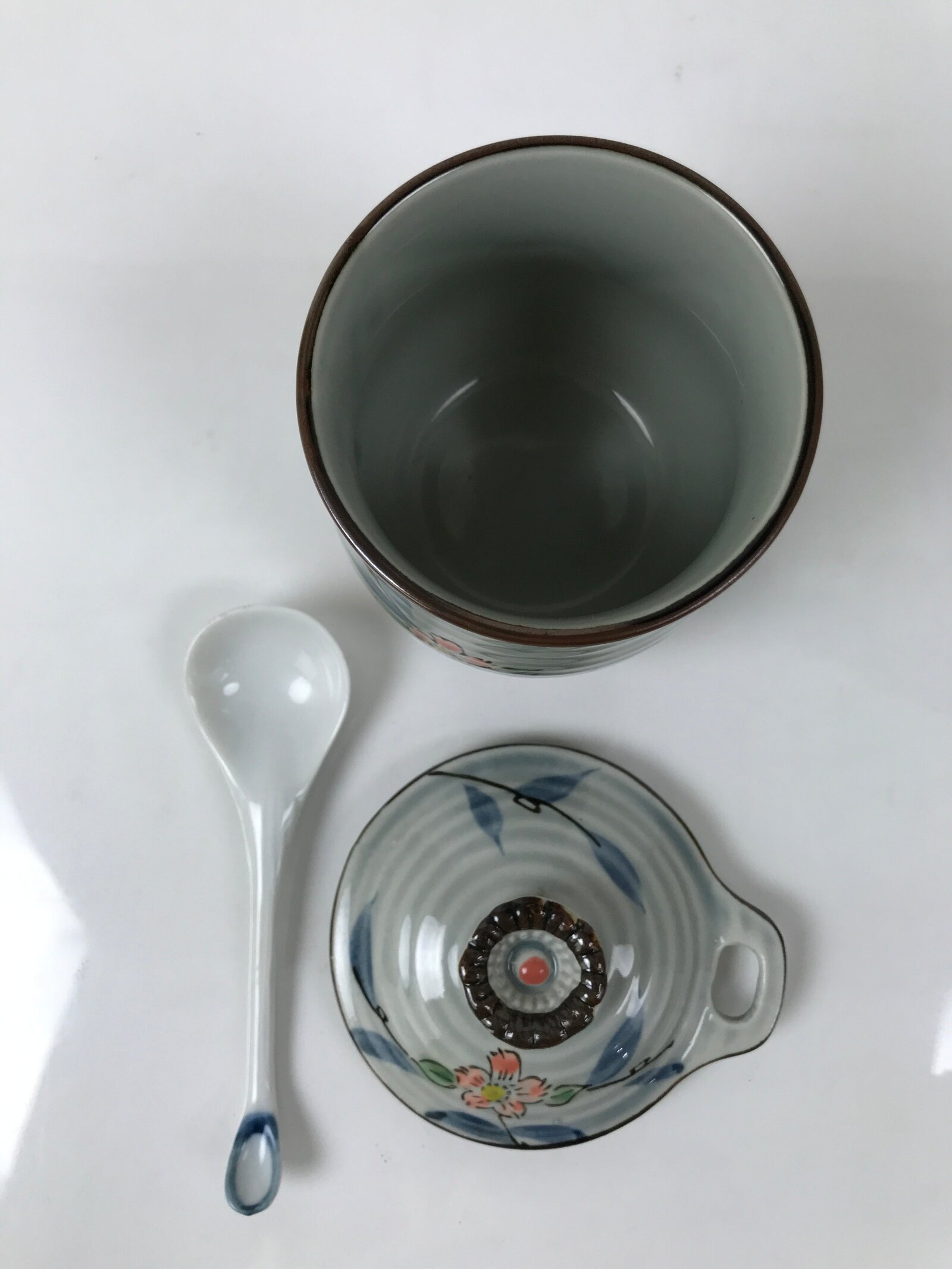 Japanese Porcelain Lidded Cup w/Spoon Pink Cherry Blossom Blue Container Y491