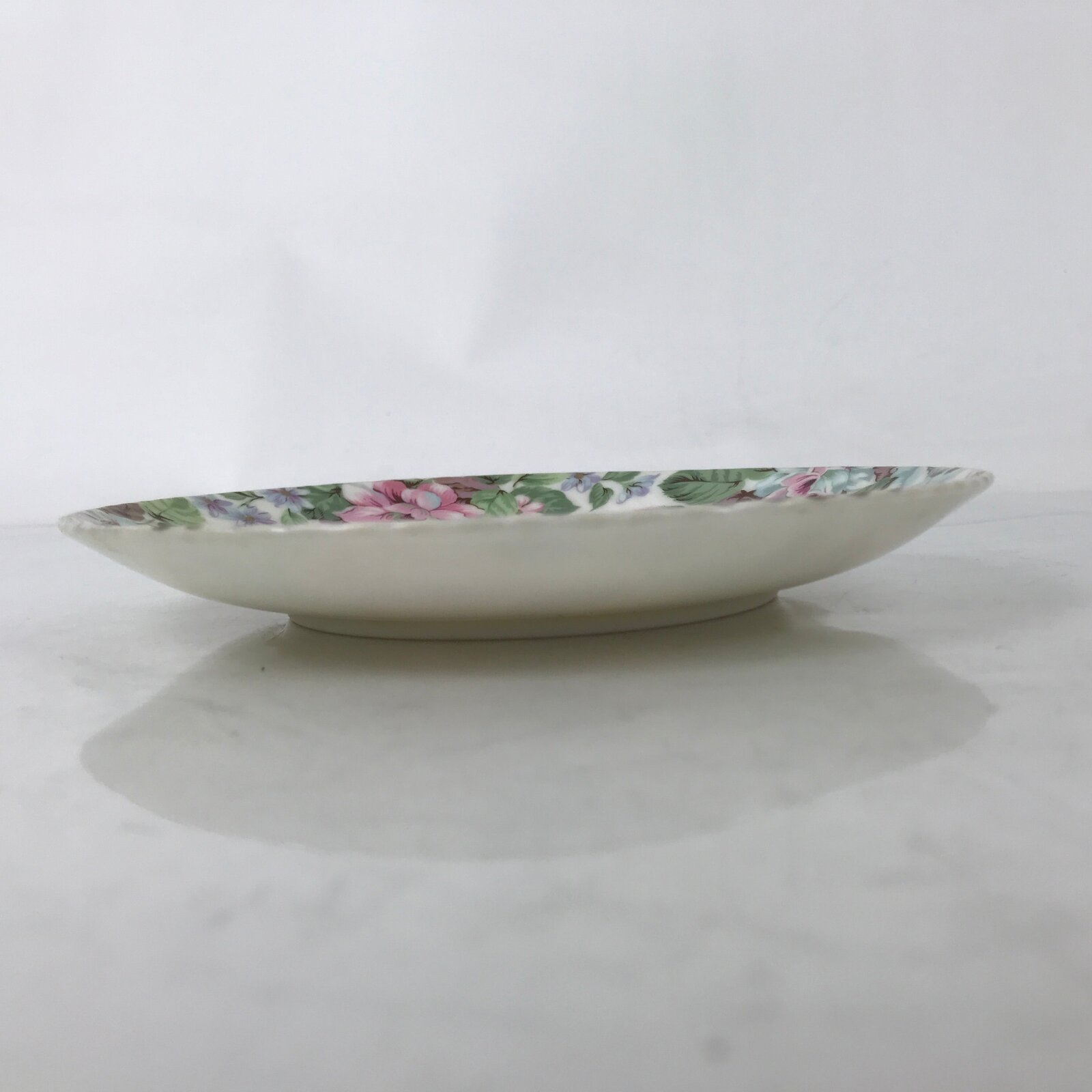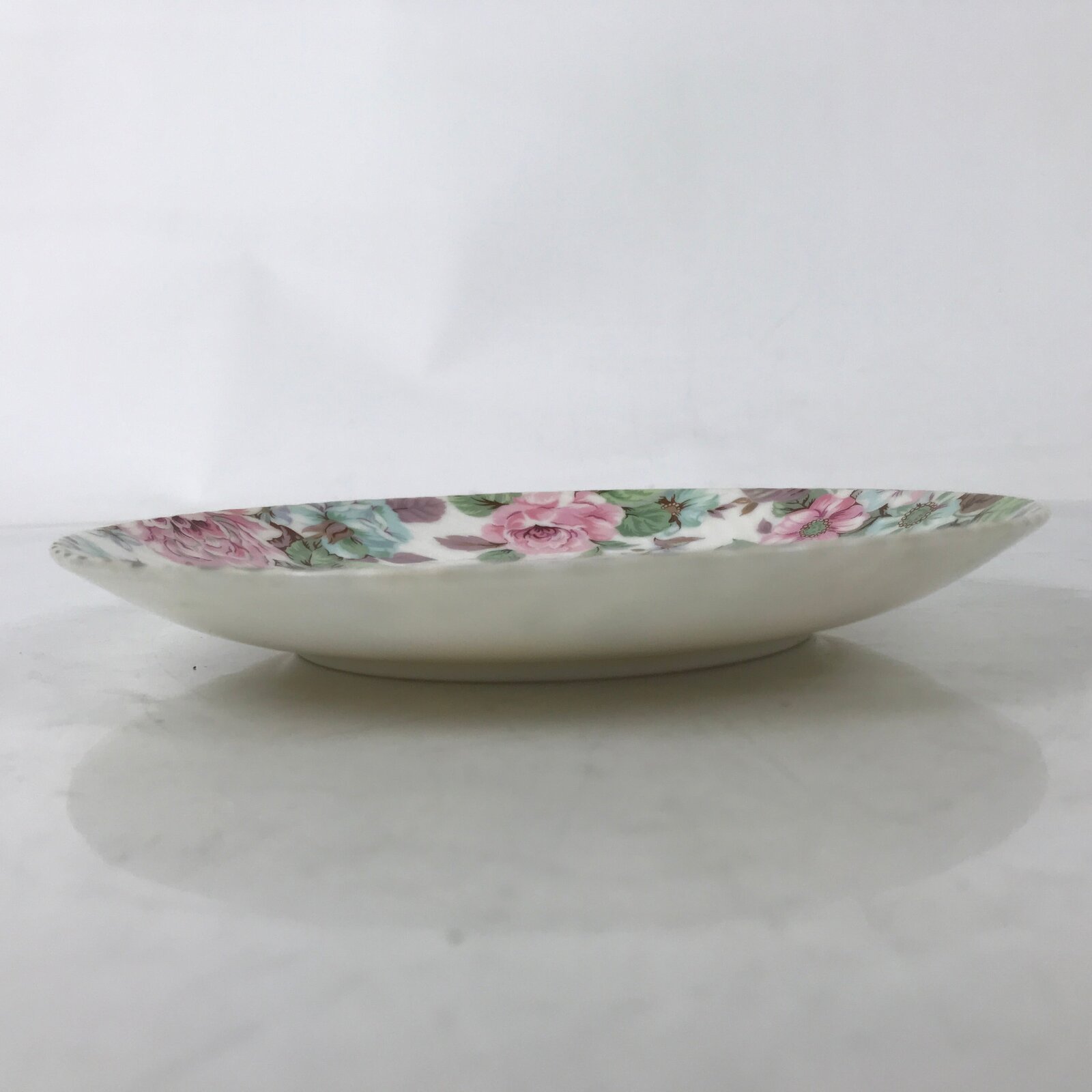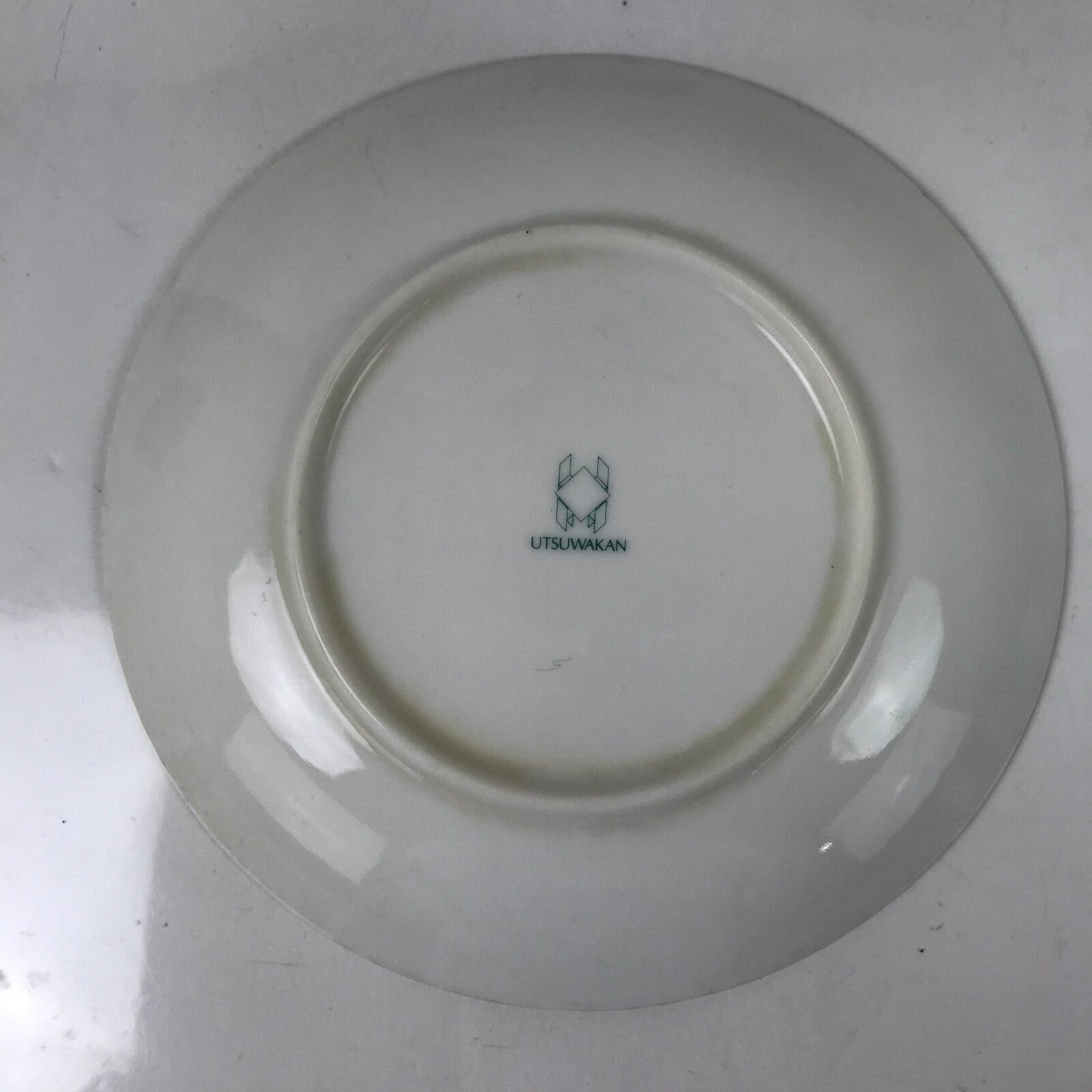 This vintage Japanese medium porcelain plate has a pink floral design with green leaves. It is round with little depth and slightly textured on the front side. This size plate is called chuzara and is good for serving side dishes, some sweets, and so on. The bottom sign Utsuwakan means a house of vessels in Japanese.