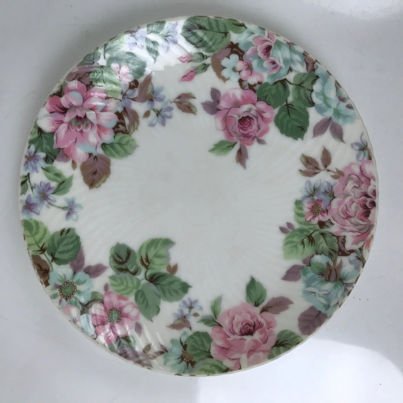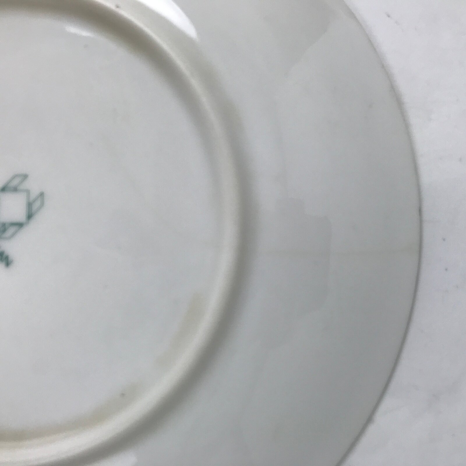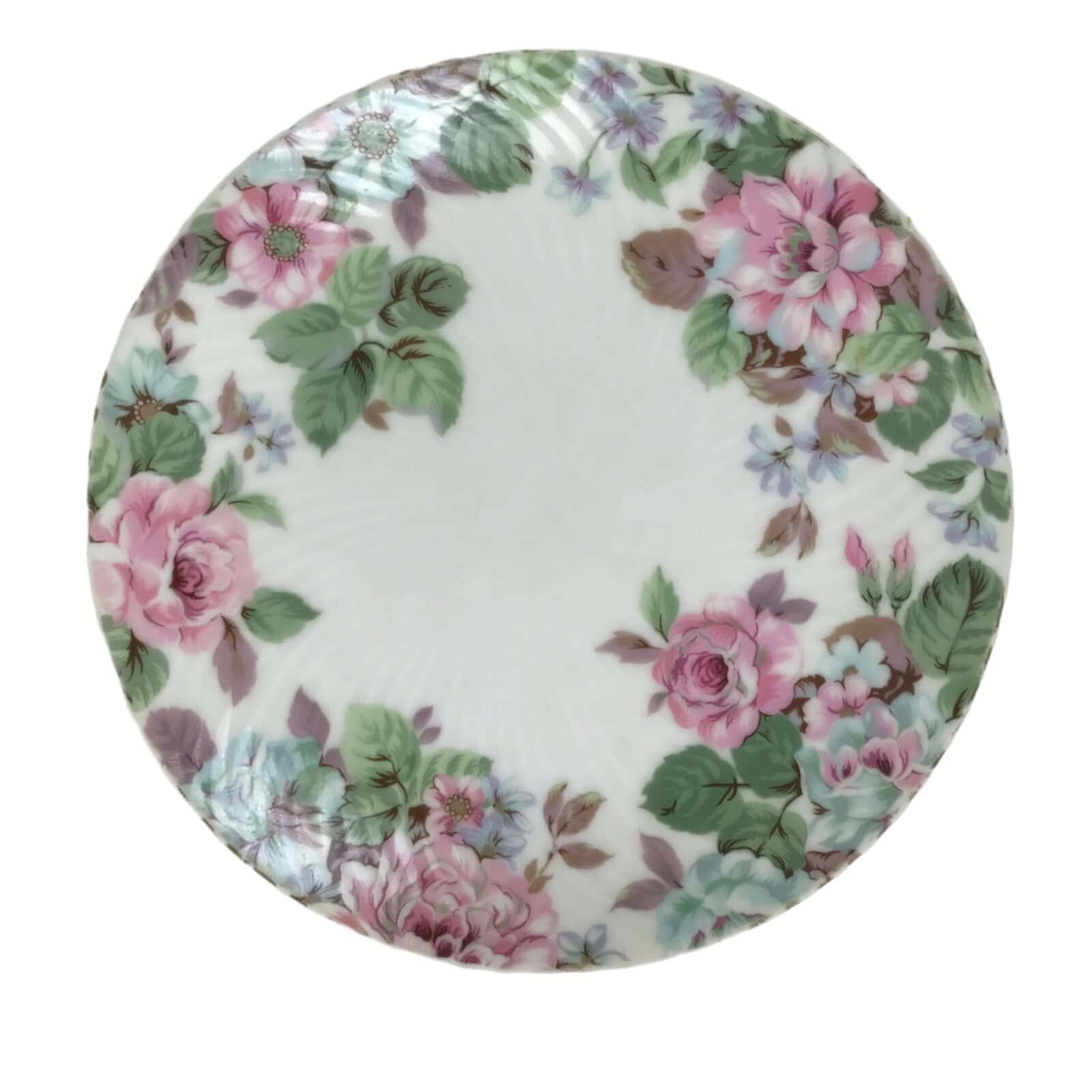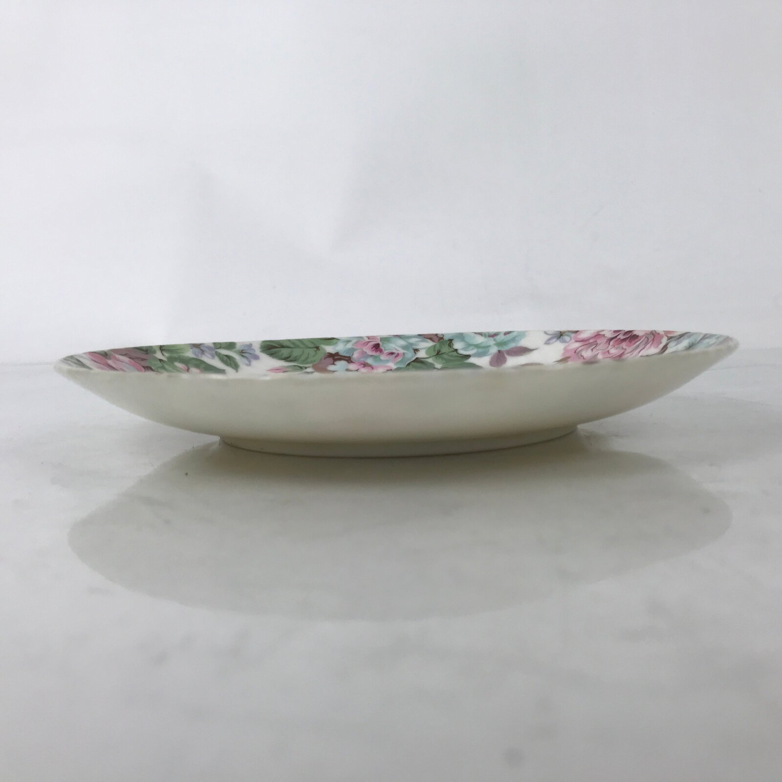 This vintage Japanese medium porcelain plate has a pink floral design with green leaves. It is round with little depth and slightly textured on the front side. This size plate is called chuzara and is good for serving side dishes, some sweets, and so on. The bottom sign Utsuwakan means a house of vessels in Japanese.