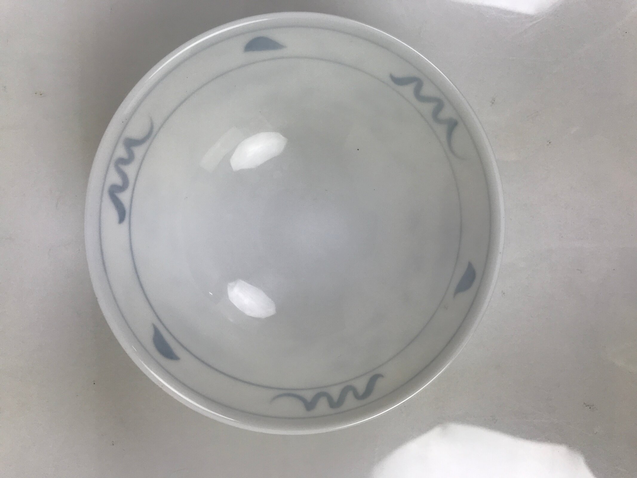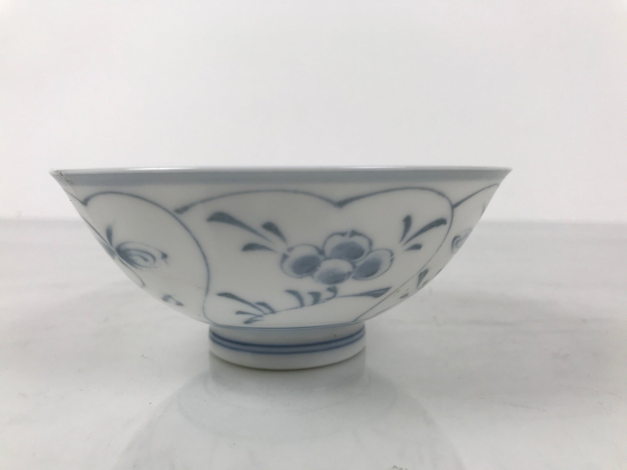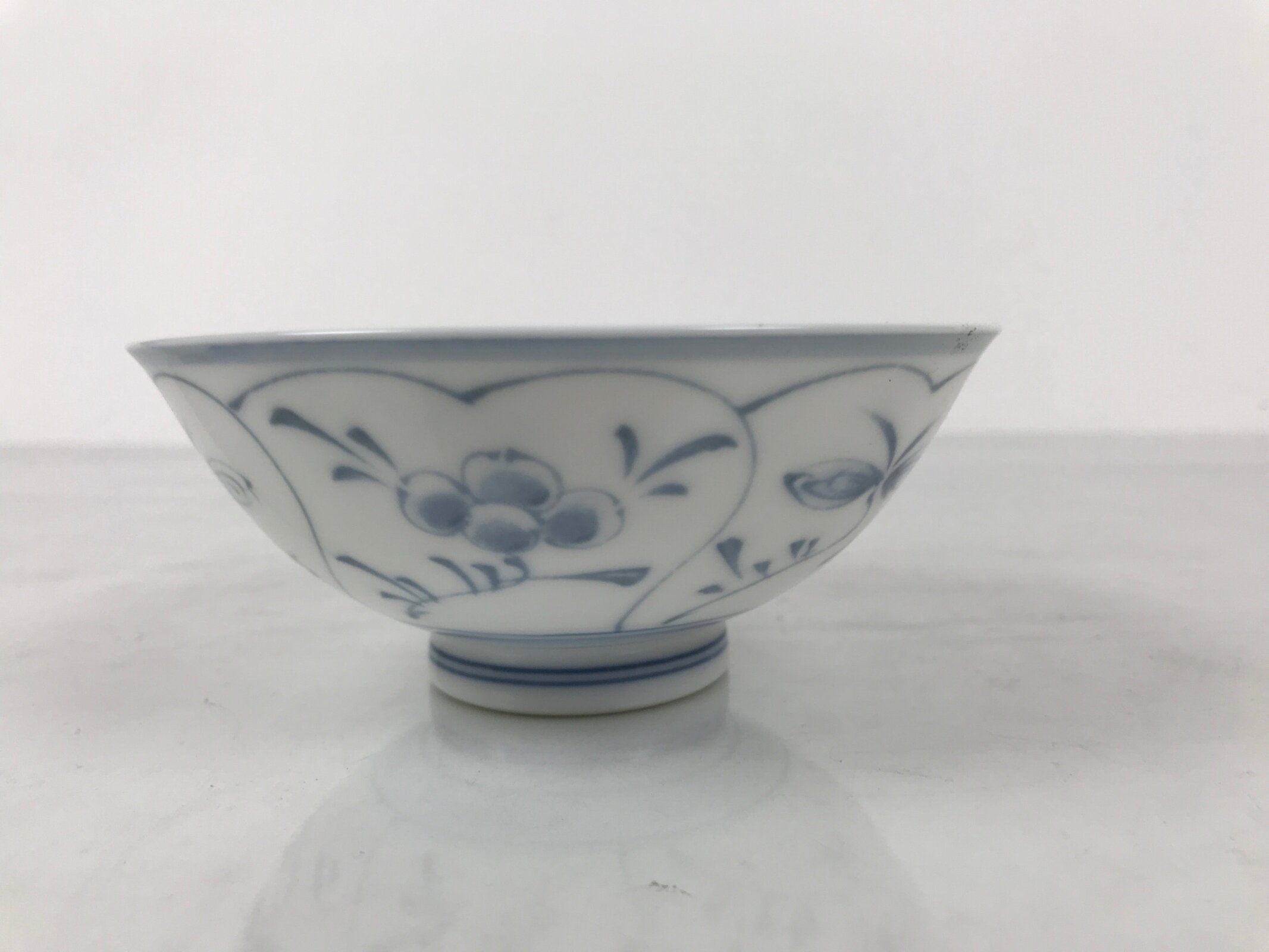 This item is a vintage Japanese Mino Ware porcelain rice bowl. This wide-mouthed small bowl is white with a blue design commonly known as “Shepard’s Purse” that contains leaves, vines, and clusters of seeds. It can also be used for side dishes or as a chawan for drinking tea. Rice bowls are made to be lightweight and held in one hand (thumb on rim, other fingers on foot).