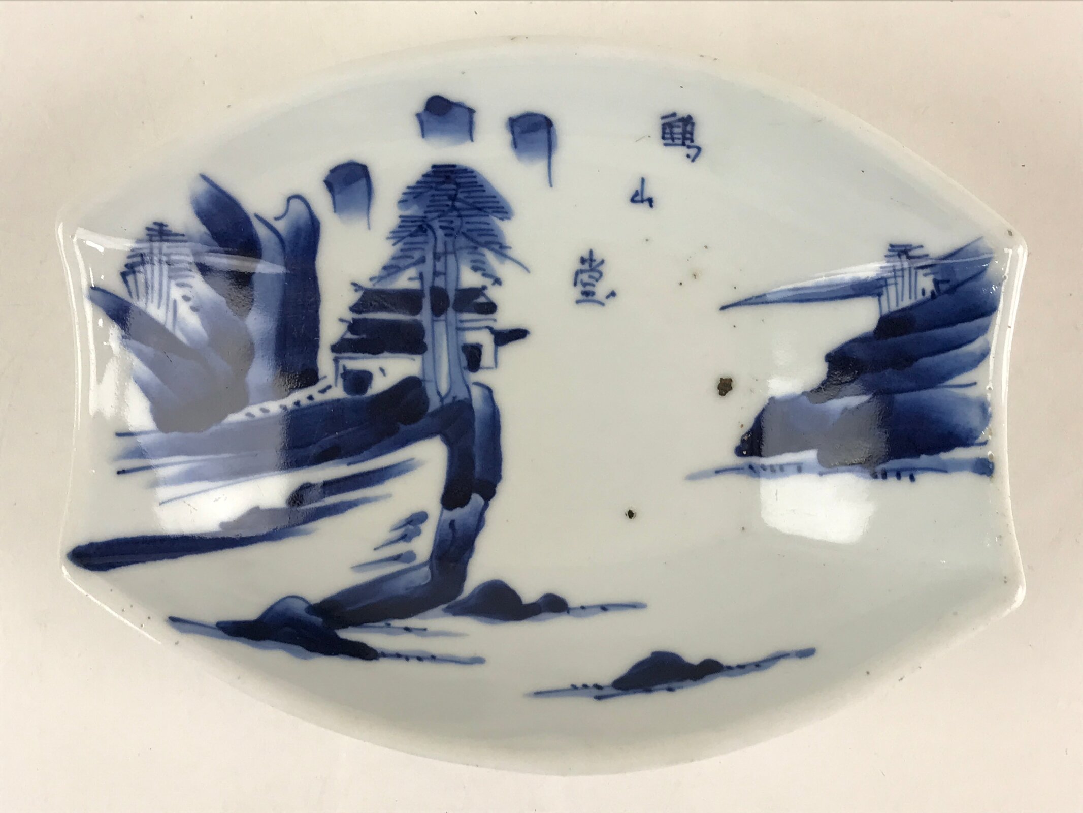 This is a Japanese vintage porcelain small plate Kozara. This is a boat-shaped plate. It is written in kanji characters as Kakuzan-do and has a picture of mountains and valleys Sansui. There are sesame spots (Goma) and dust marks. Sesame and dust marks are spots where ash falls when baked in a kiln.
