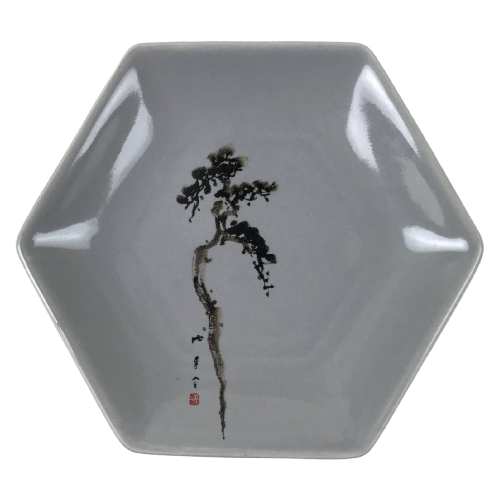 This vintage Japanese small hexagonal plate is made of porcelain and has a smooth gray glaze. The overall design features a black printed pine tree. This type of plate is called meimeizara and is the perfect size to serve wagashi, traditional Japanese sweets. It also serves as a plate for side dishes in a Japanese meal set.