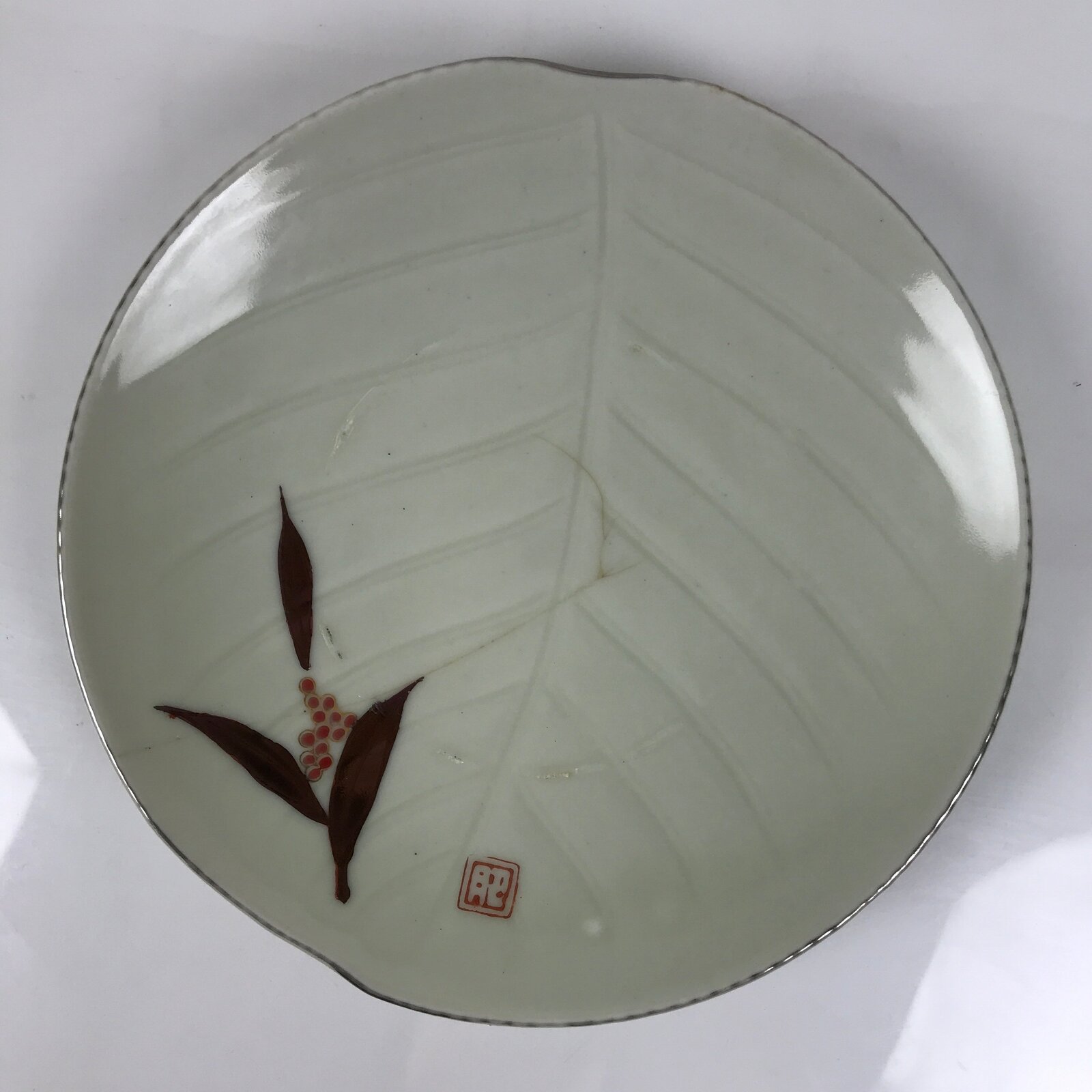 This is a vintage Japanese porcelain plate. This round, small-sized plate, also called sara or kozara, features brown, red, and gold nanten (sacred bamboo). The plate itself has a leaf-like shape with veins. There is a red seal.