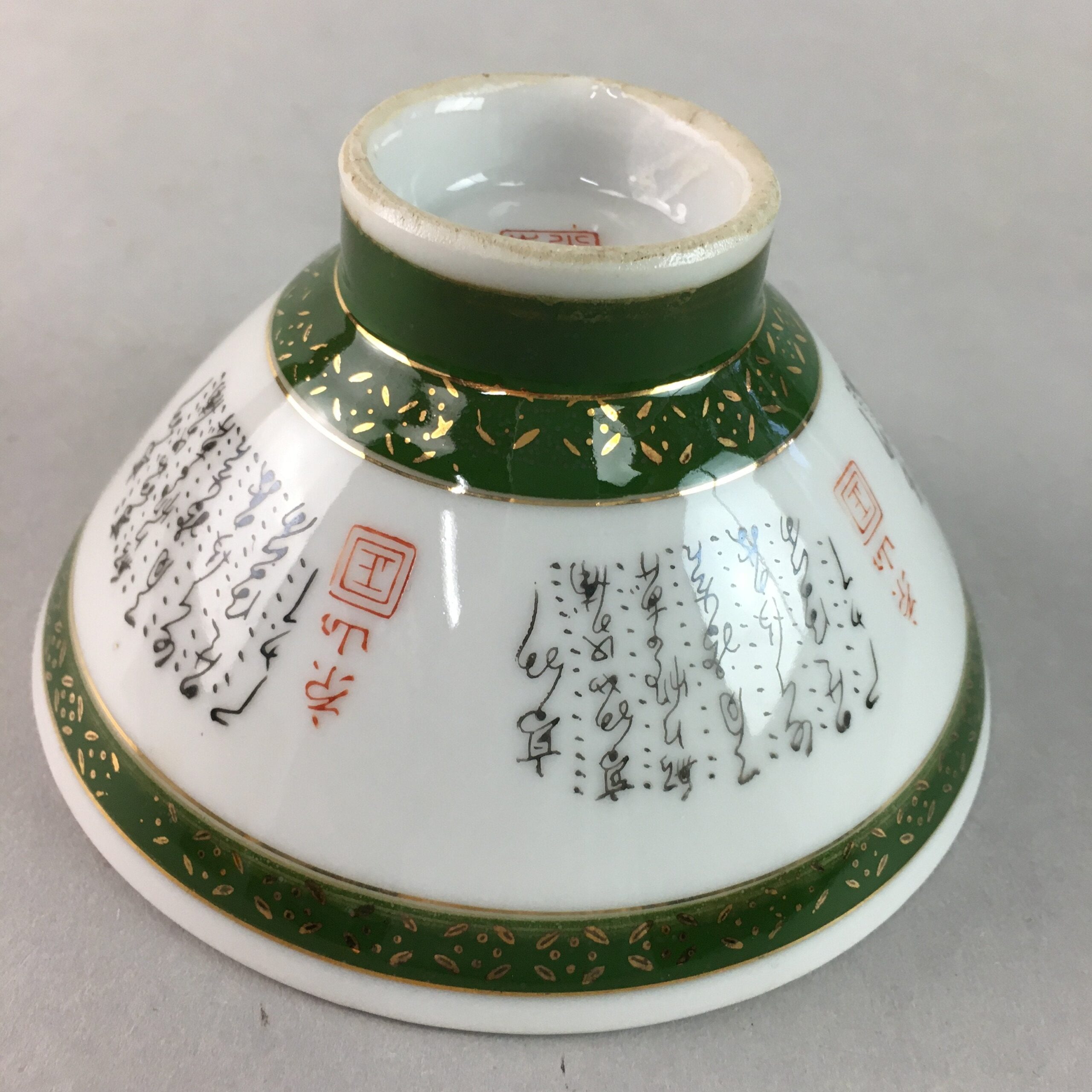 Japanese Porcelain Rice Bowl Vtg Kanji Green Gold Chawan PP170