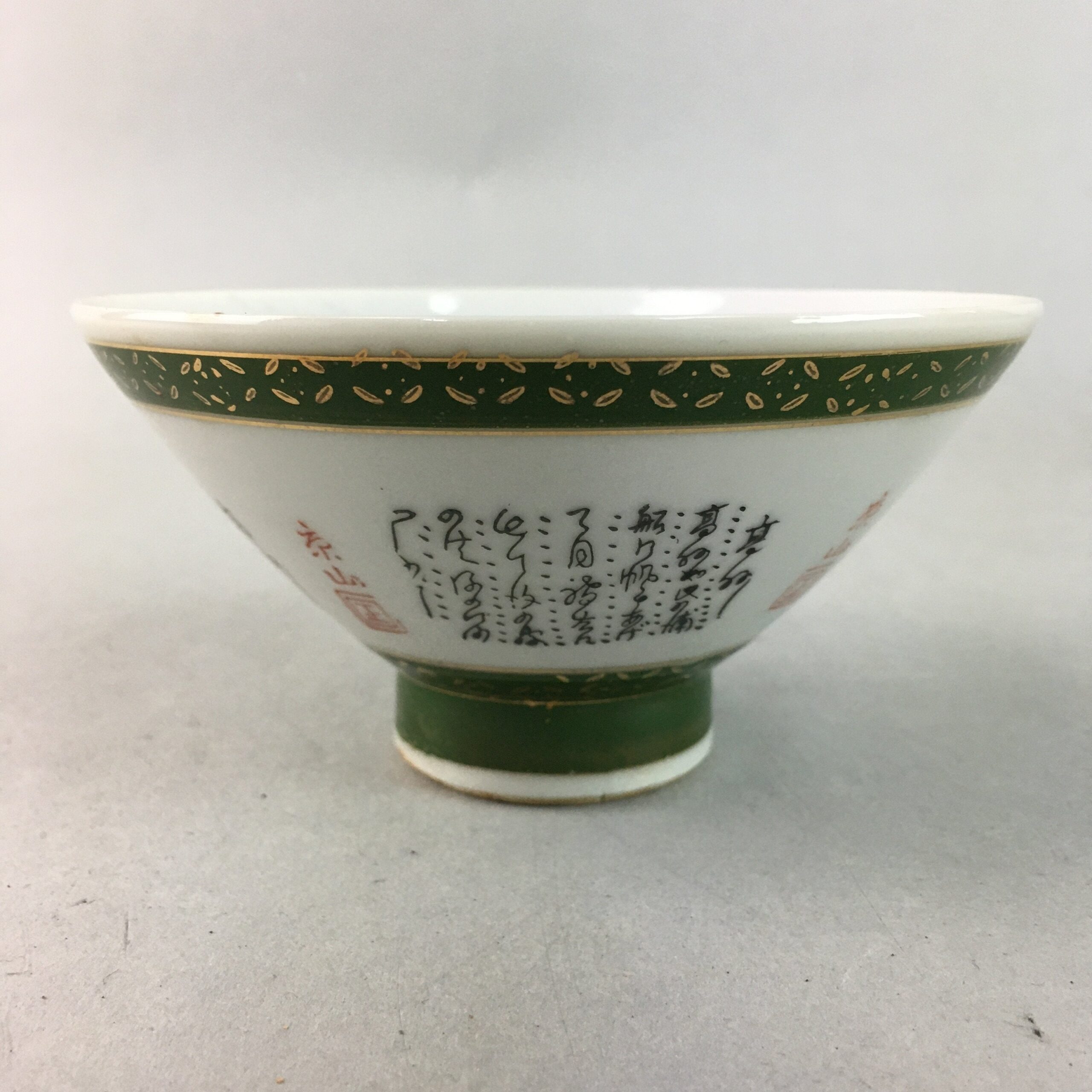 Japanese Porcelain Rice Bowl Vtg Kanji Green Gold Chawan PP178