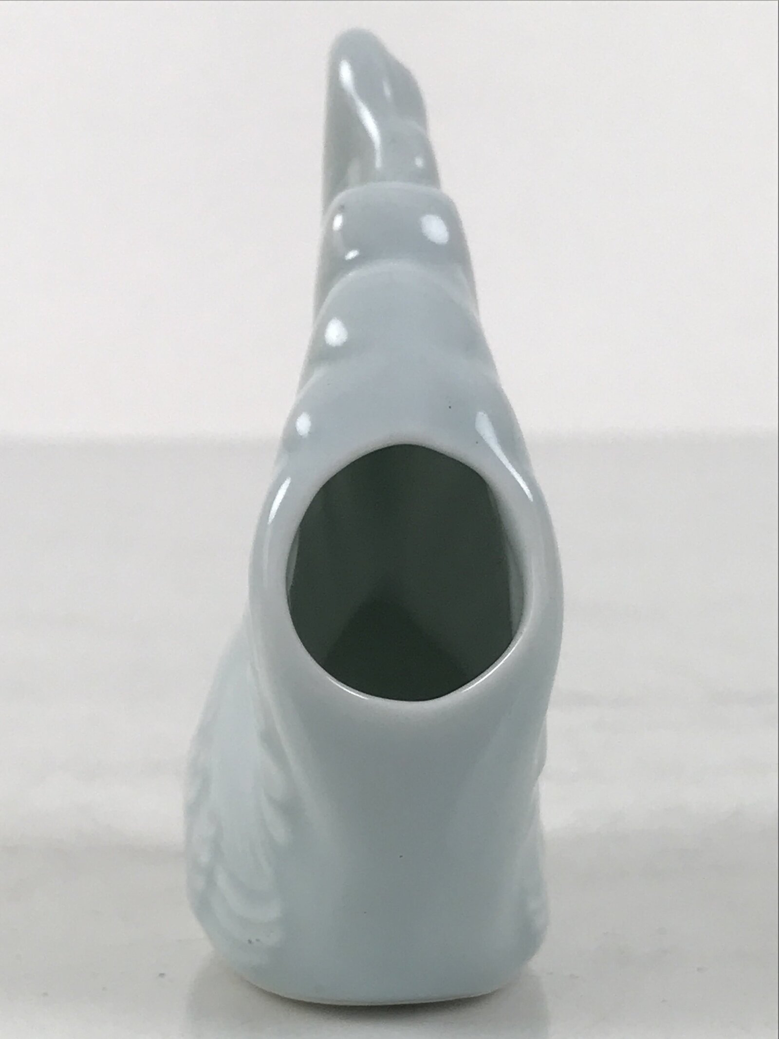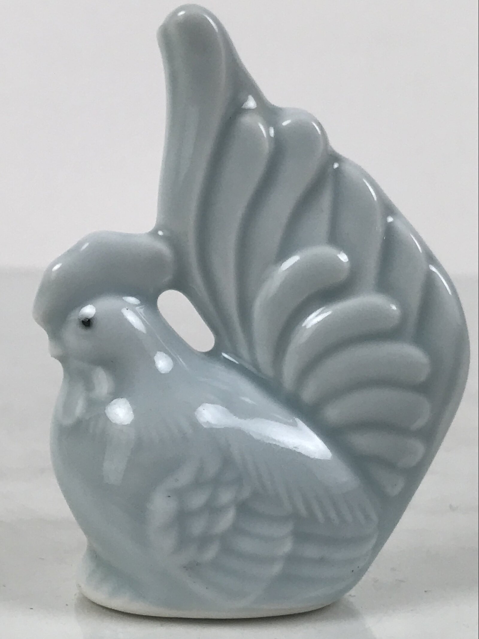 This is a vintage Japanese porcelain toothpick holder, also called youjitate. Glazed a soft light blue color, it is in the shape of a rooster, one of the zodiac animals. It has subtle details, and has an open hole at the back of the tail feathers for storing toothpicks.