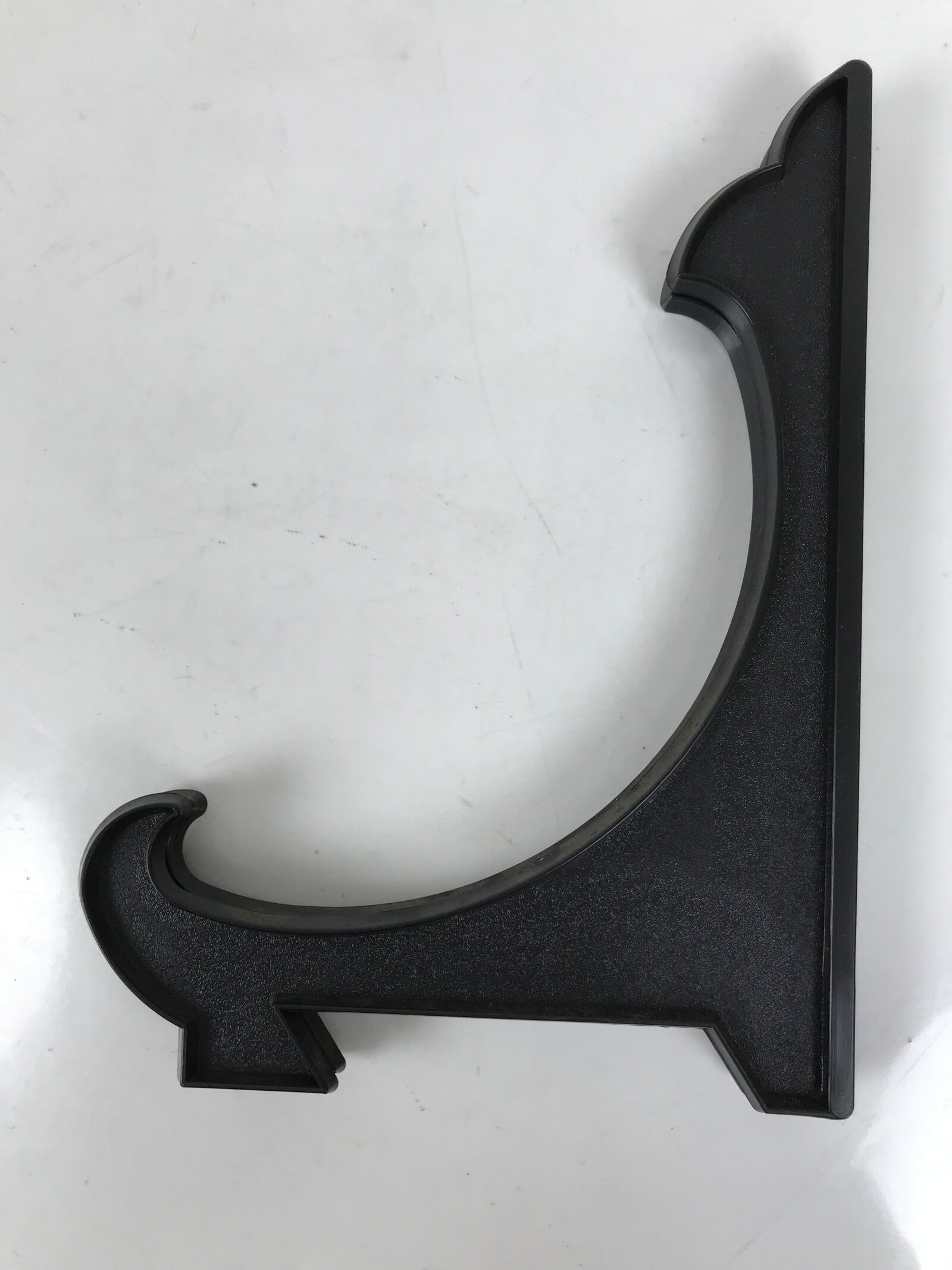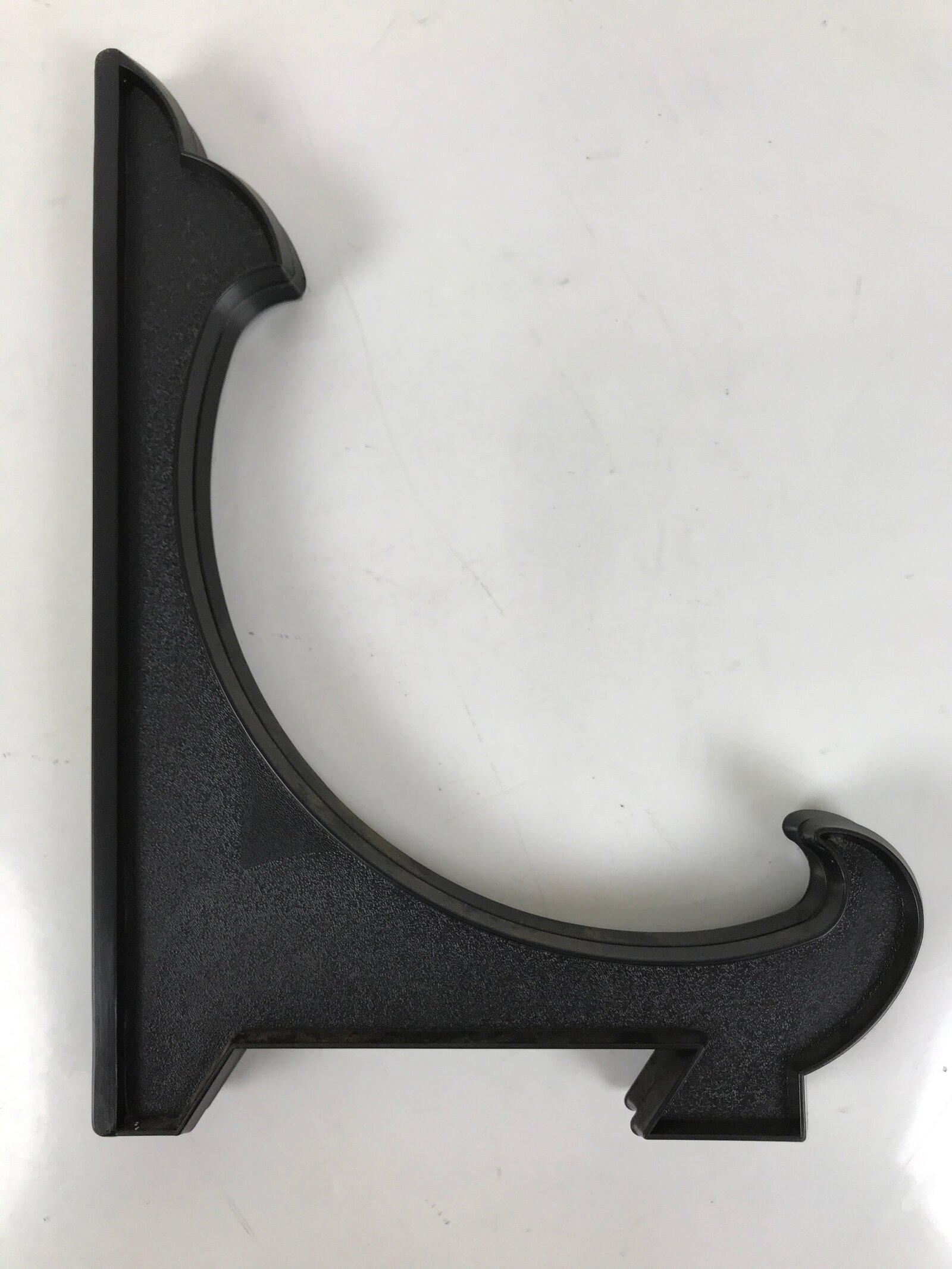 This is a vintage Japanese decorative porcelain plate. This large round plate (ozara) is blue, white, and orange with a detailed image of gray carp and orange and white koi swimming in water between pine trees and full-bloom chrysanthemums. The border is simply brown. This plate comes with a black resin stand and the original paper box.