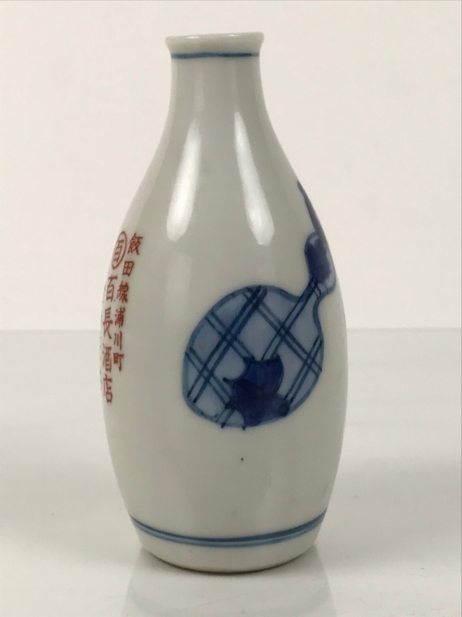 This is a Japanese vintage porcelain sake bottle or Tokkuri. This beautiful sake bottle is white with a blue gourd design and red Kanji letters. Thin blue bands are on the top and bottom. It is a compact size, making it easy to use daily for beverages or as a small flower vase.