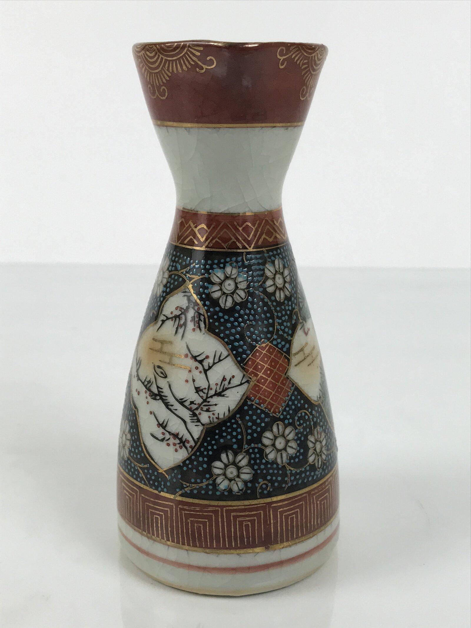 This is a Japanese vintage Kutani porcelain sake bottle or Tokkuri. This beautiful imari sake bottle is fully decorated with hand-painted, intricate gold linework, floral accents, and a raised blue dot pattern. The entire design features the popular shochikubai pattern which consists of pine, plum blossom, and bamboo motifs together. The pattern symbolizes perseverance and renewal . It has the Kutani marking on the bottom.