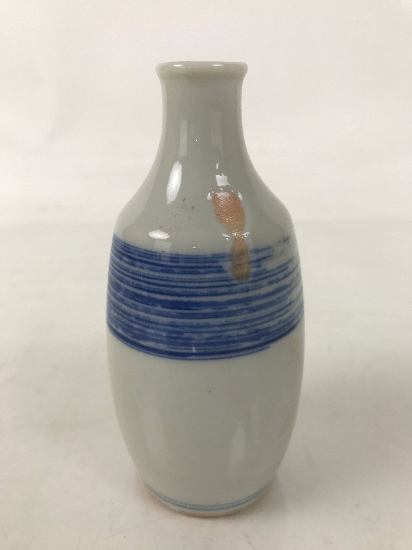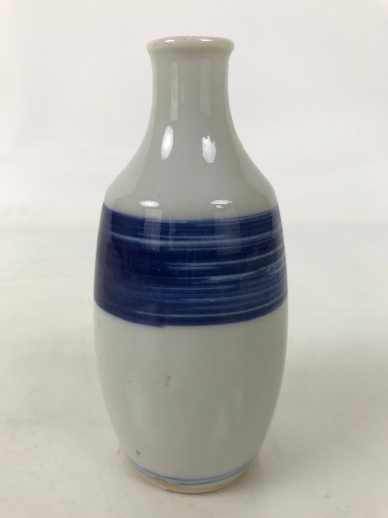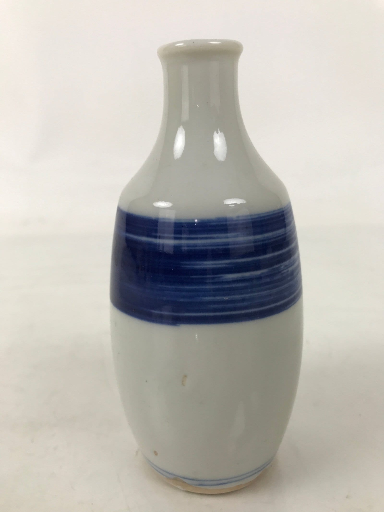 This is a Japanese vintage porcelain sake bottle, or Tokkuri. It is white and vibrant blue in a sometsuke design that features a wide brush stroke circling the middle with two small bands of blue on the bottom. Its compact size makes it easy to use daily for beverages or as a small flower vase.