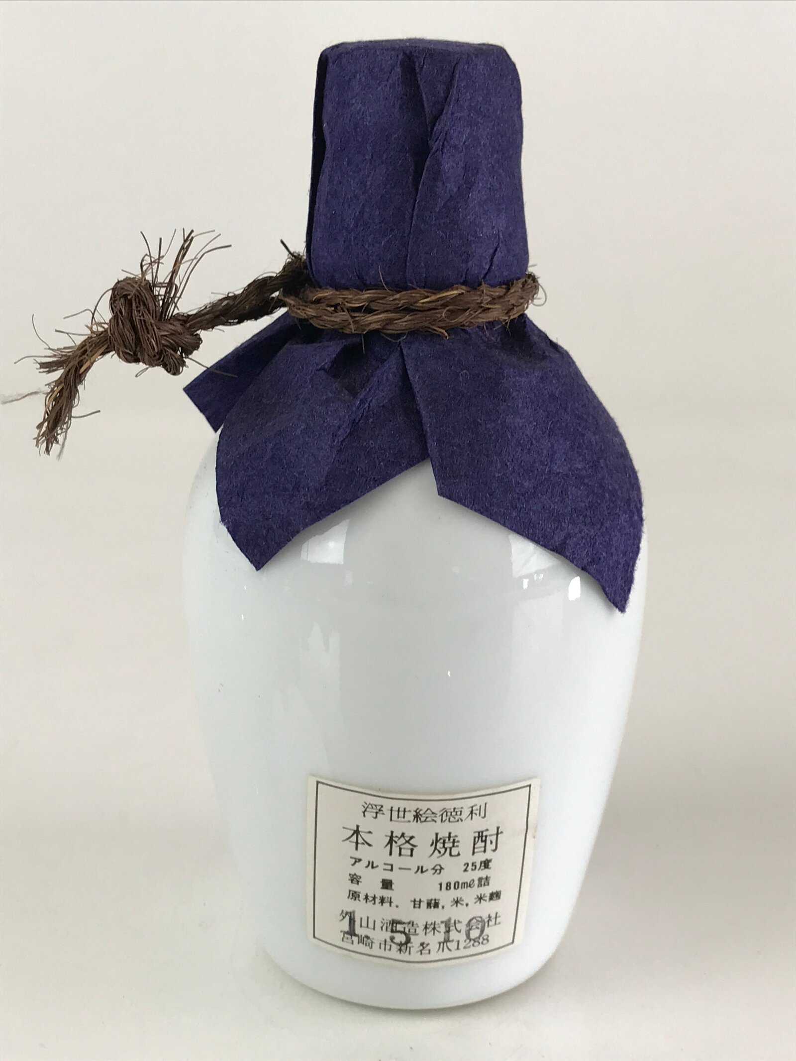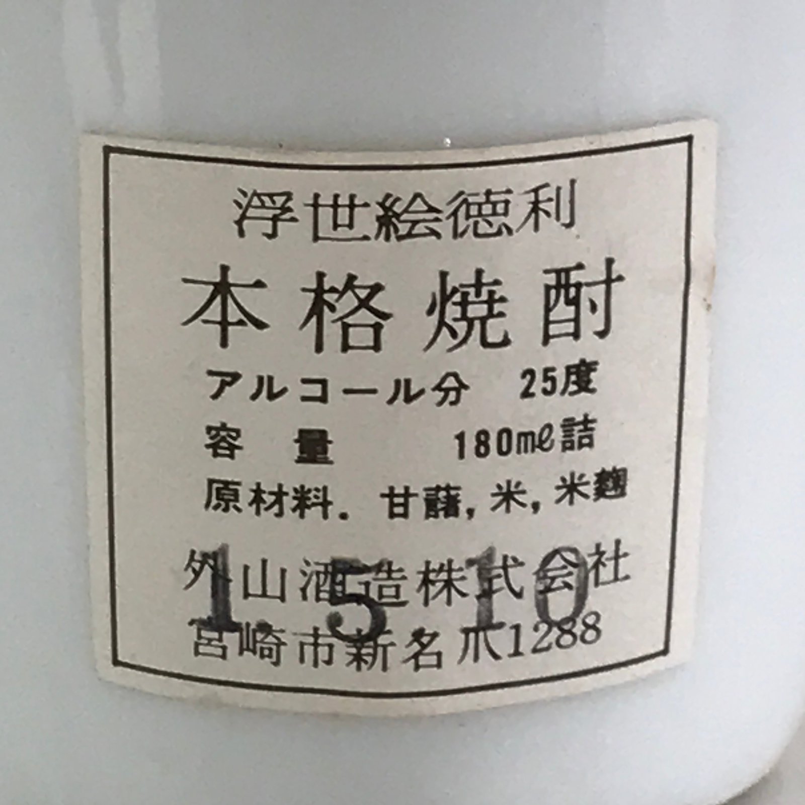 - Sticker on the bottle: ukiyo-e Sake, 25 alcohol, 180 ml, company address, 15.10