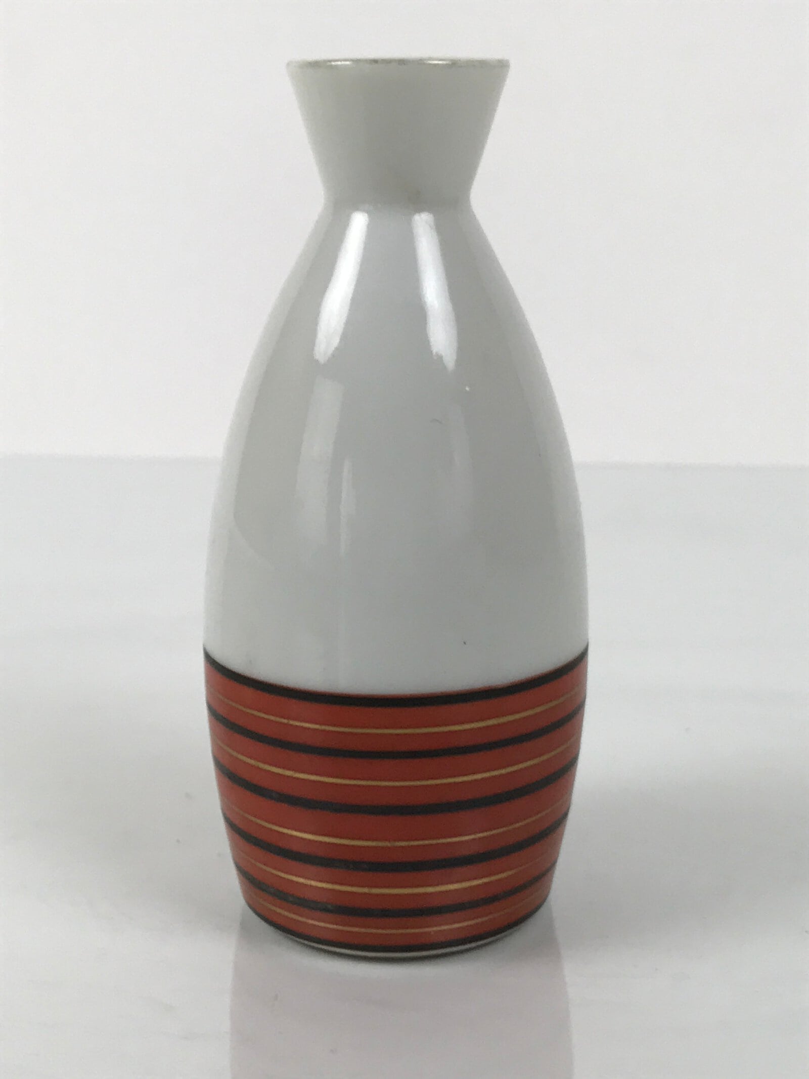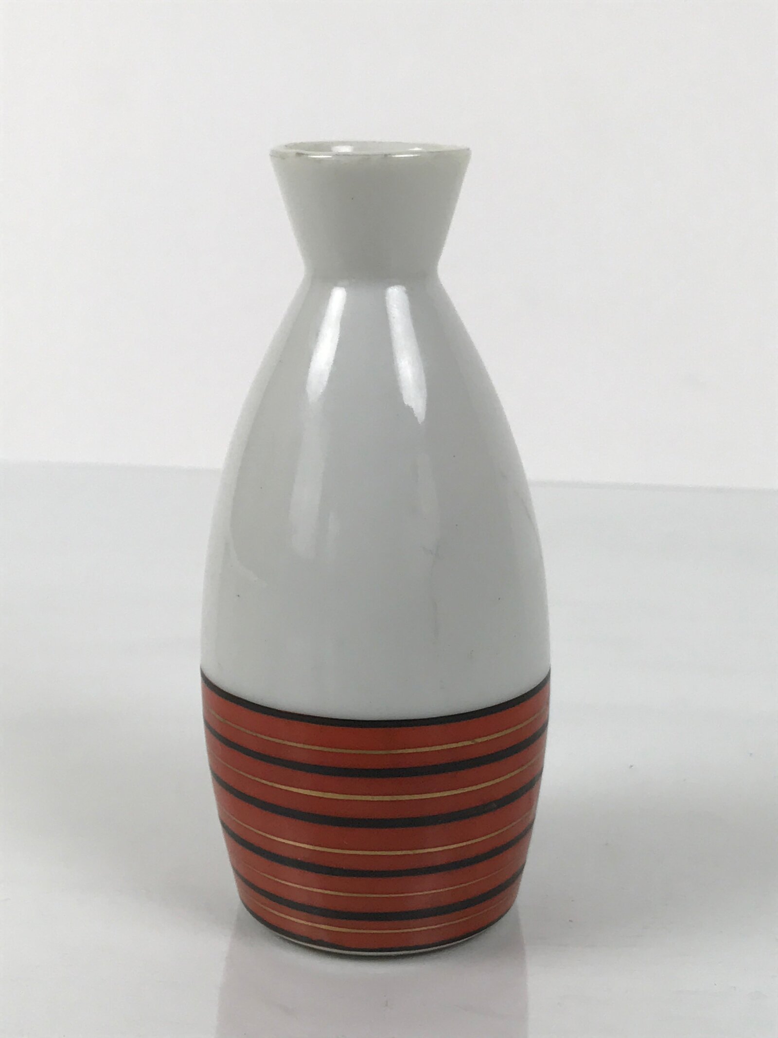 This is a Japanese vintage Kutani porcelain sake bottle or Tokkuri. This beautiful sake bottle is solid white on the top half, while the bottom is a combination of red, gold, and black bands of lines. It is a compact size with a generous volume (roughly ichi-go), making it easy to use daily for beverages or as a small flower vase.