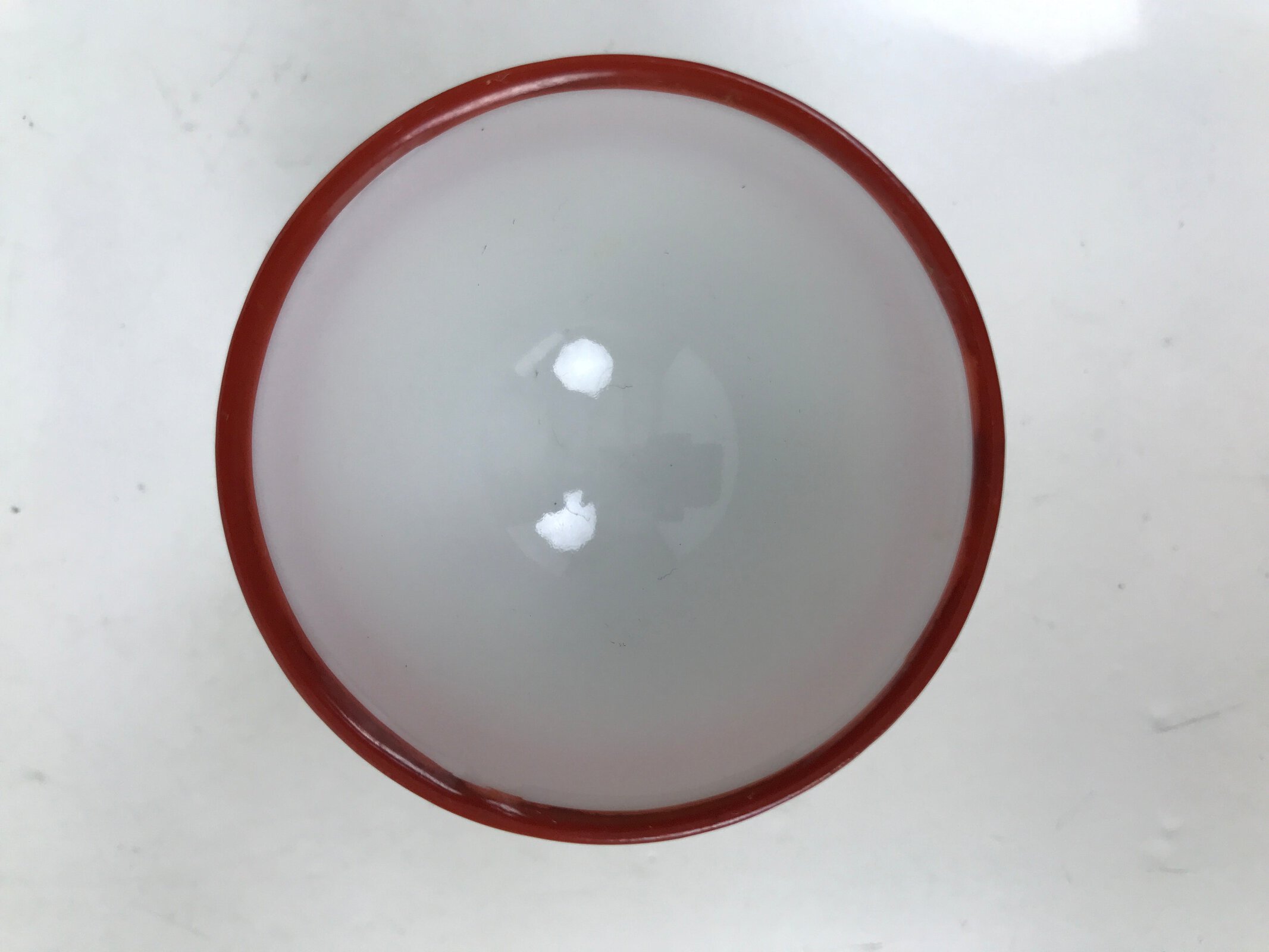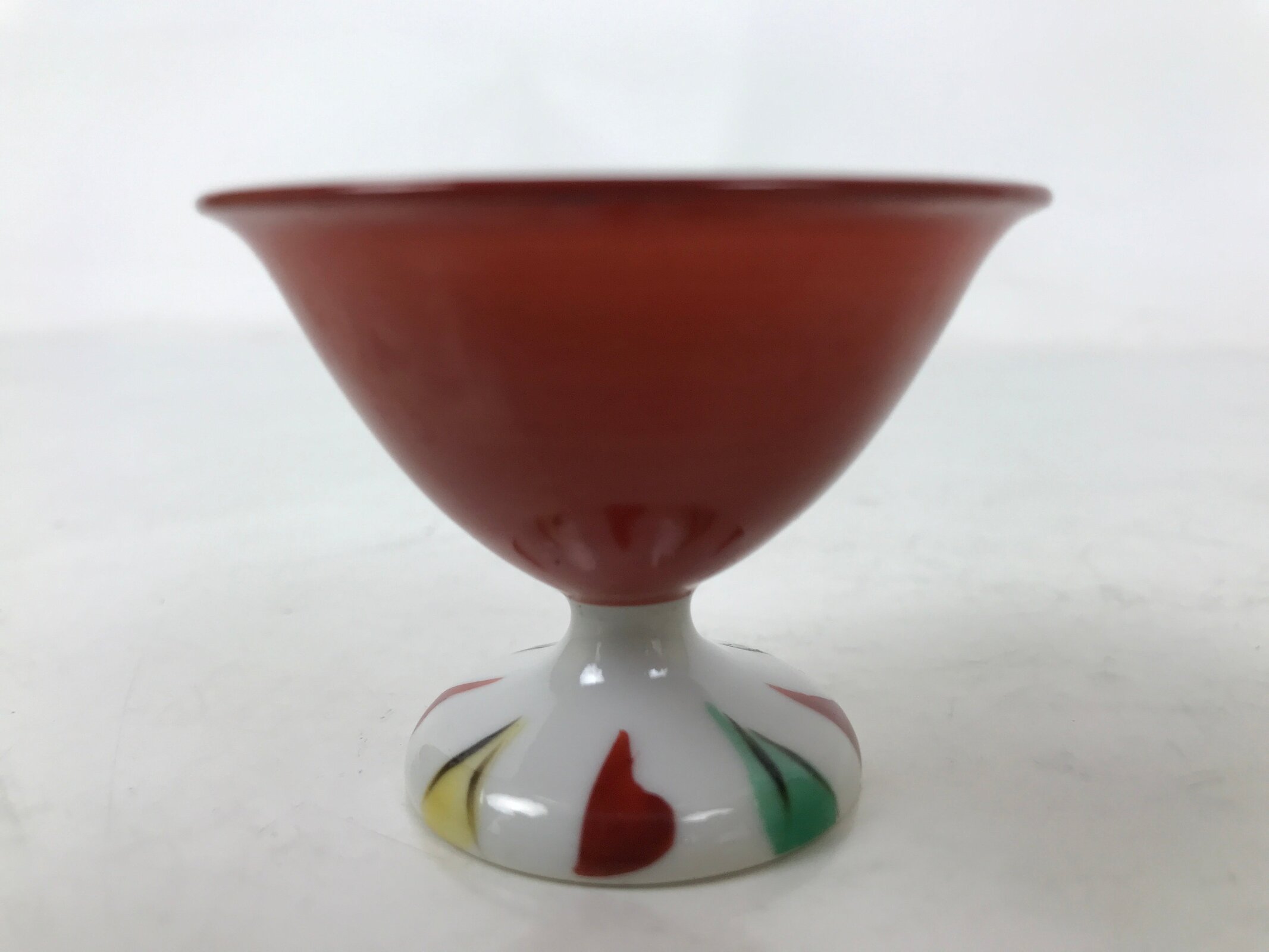 This is a vintage Japanese porcelain sake cup. This particular type of cup is called wan or “bowl type” due to its resemblance to a rice or tea bowl. In terms of size, it is also called ochoko. This footed cup is a combination of red and white with green and yellow accents on the foot.